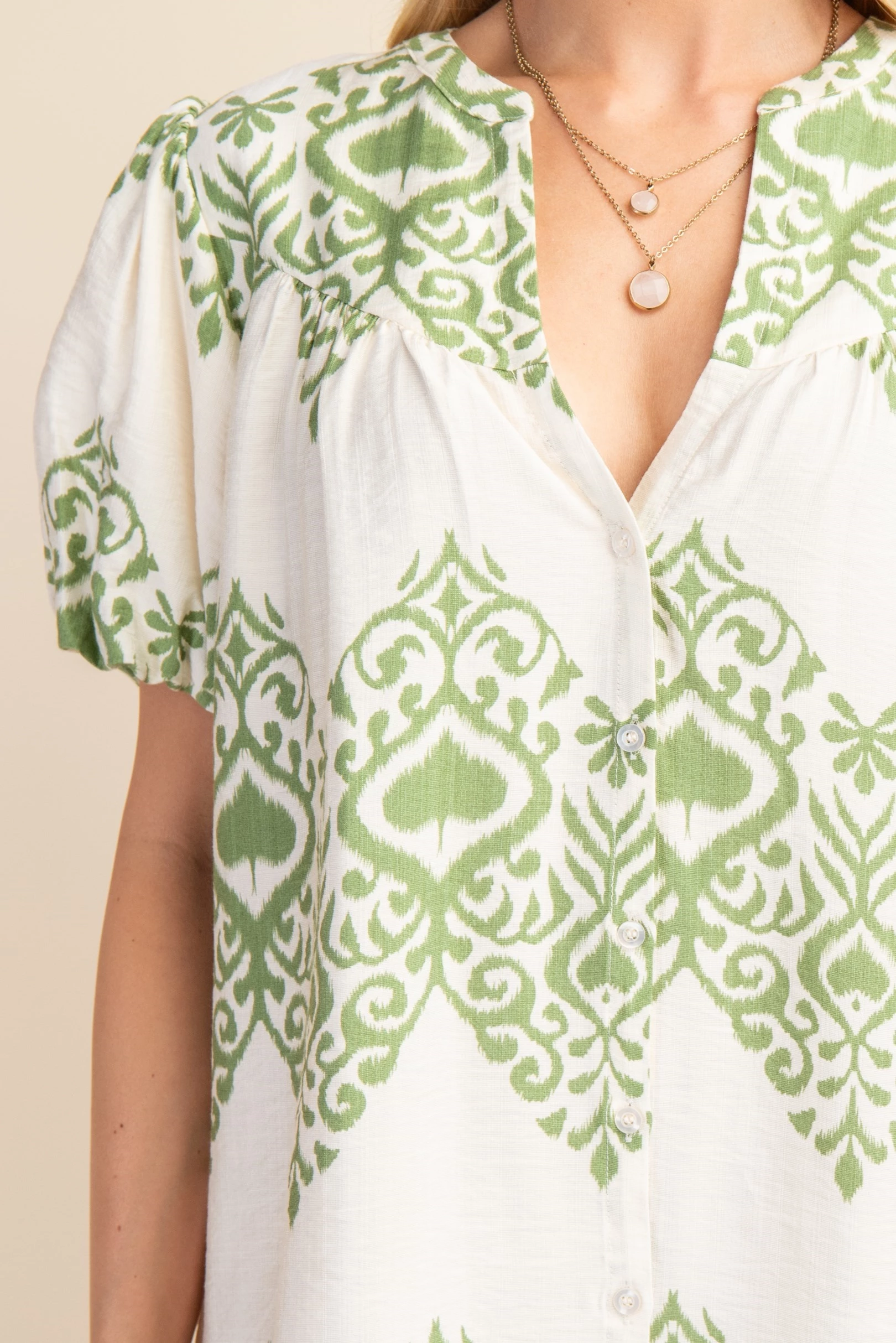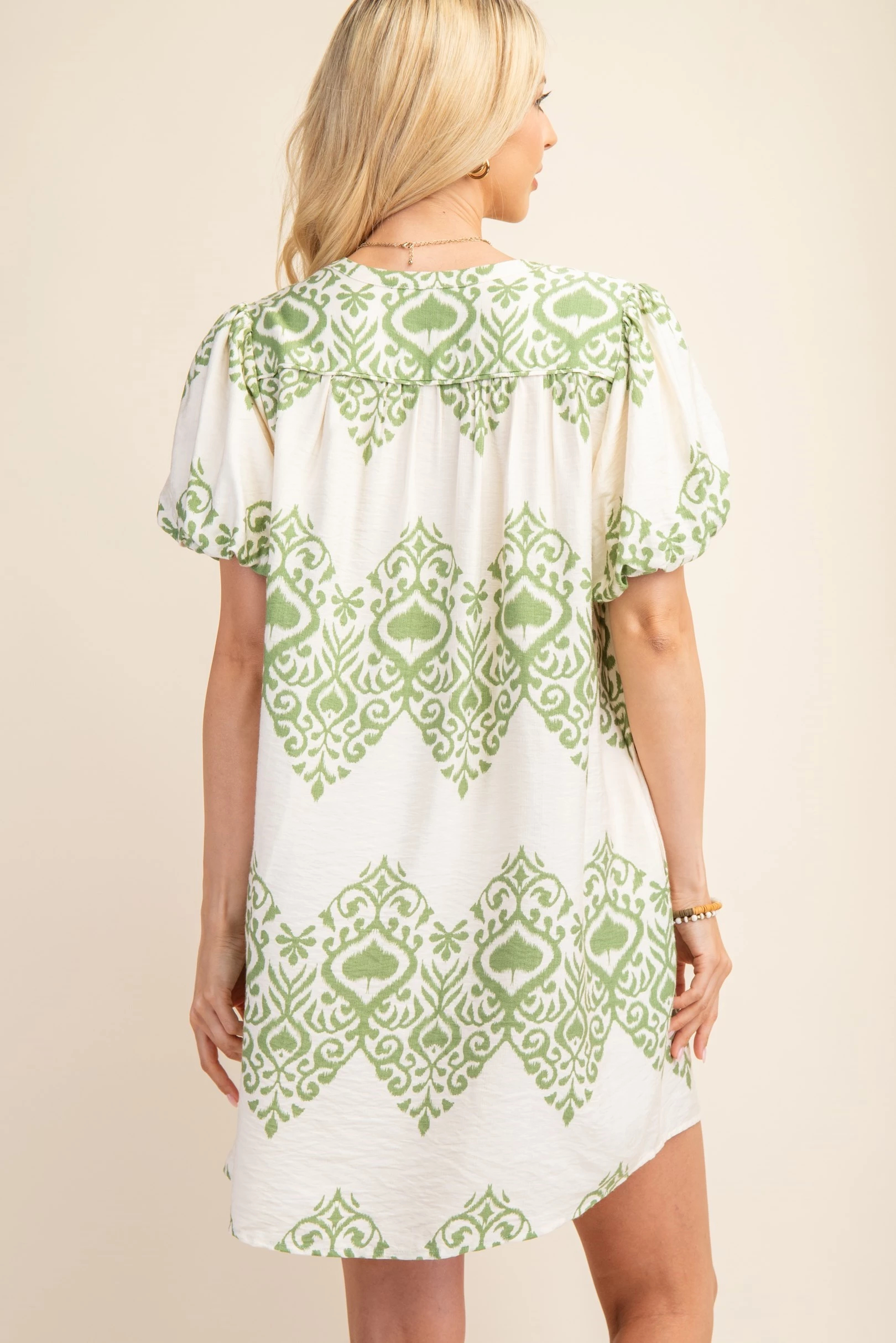 Printed Button Down Mini Dress with Puff Short Sleeves and Side Pockets