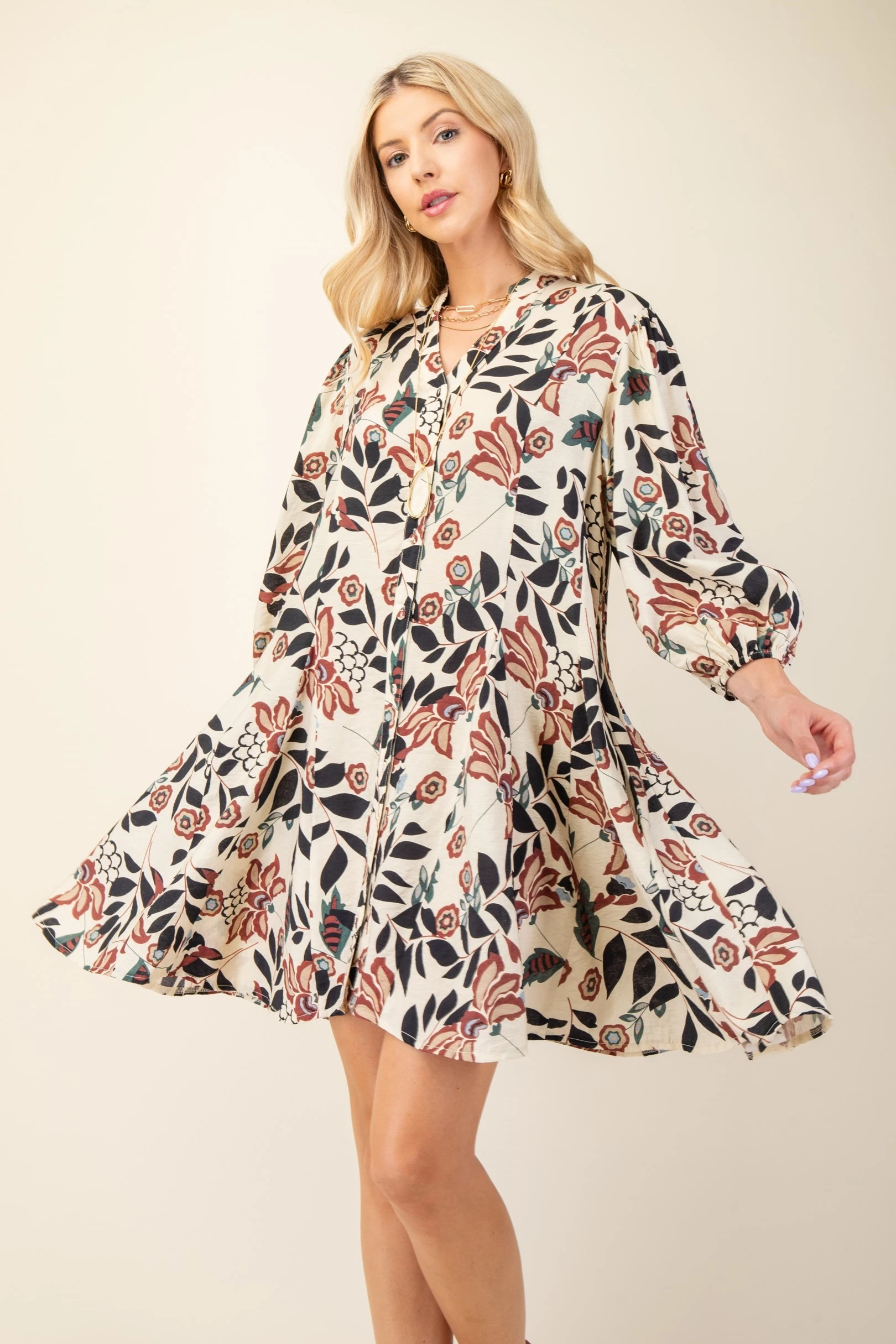 Floral Printed 3/4 Sleeve Shirt Dress with Flared Skirt
