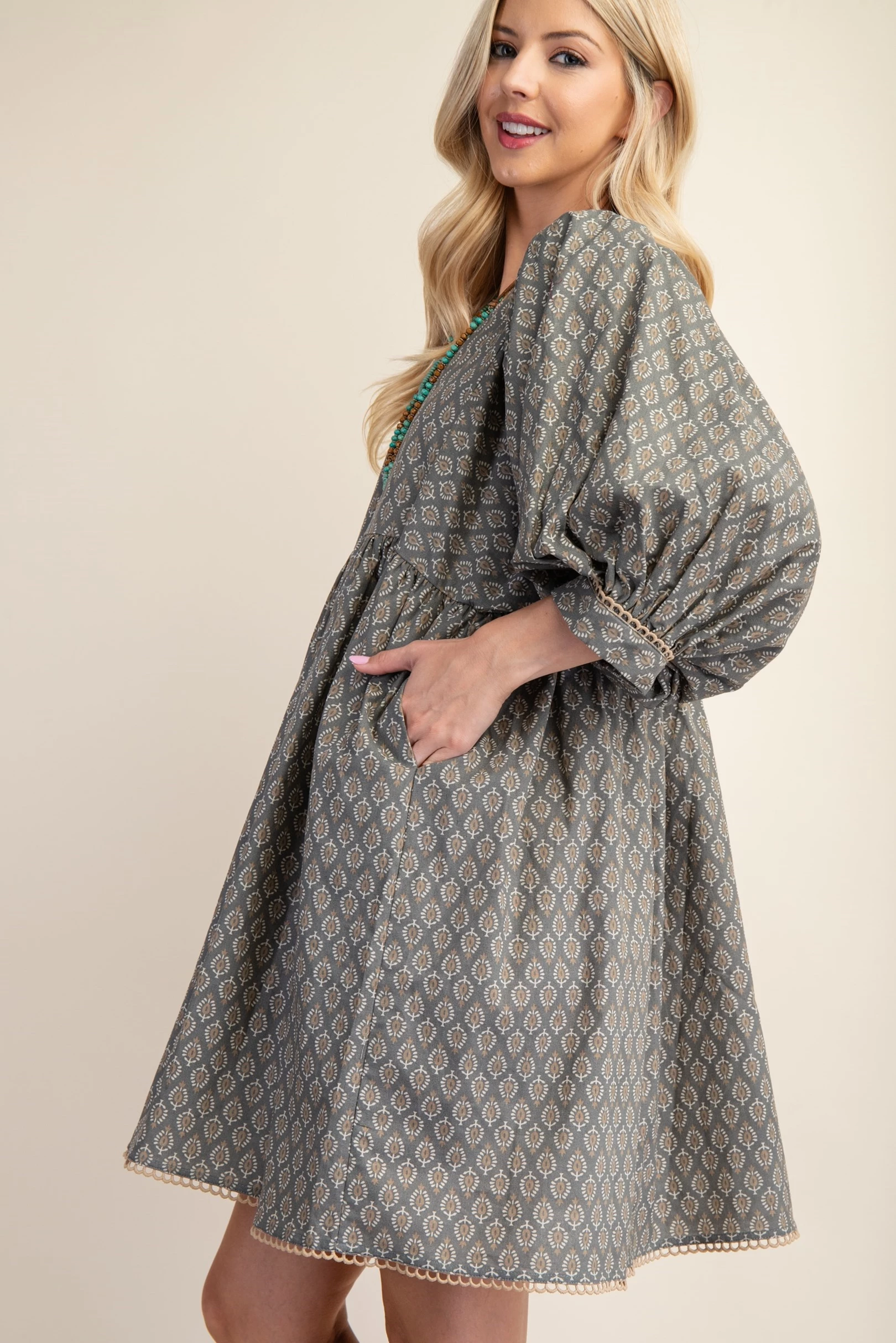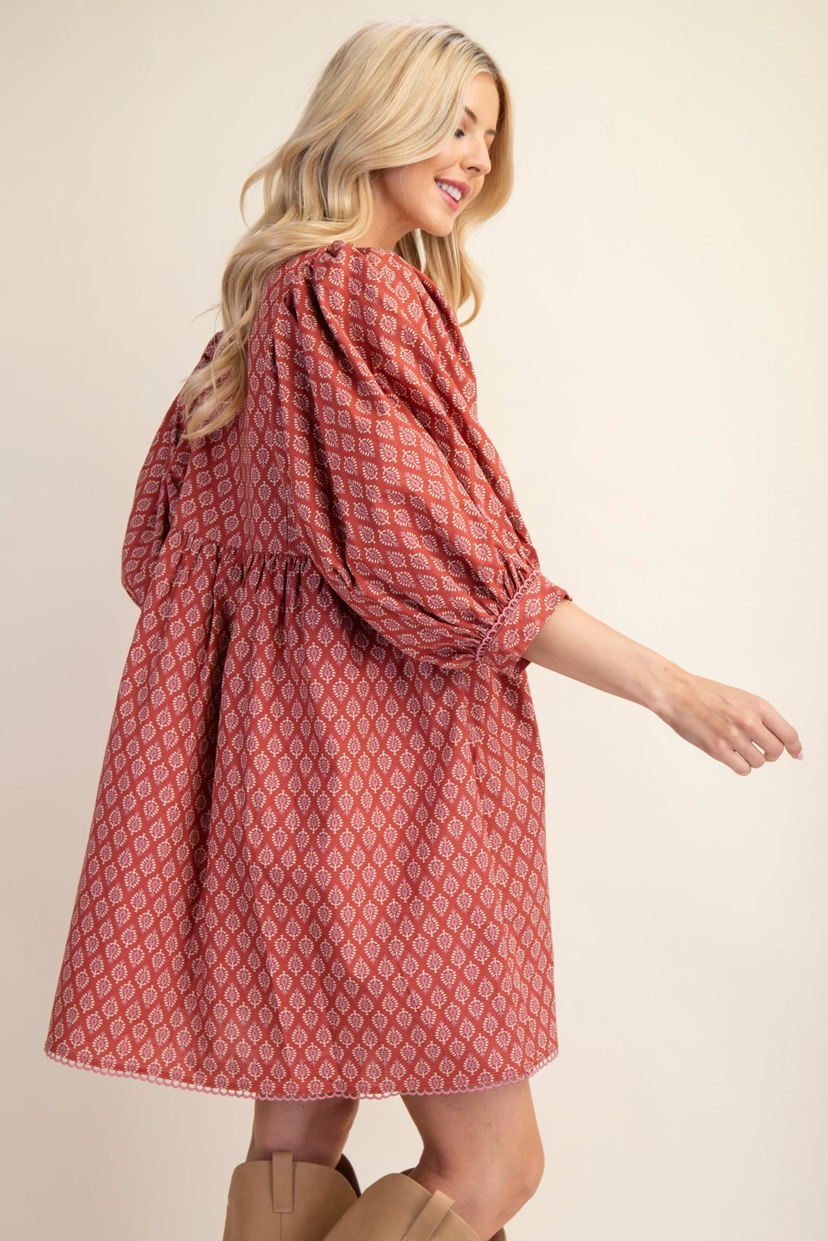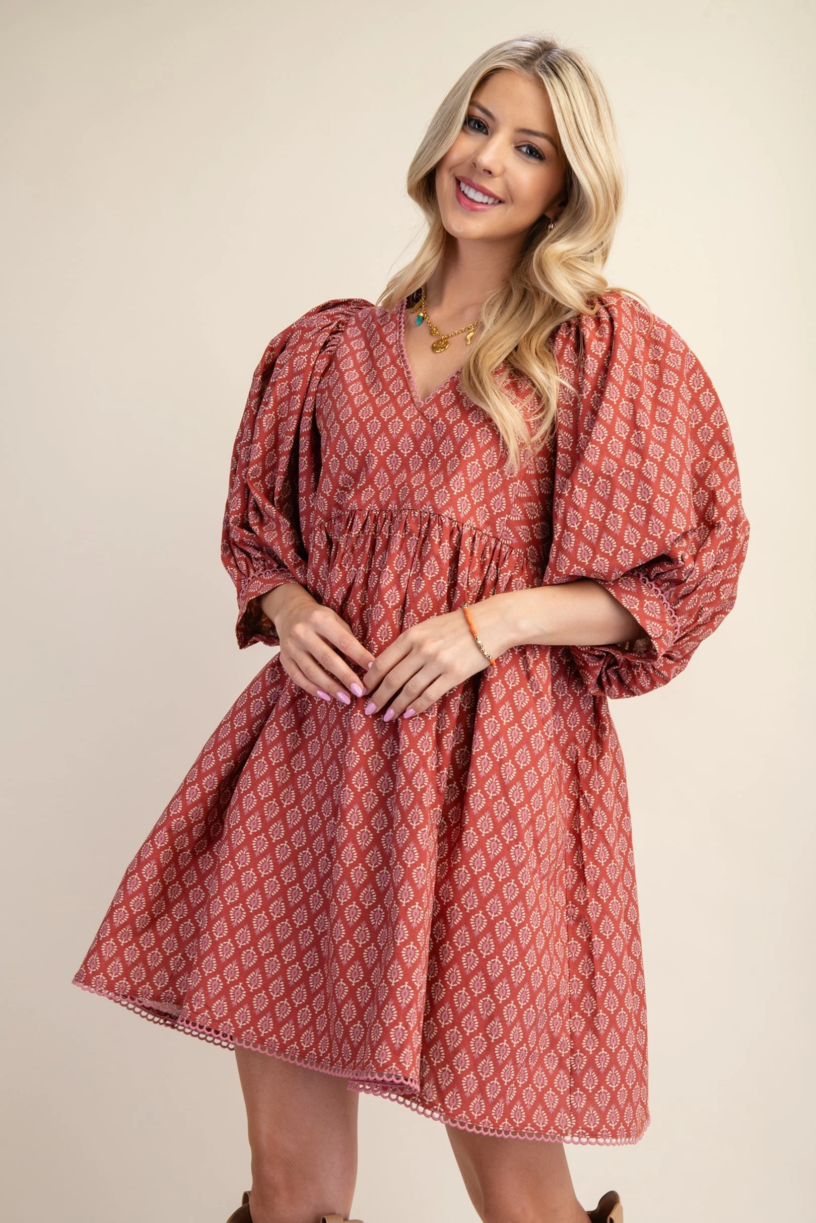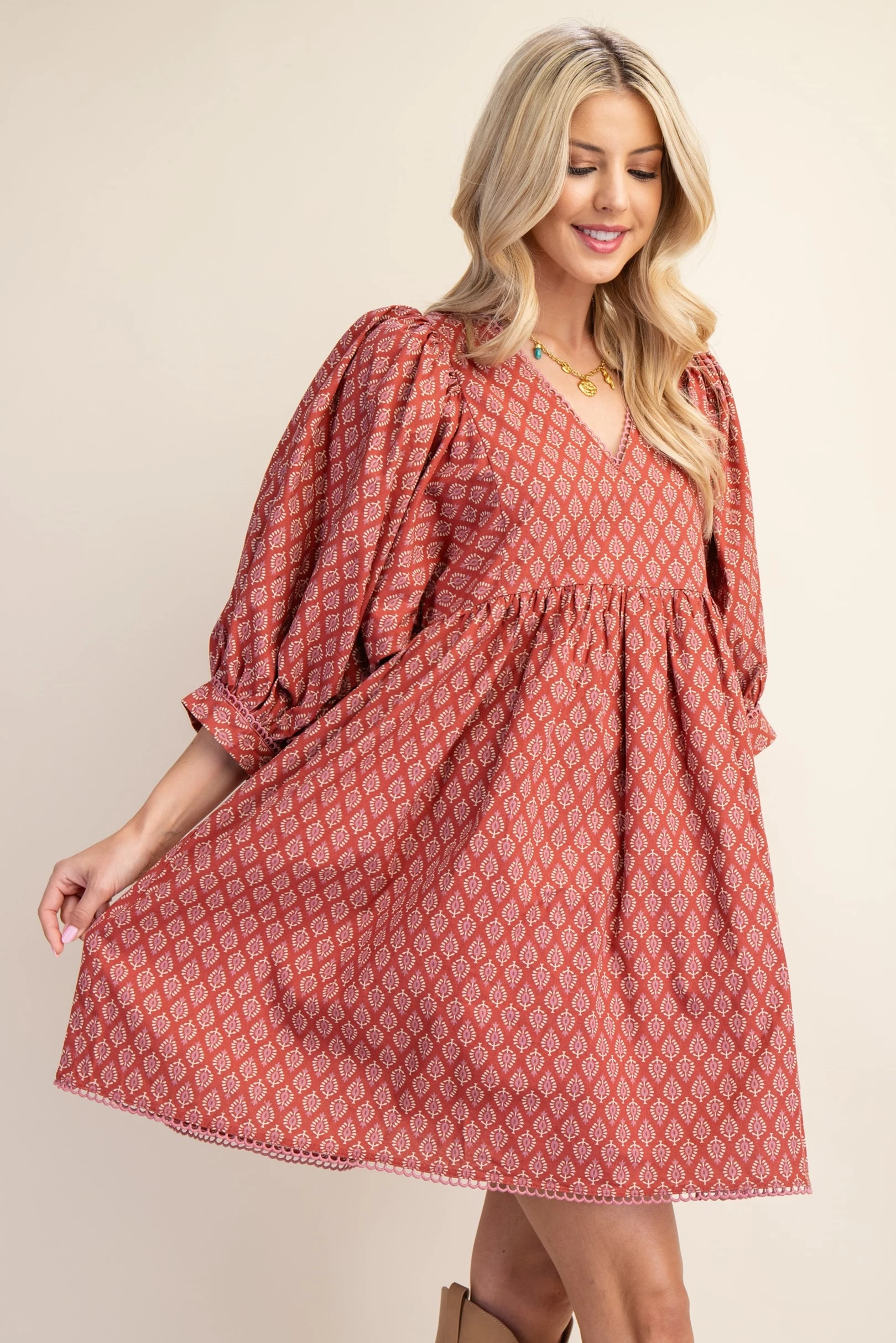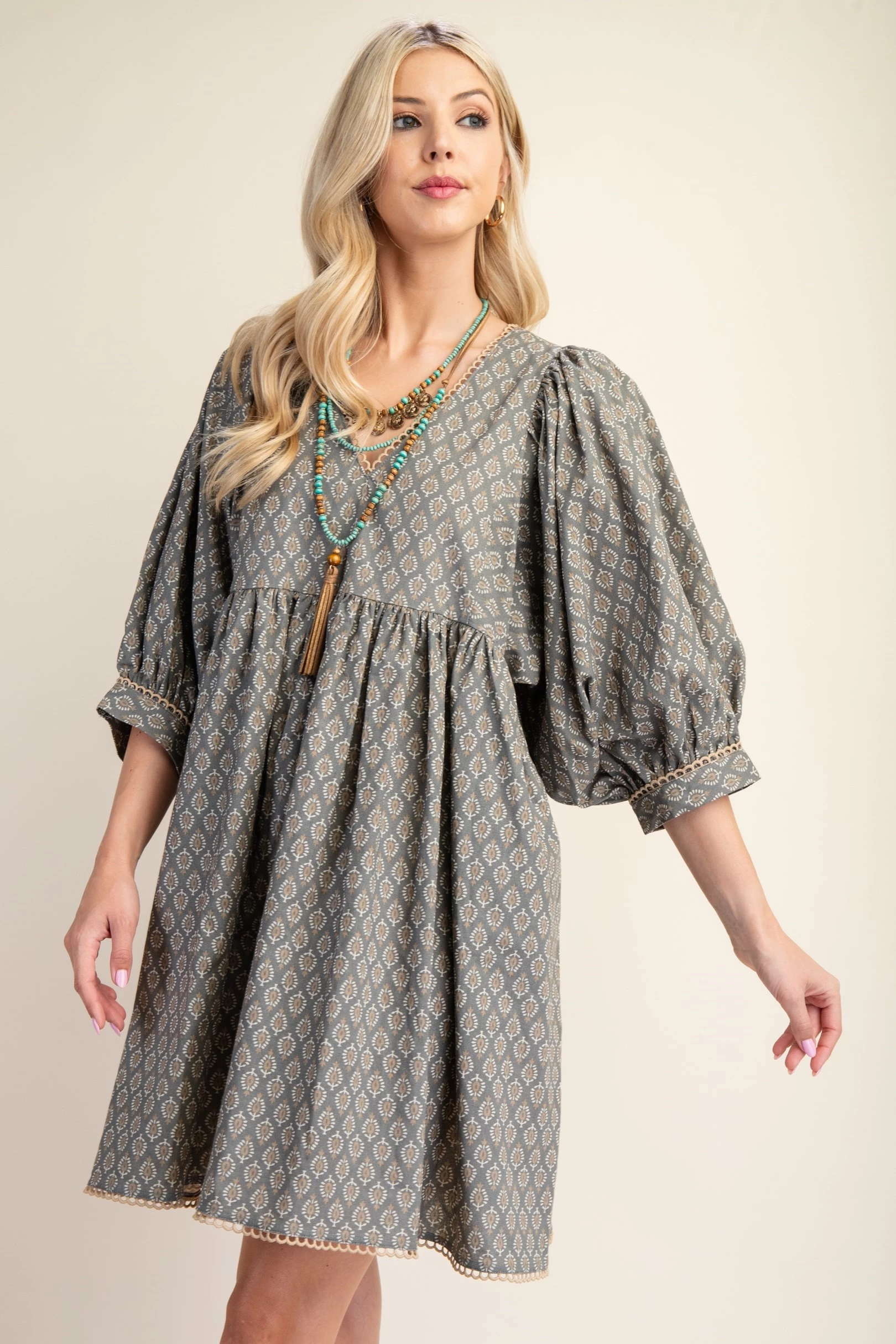 Printed Mini Babydoll Dress with Puff Sleeves and a Lace Trim