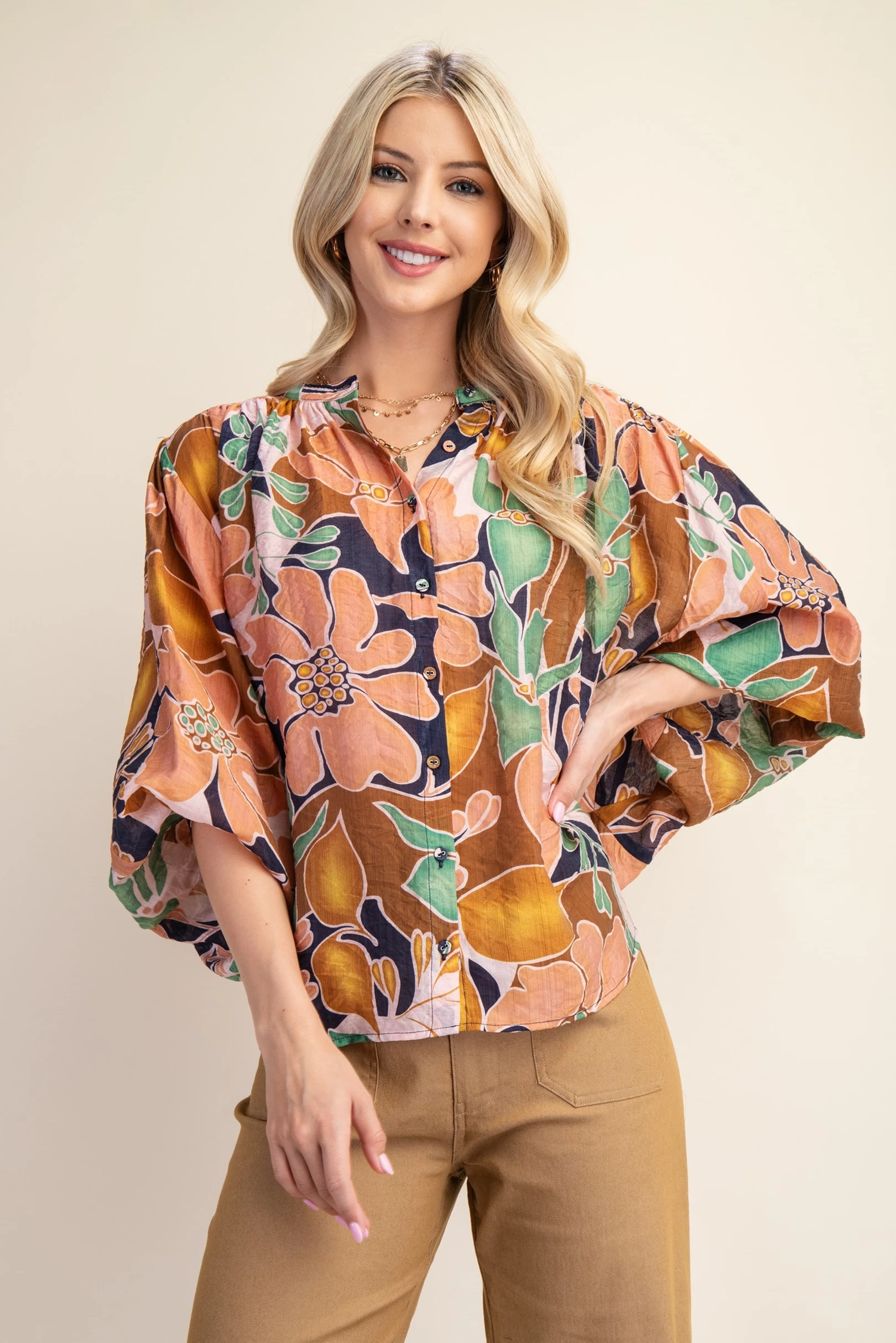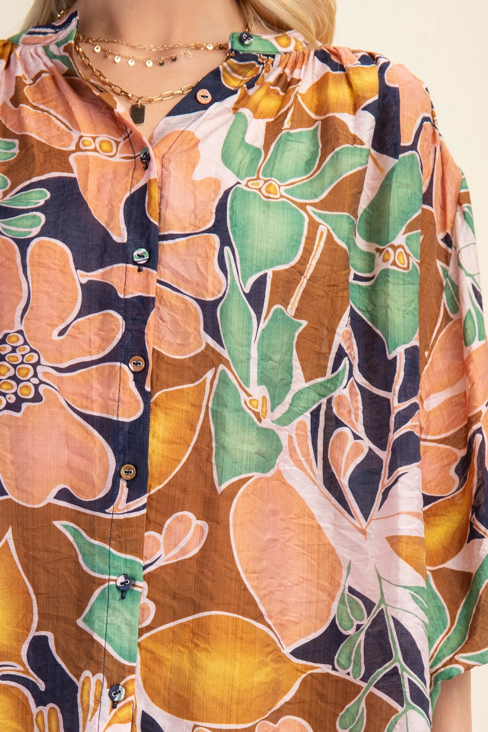 Batwing Blouse with Mandarin Collar and Fabric Covered Buttons