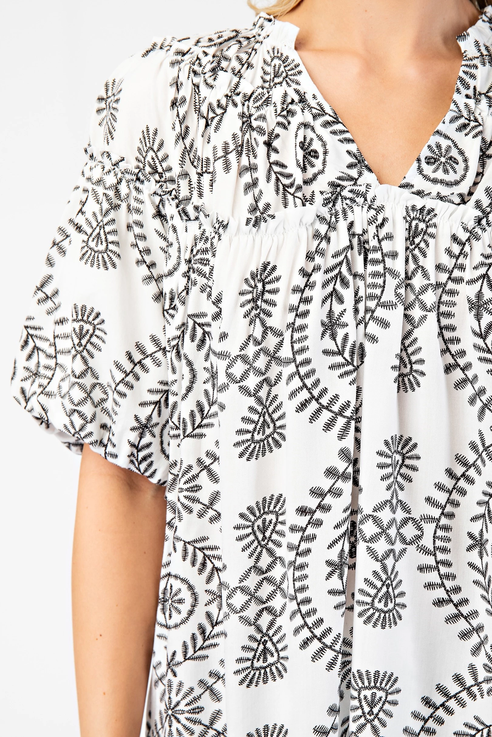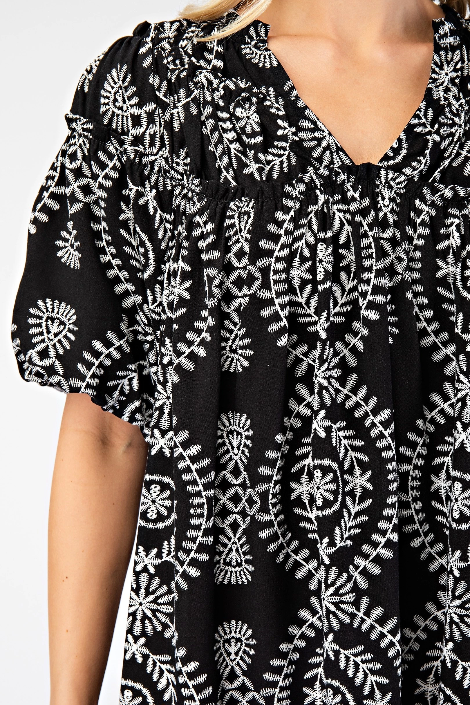 Short Puff Sleeve Top with Shirring and Ruffle Details