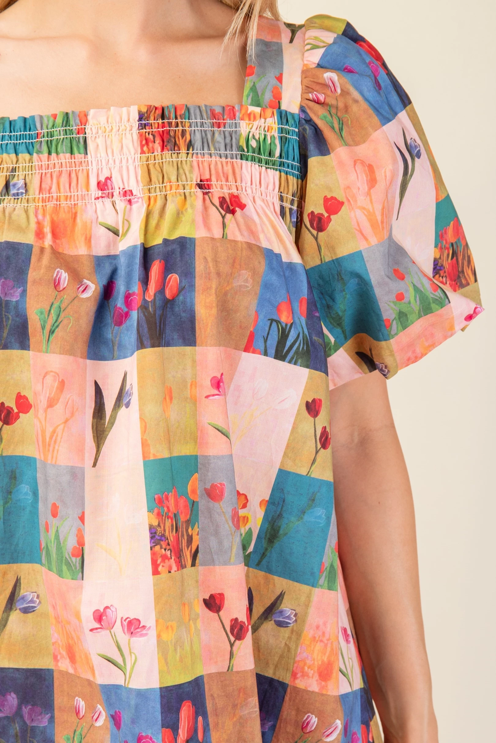 Puff Sleeve Mini Dress with Smocking on Back and Front Necklines