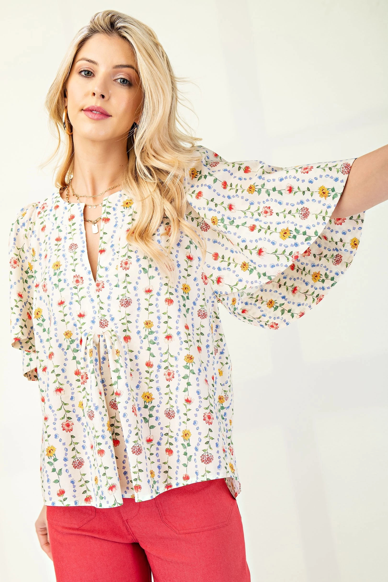 Floral Print Split Neck Top with Cape Sleeves and Pleat Detail