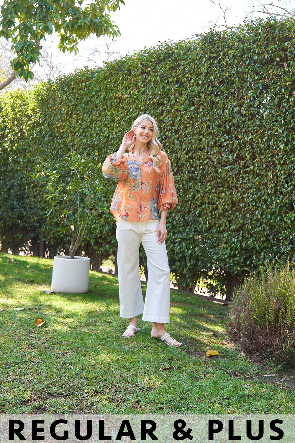 Printed Button Down Top with 3/4 Length Gathered Balloon Sleeves