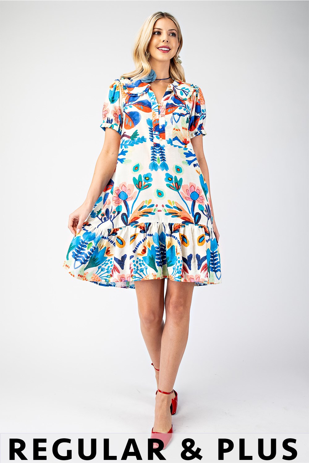 Floral Print Ruffled Neck Mini Dress with Contrasting Stripe Accents and Layered Ruffle Sleeves. The Skirt is Lined