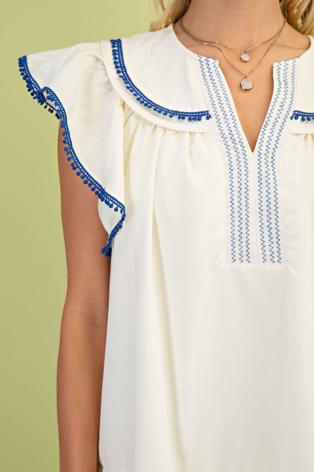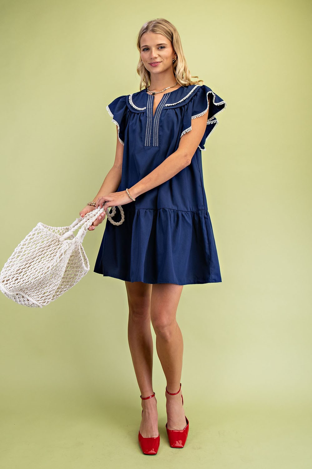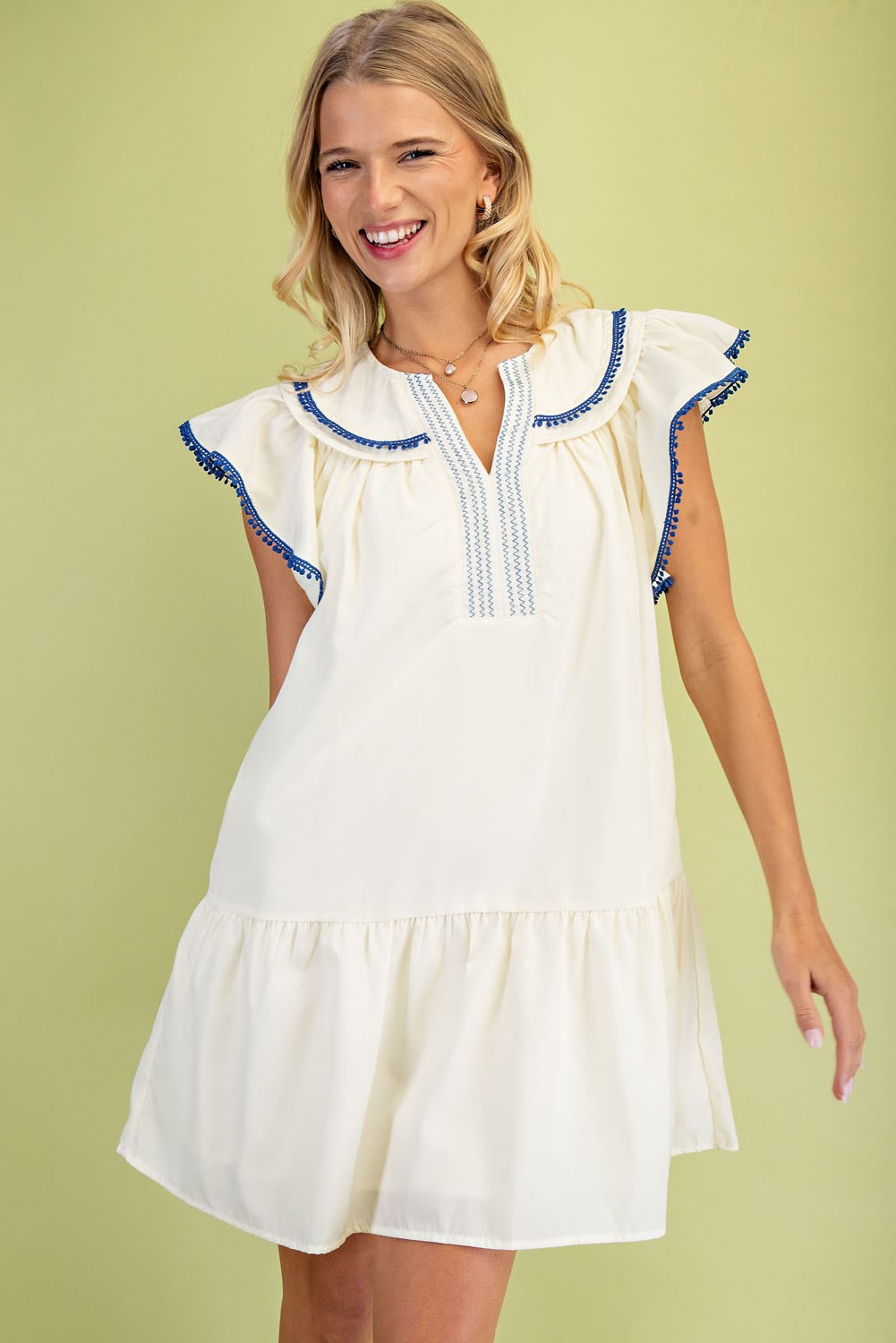 Split Neck Mini Dress with Ruffle Sleeves and a Pom-Pom Trim