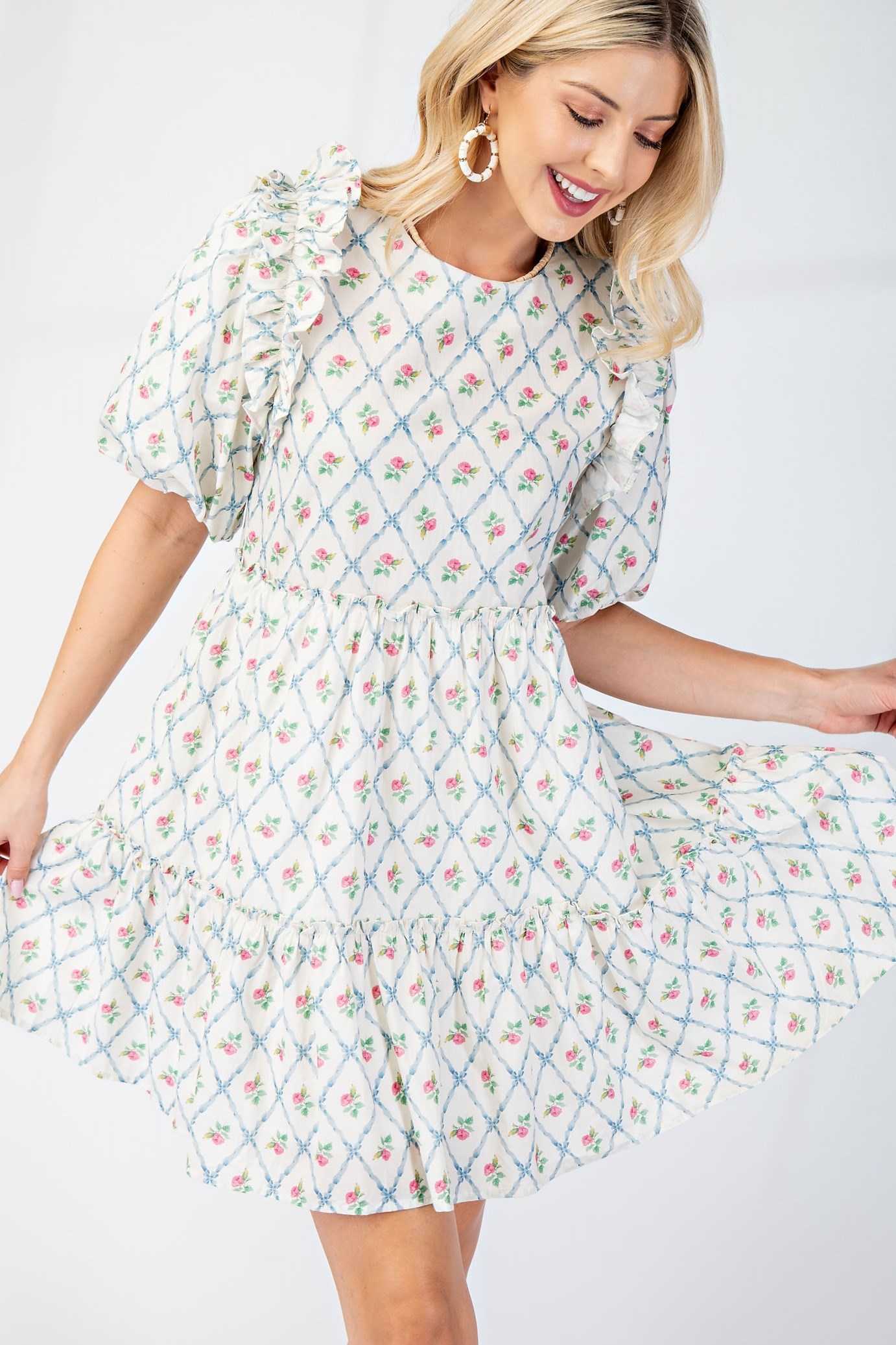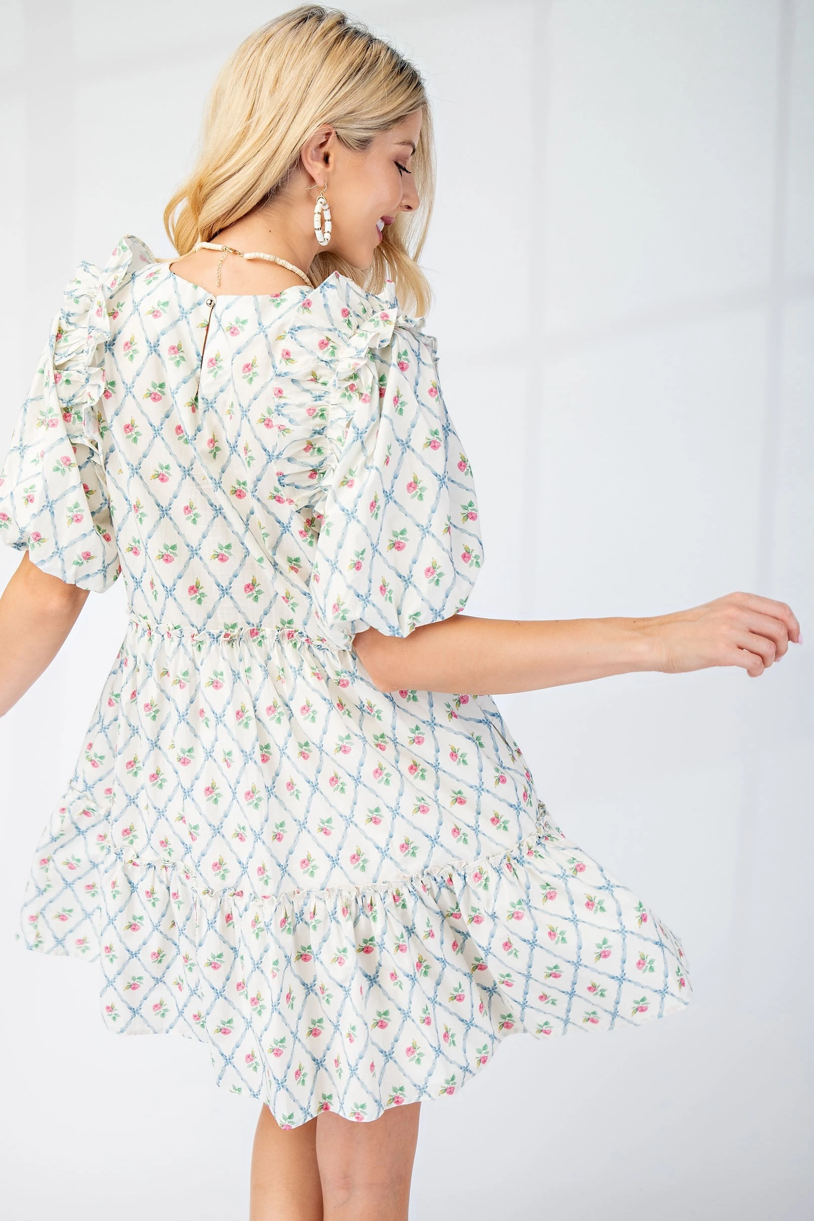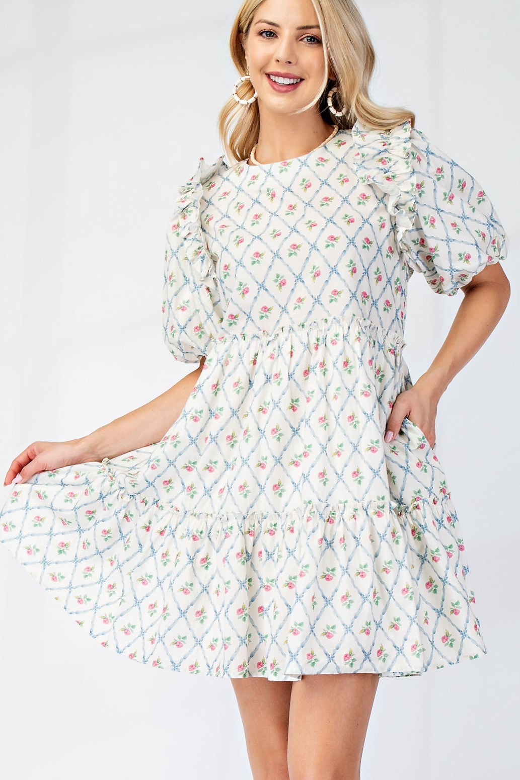 Round Neck Mini Babydoll Dress with Puff Sleeves and Ruffle Details