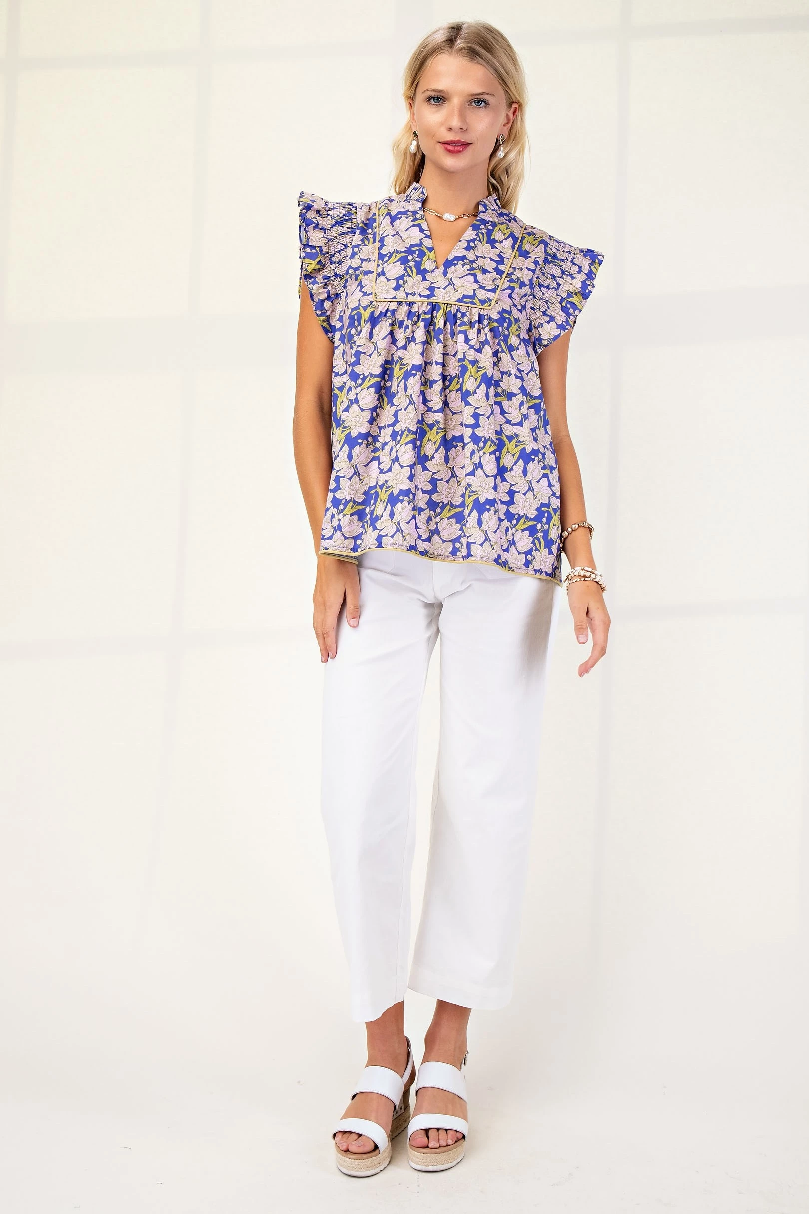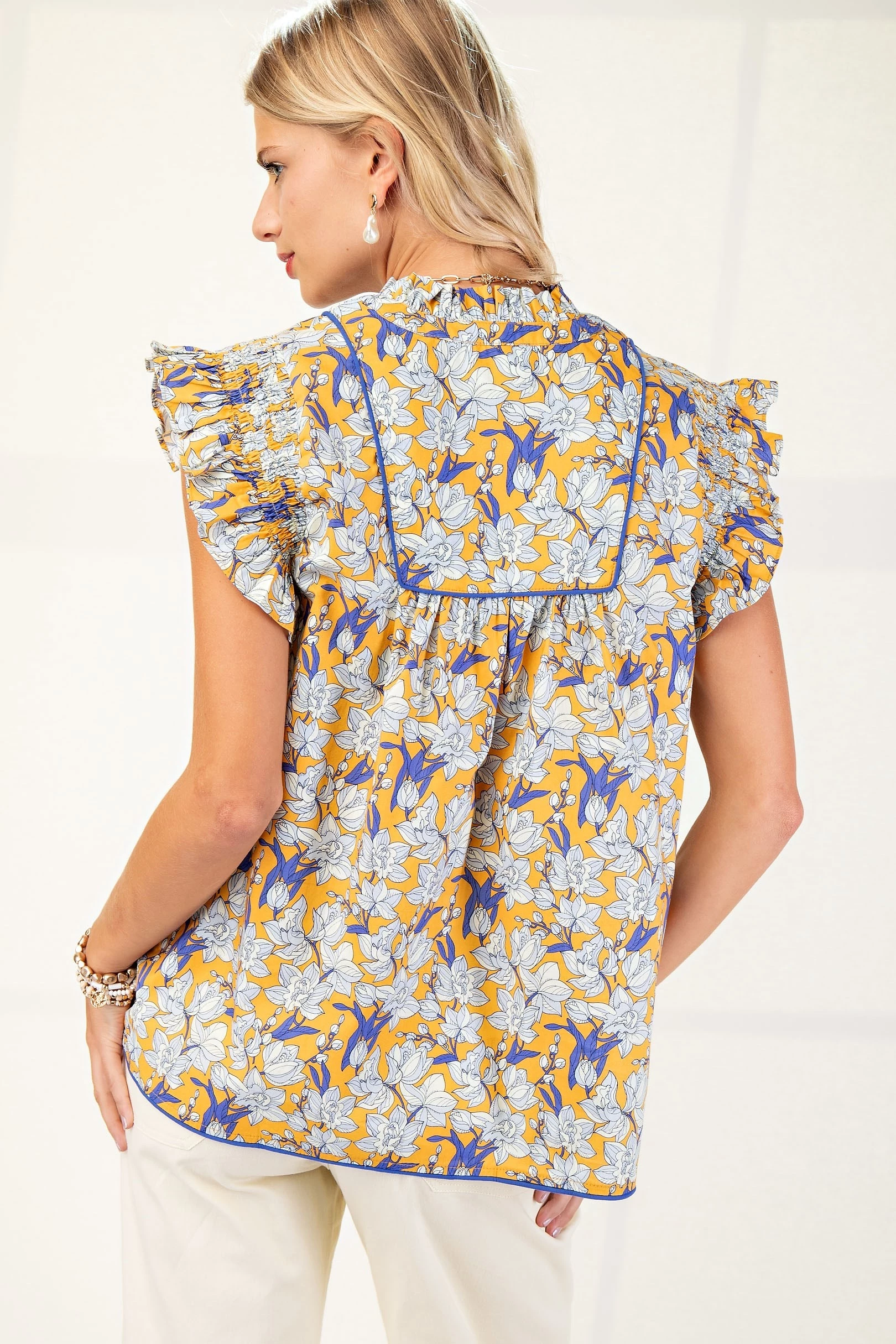 V-Neck Blouse with Smocked Ruffle Sleeves and Piping Details