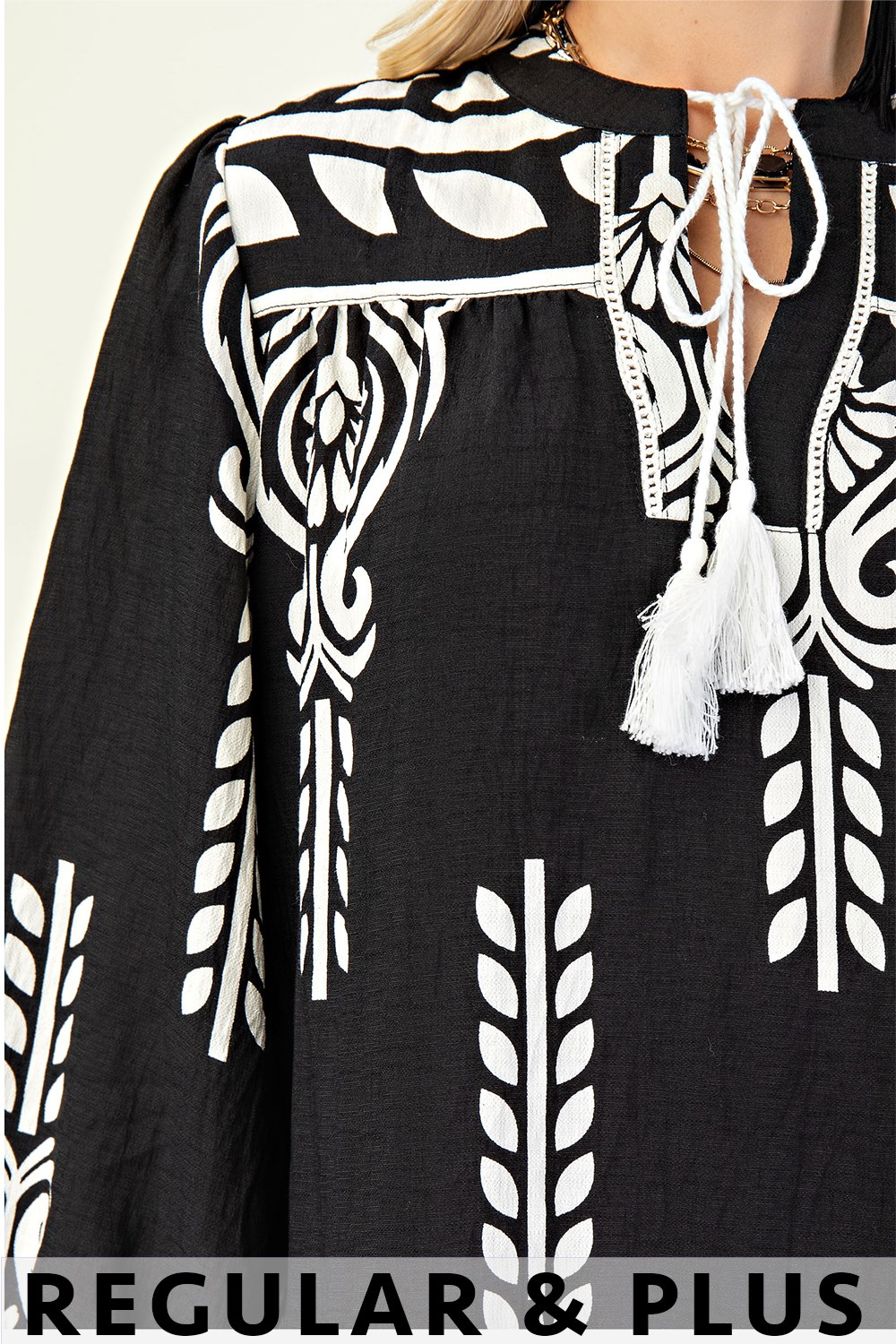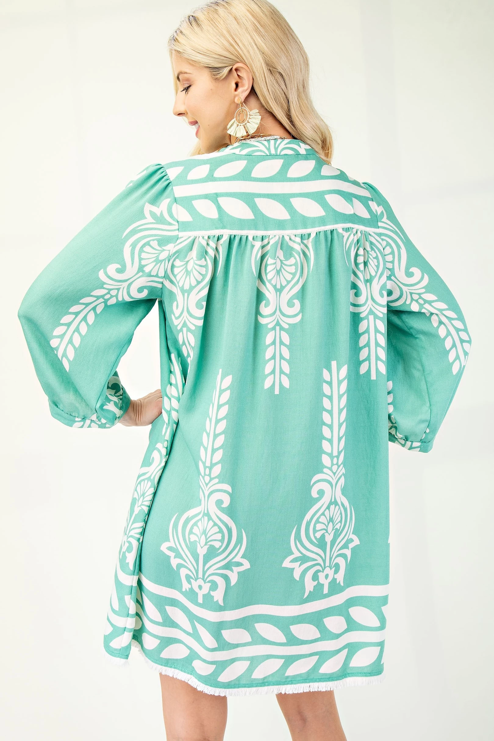 Printed 3/4 Sleeve Dress with Tassel Tie and Fringe Detail on Hem
