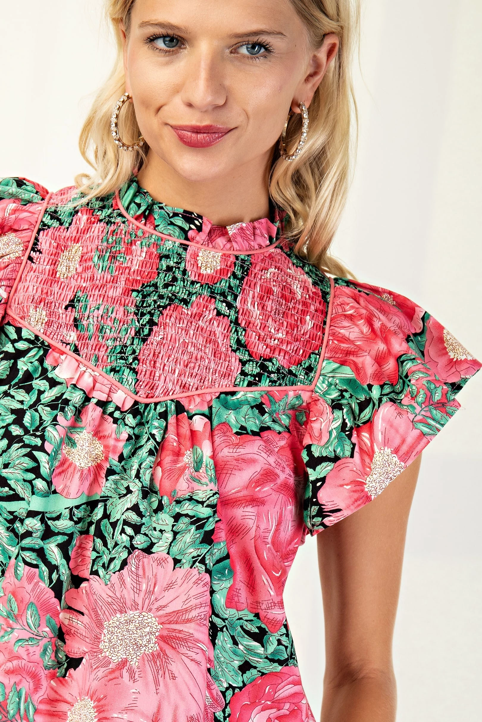 Smocked Neck Blouse with Ruffled Sleeves and Binding Detail