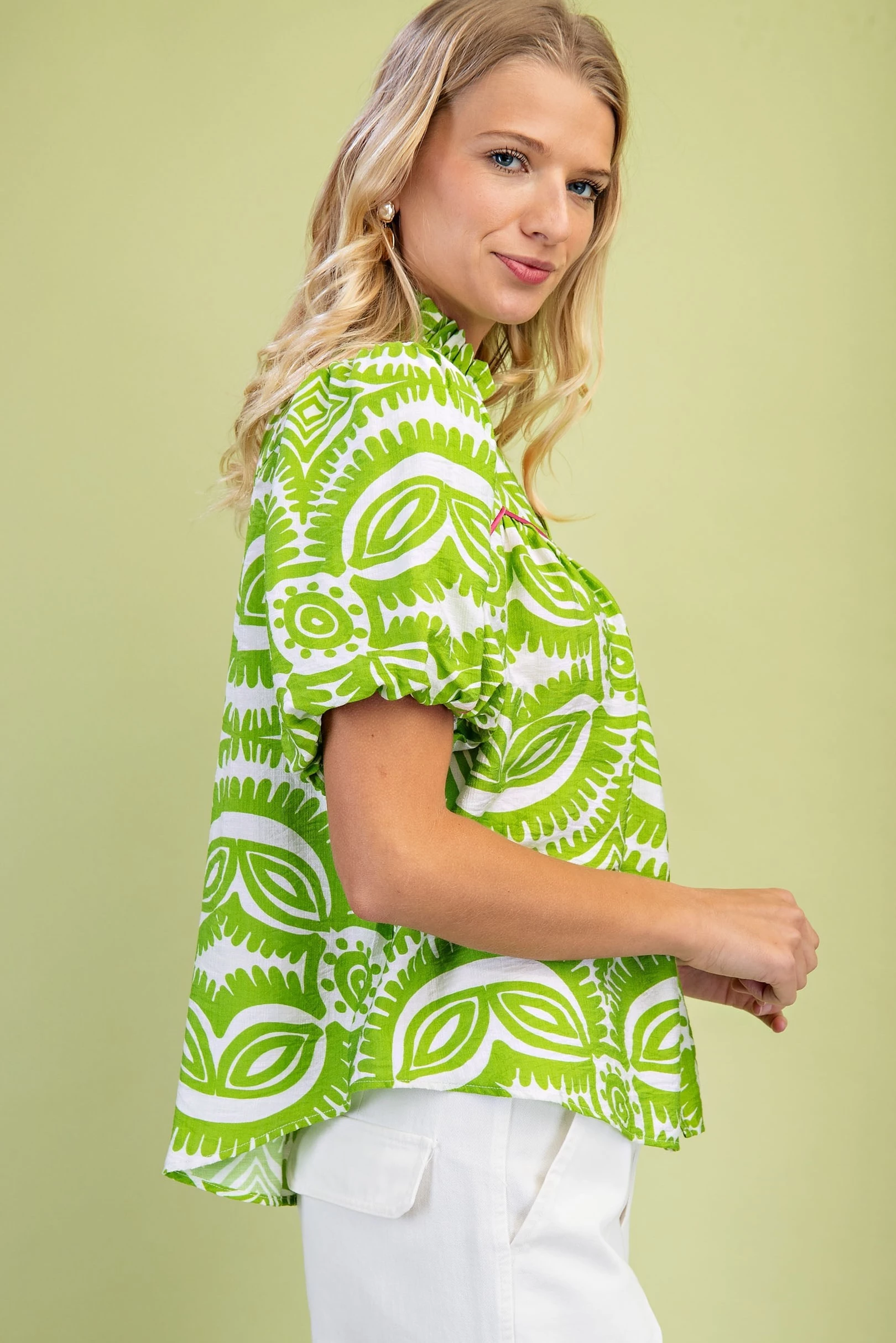 Ruffled Neck Short Puff Sleeve Top with Piping Details