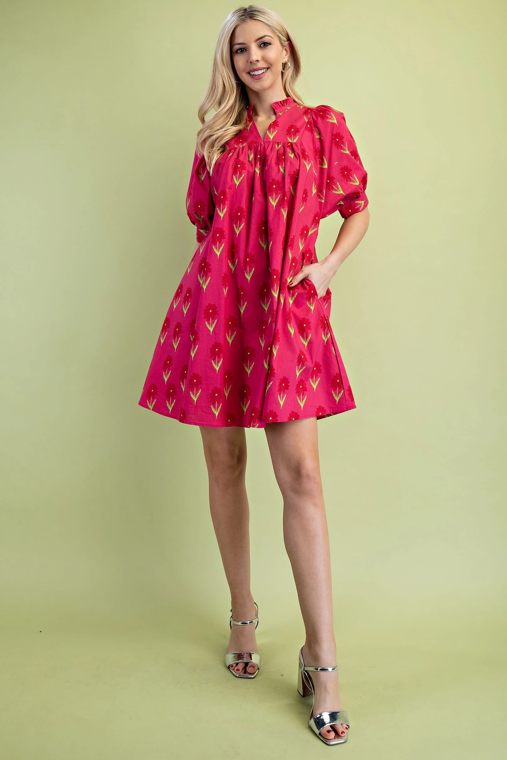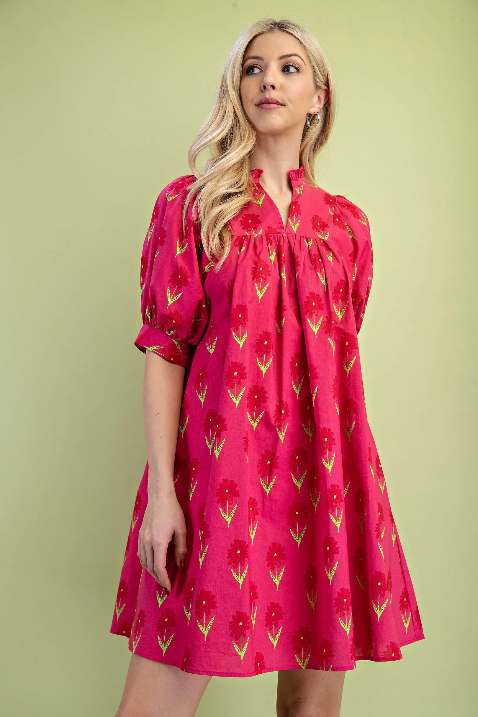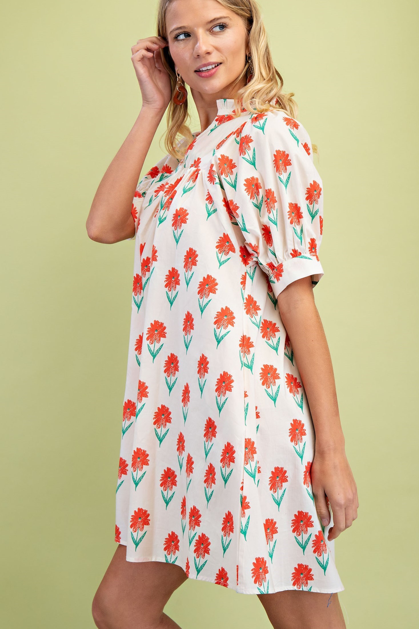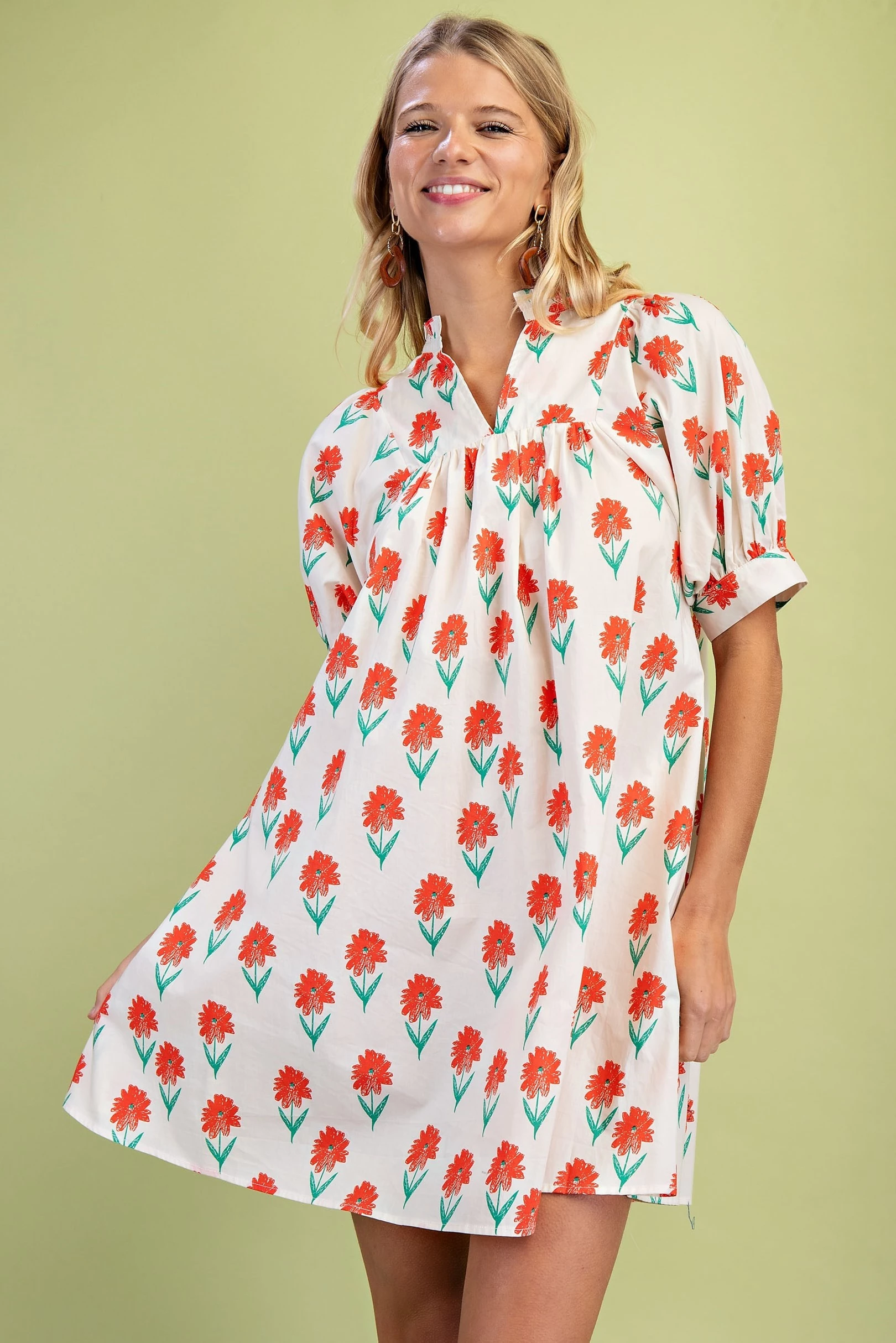 Floral Print Mini Dress with a Ruffled Neck and Short Puff Sleeves