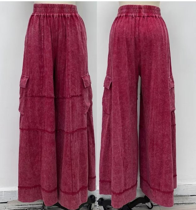 Mineral Washed Wide Leg Pants with Pocket and Exposed Seam Details