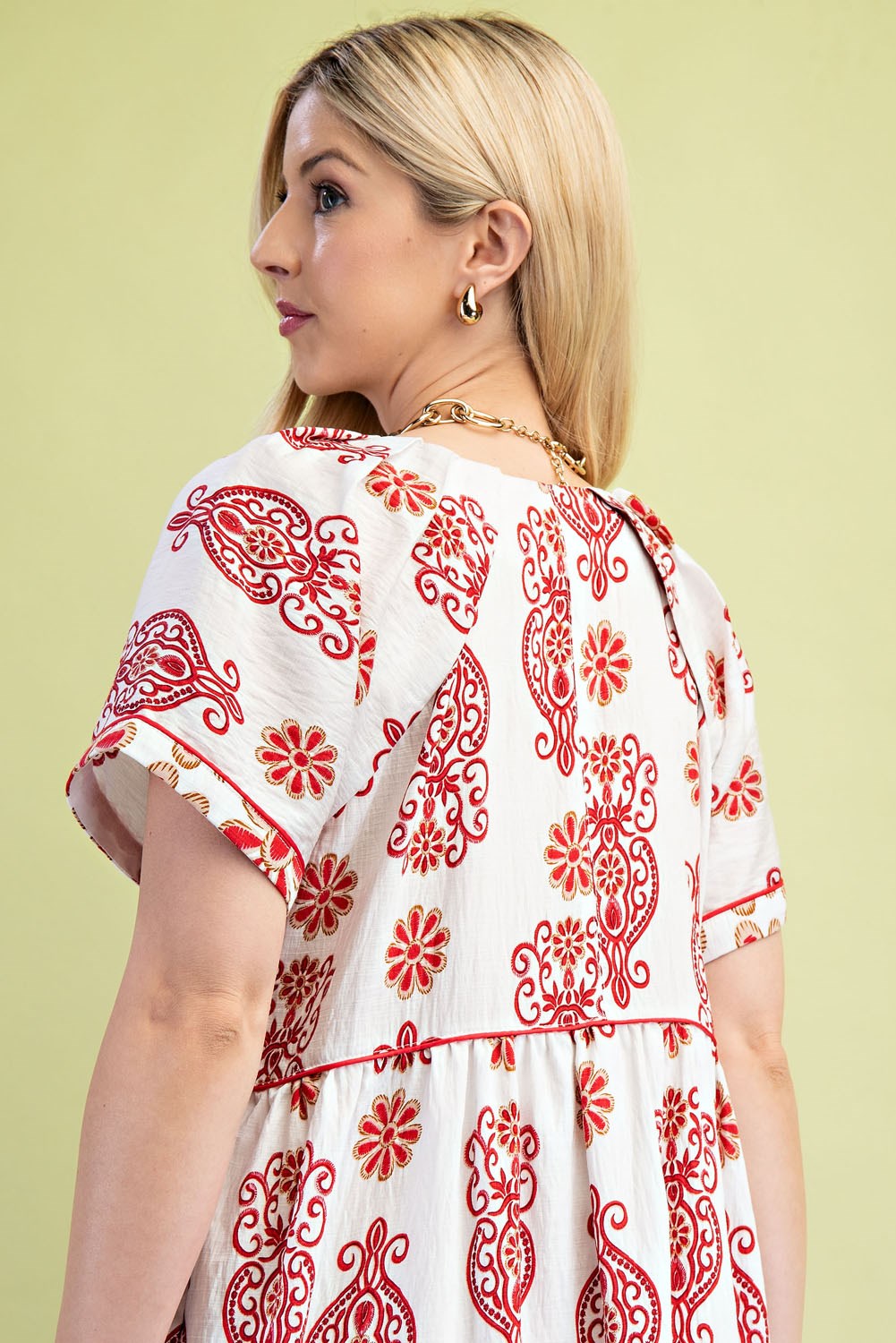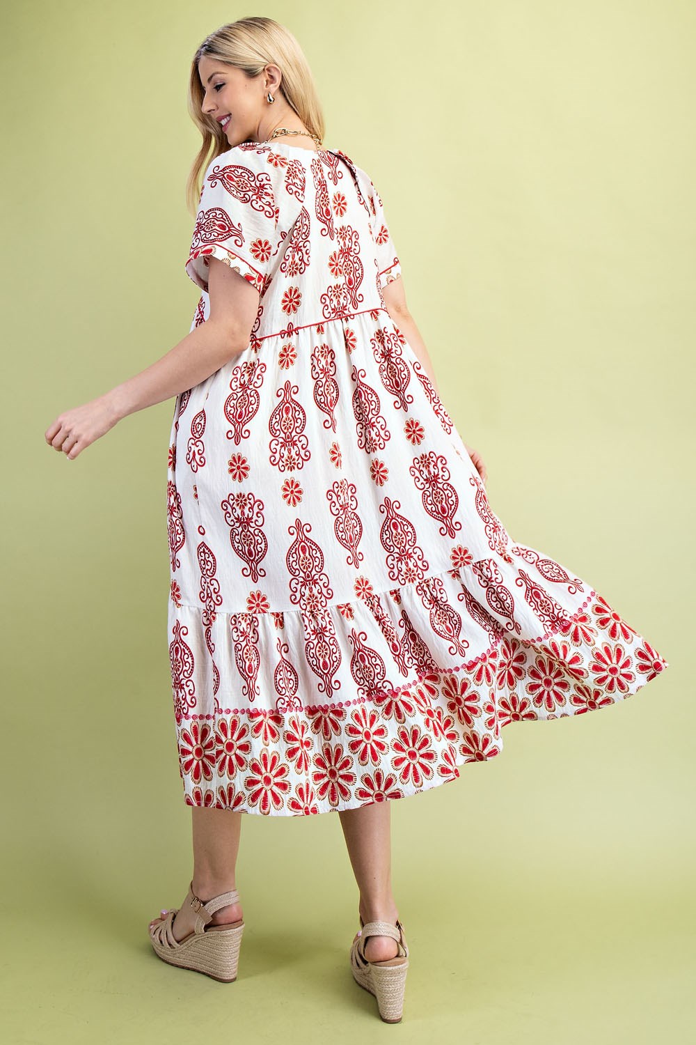 Watercolor Floral Tiered V-Neck Midi Dress with Decorative Trim Details. The Dress is Lined