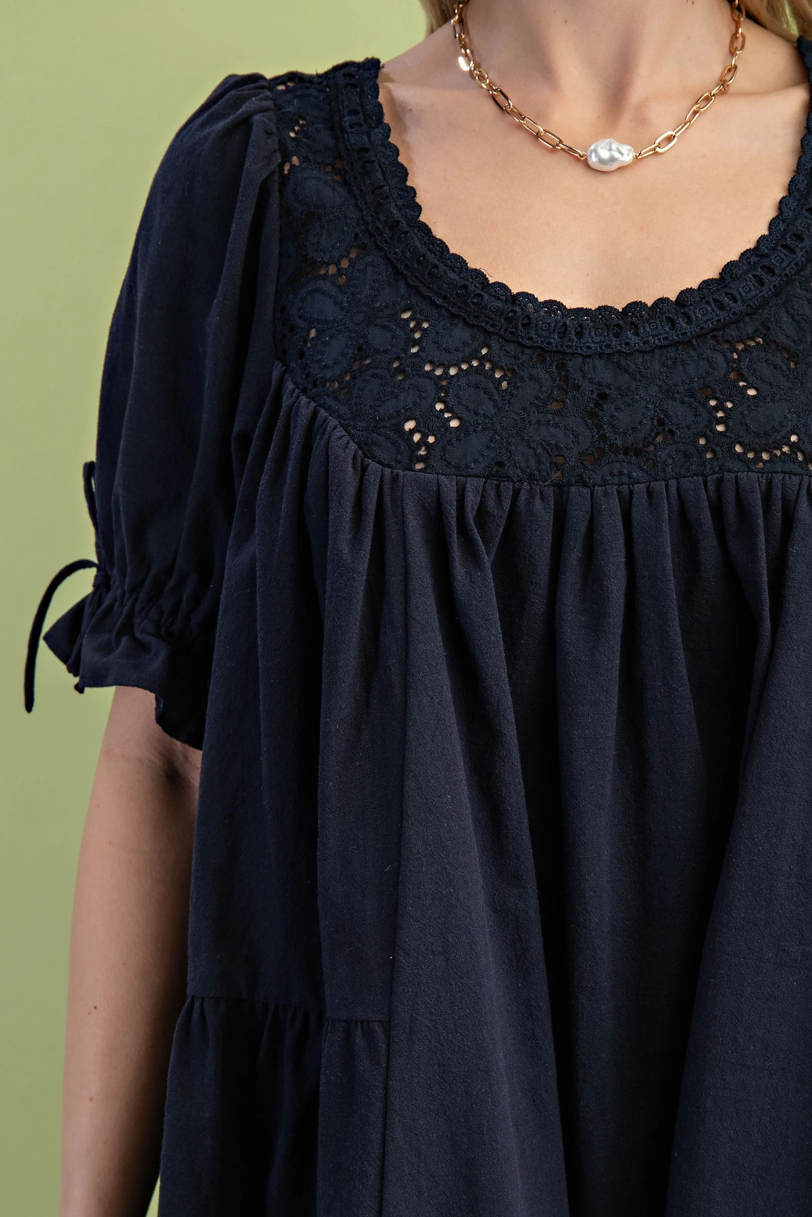 Scoop Neck Voluminous Mini Dress with Tied Puff Sleeves and an Eyelet Yoke