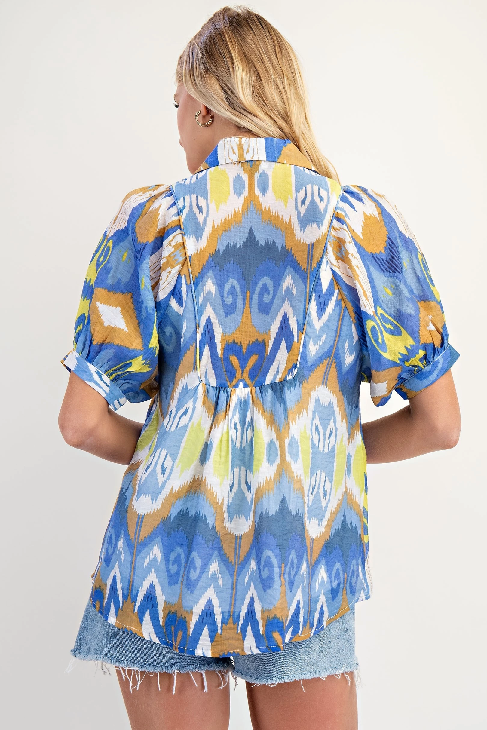 Smocked Yoke Top with Short Balloon Sleeves and a Collar