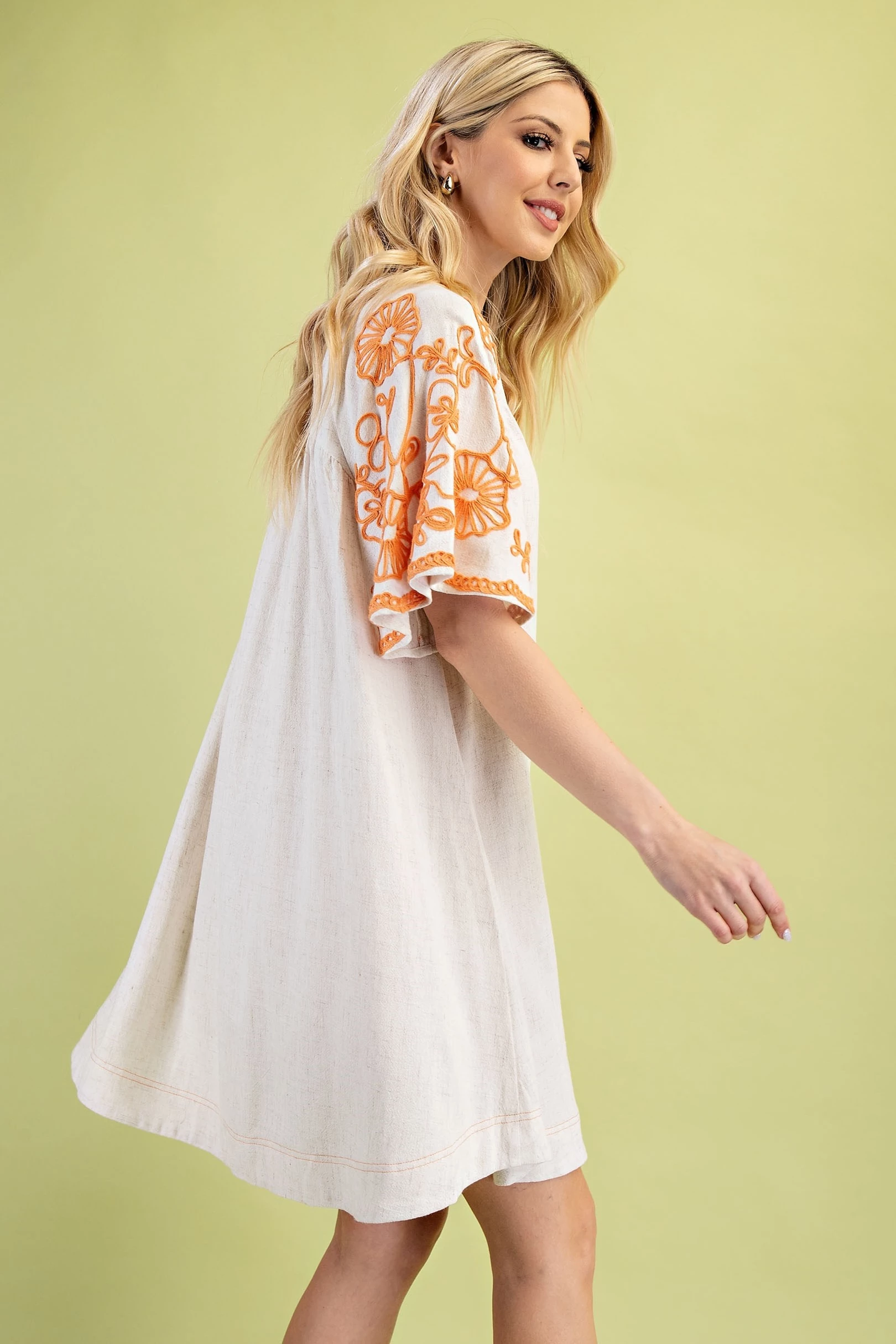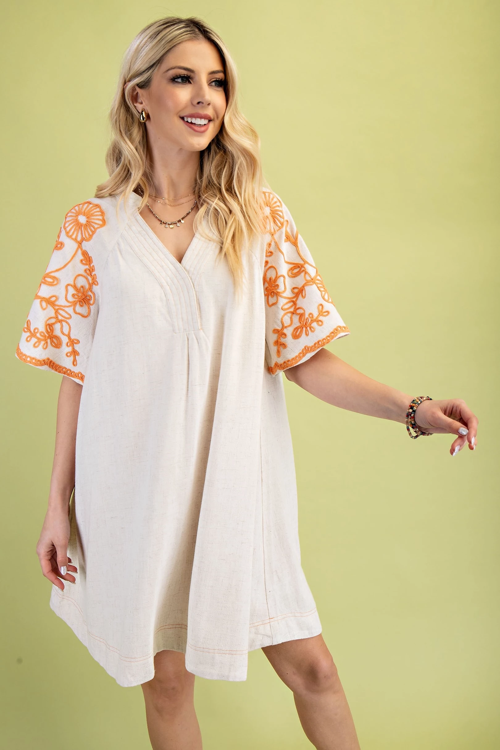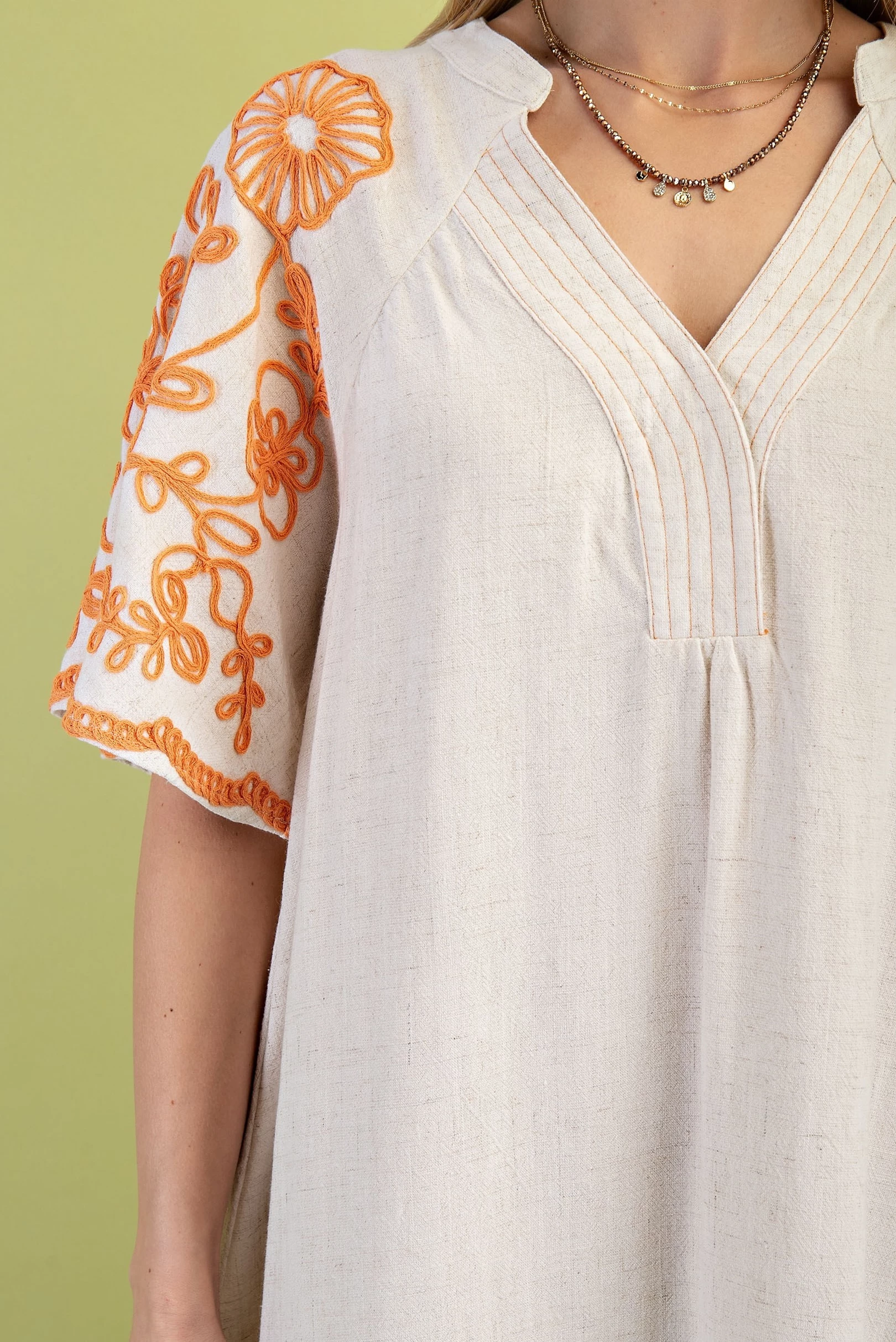 Embroidered Sleeve V-Neck Dress with a Snap Closure and Trapunto Stitching