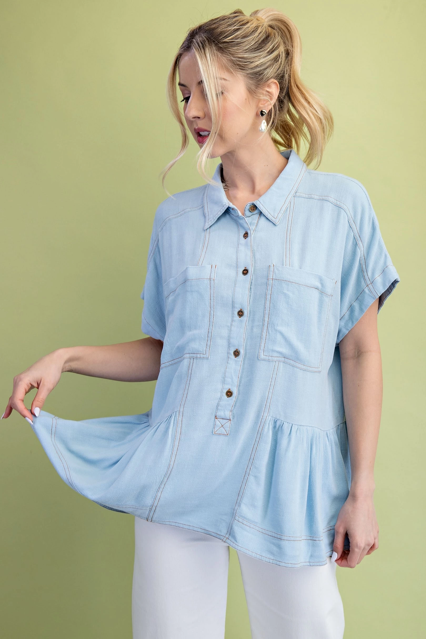 Linen Button Up Peplum Blouse with Front Pockets and Seaming Details