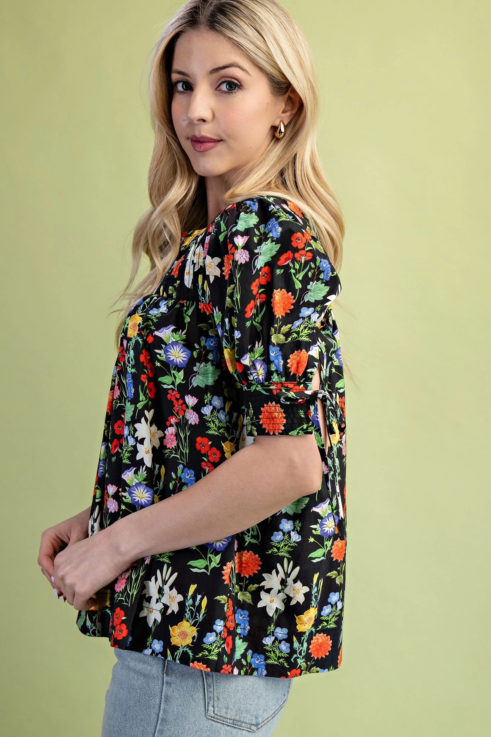 Floral 3D Appliqué and Embroidered V-Neck Top with a Covered Button Placket and Elastic Banded Sleeves