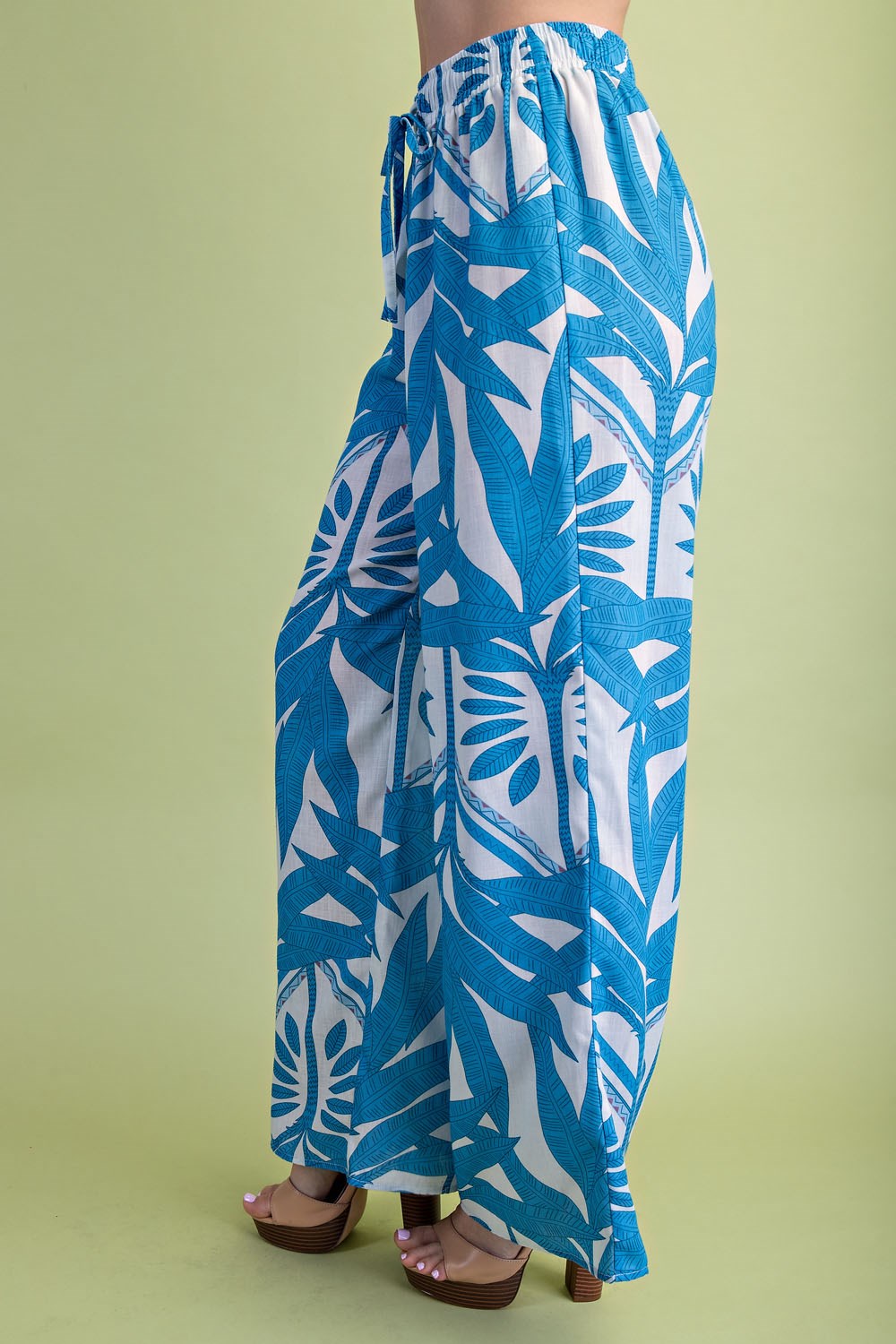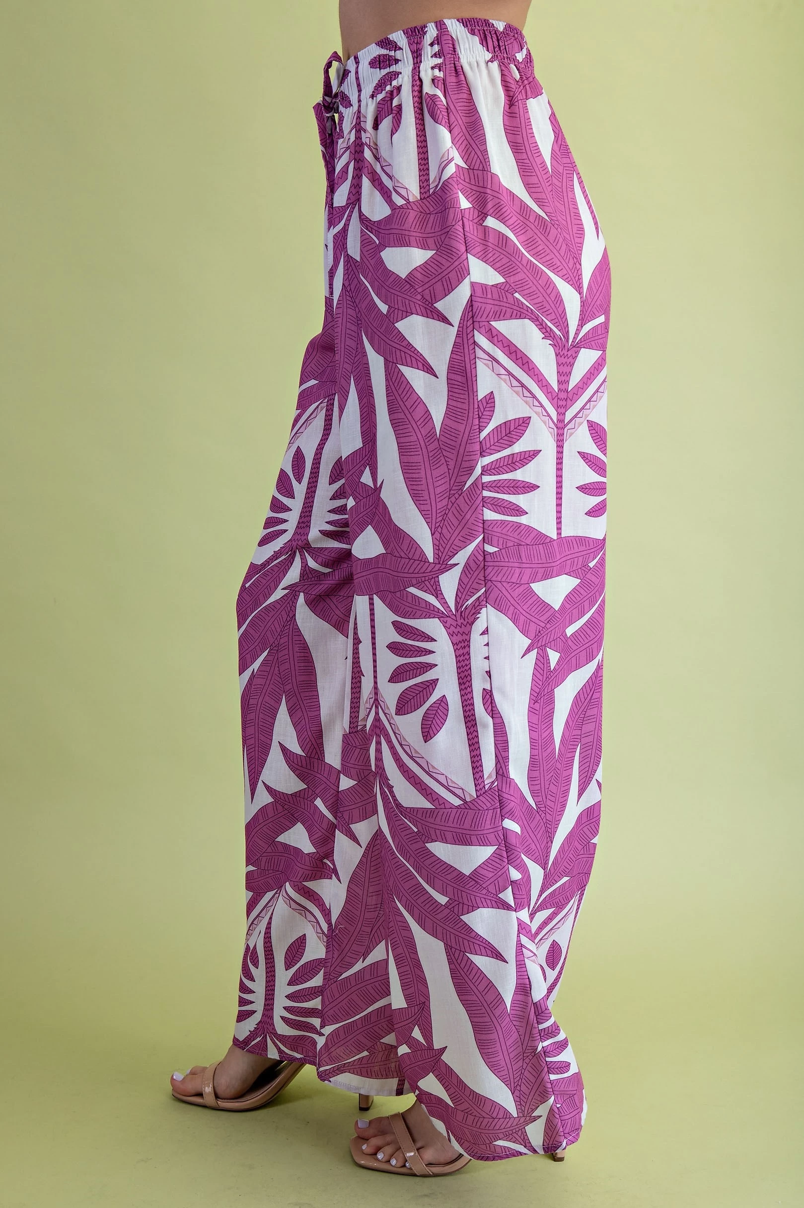 Tropical Print Relaxed Fit Pants with Elastic Waist and Drawstring