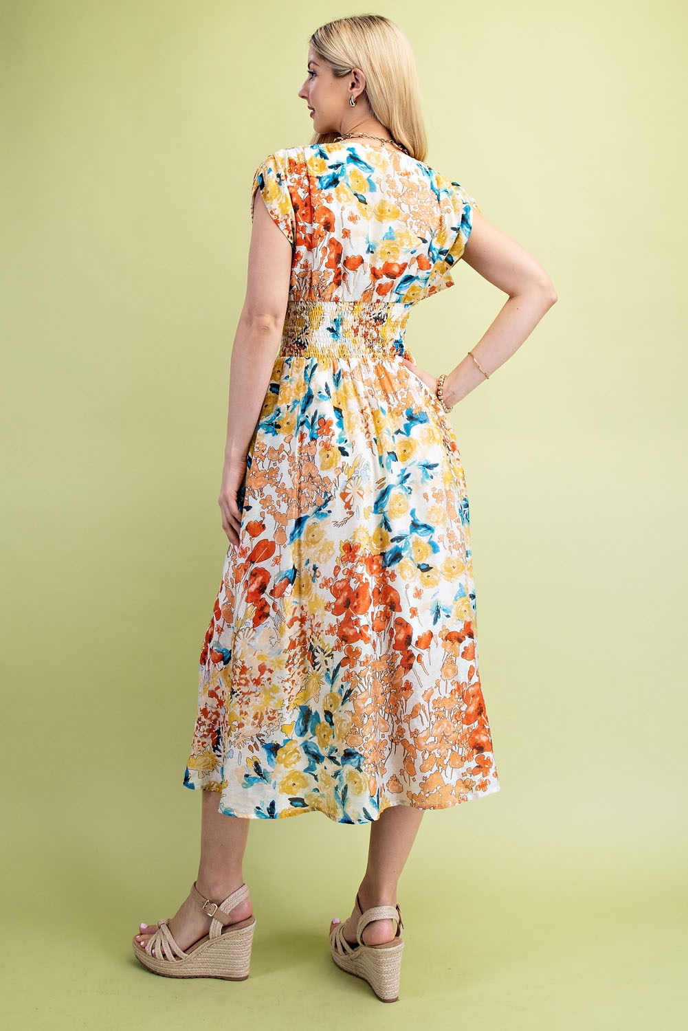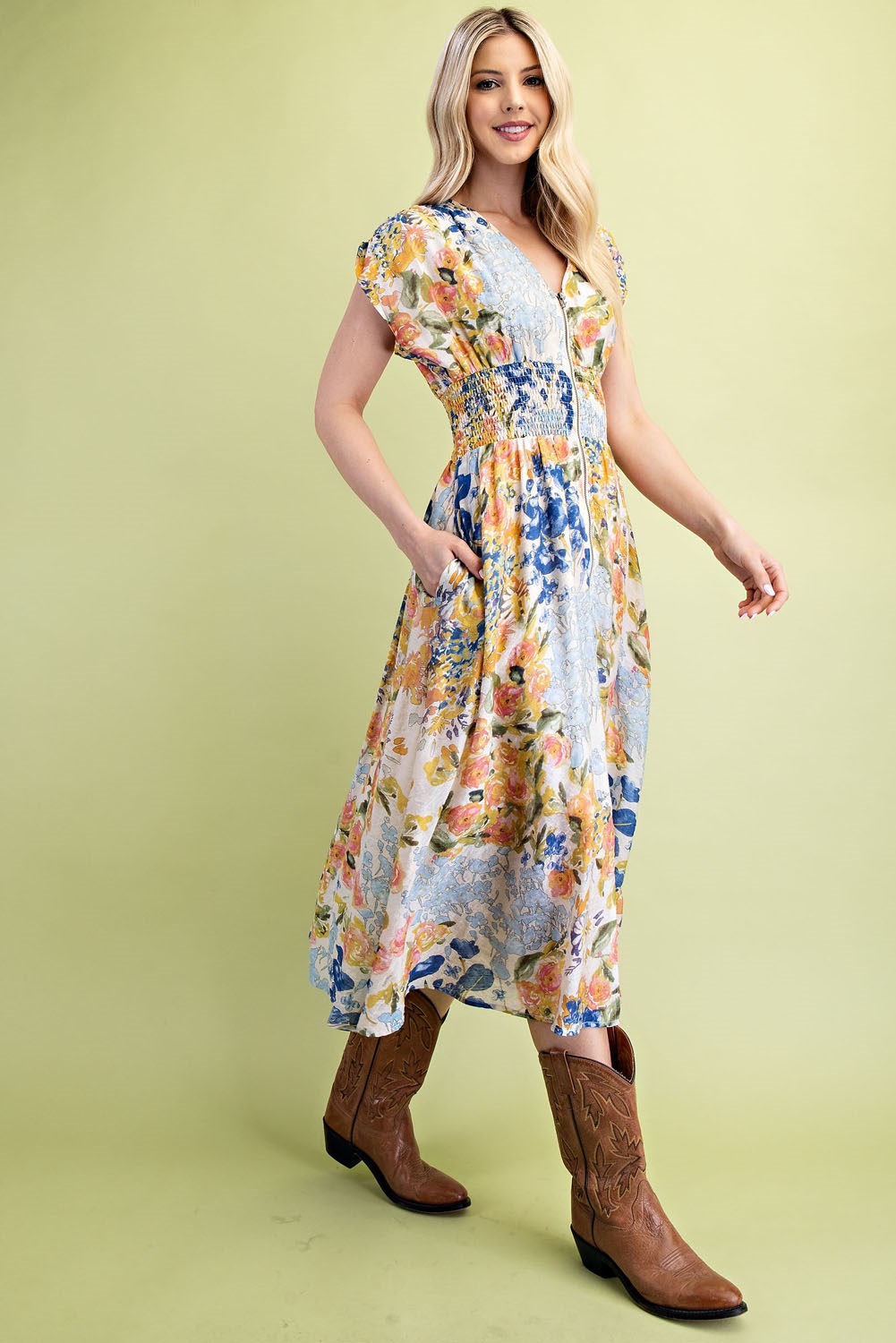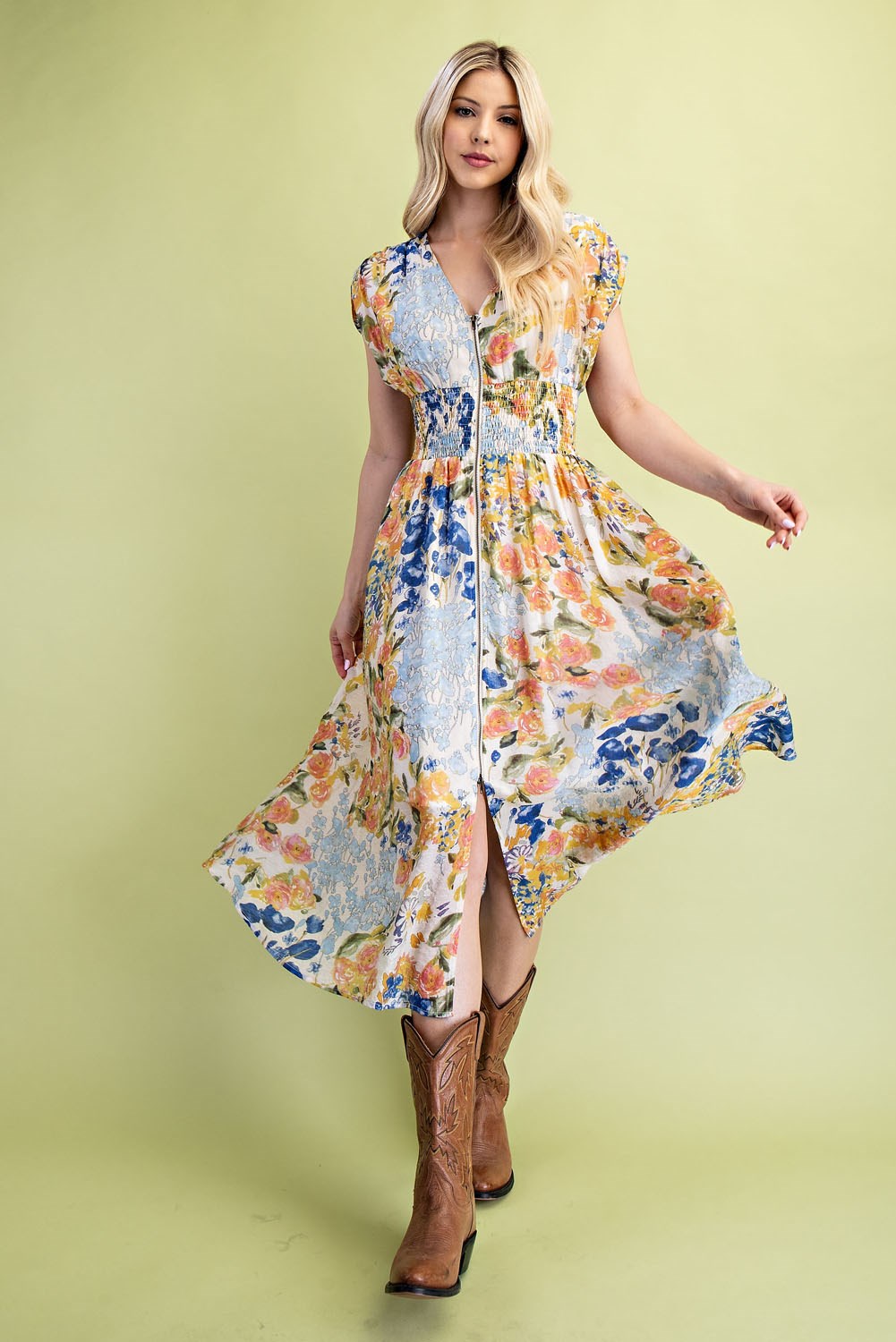 Mixed Print Short Puff Sleeve Midi Dress with a Smocked Front Yoke
