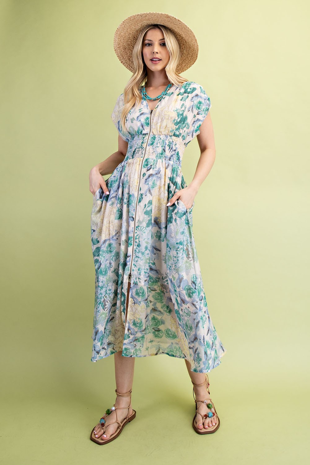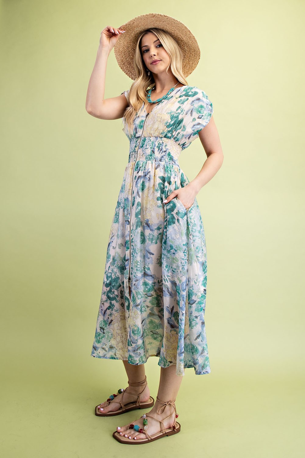 Floral Jacquard Printed Button Down Dress with Short Puff Sleeves. The Dress is Lined