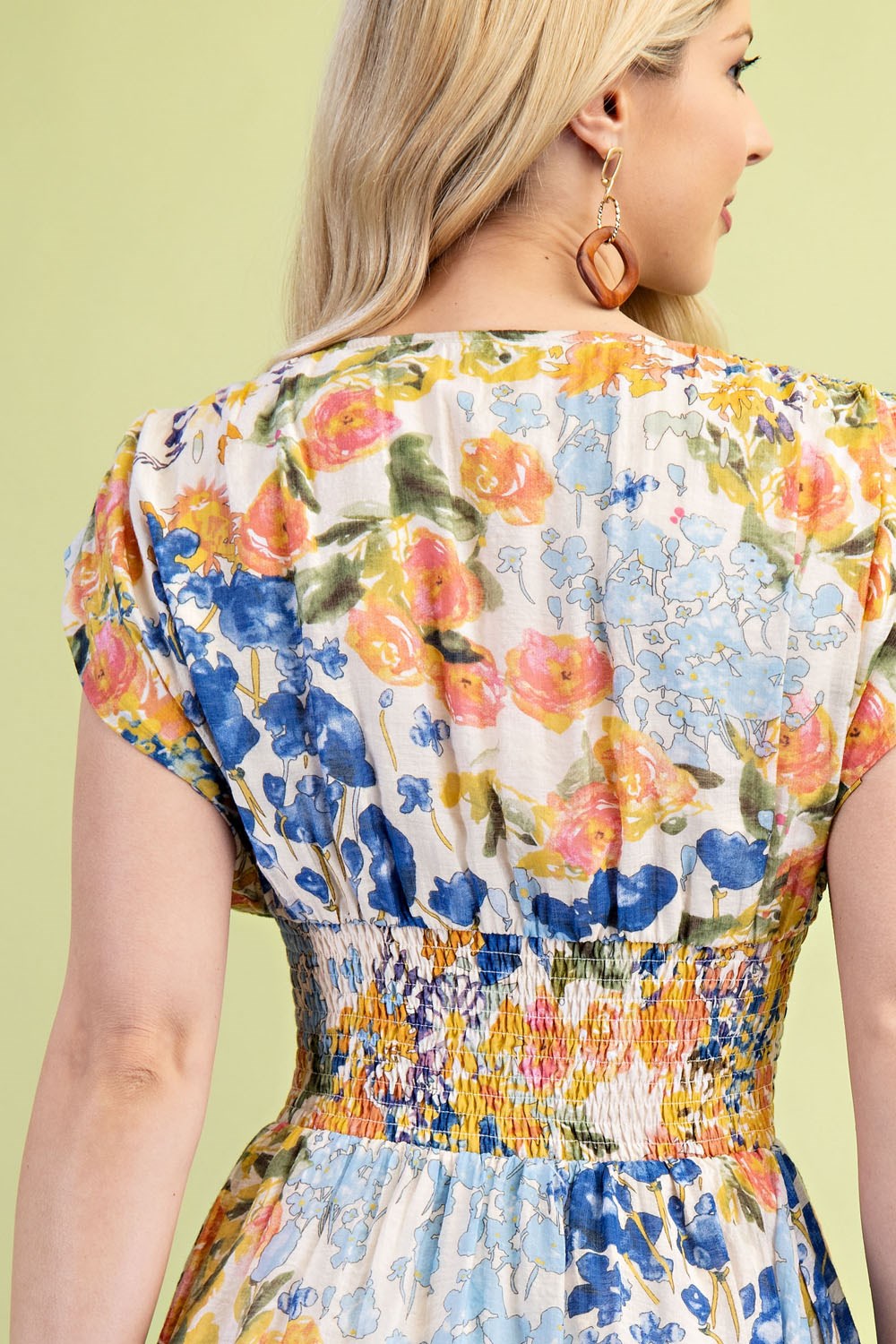 Floral Print V-Neck Top with a Ruffled Collar and Smocking Details