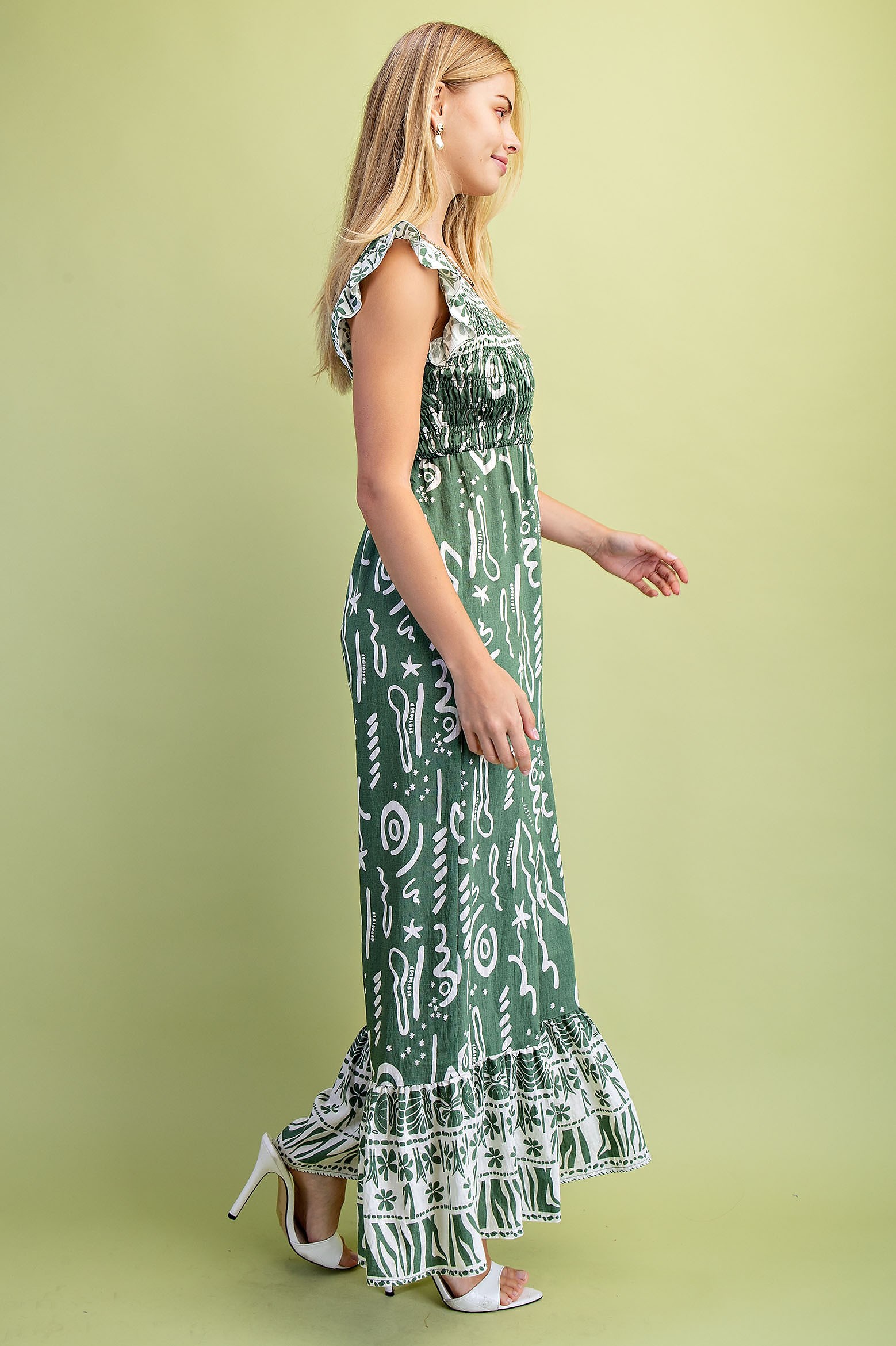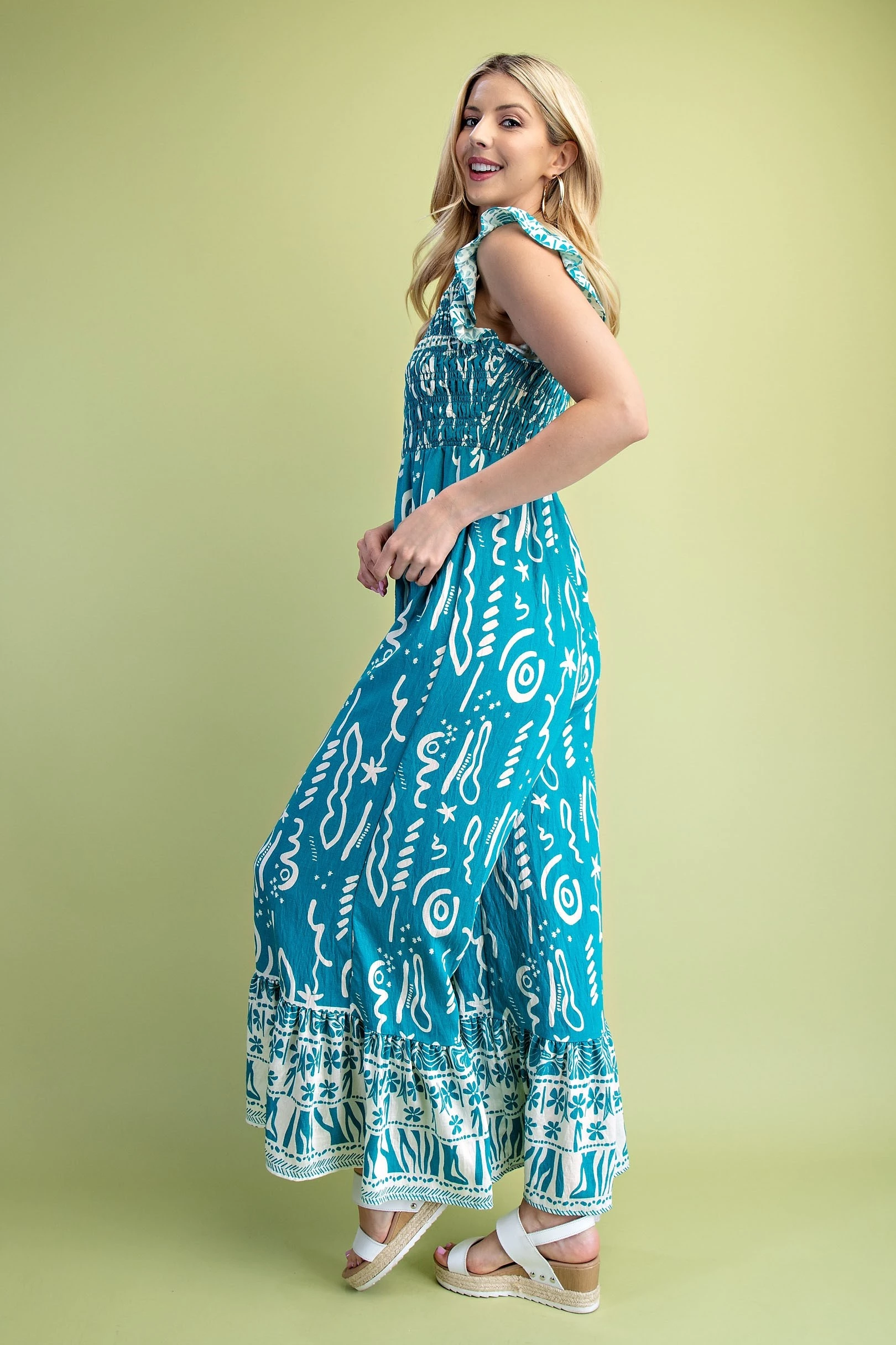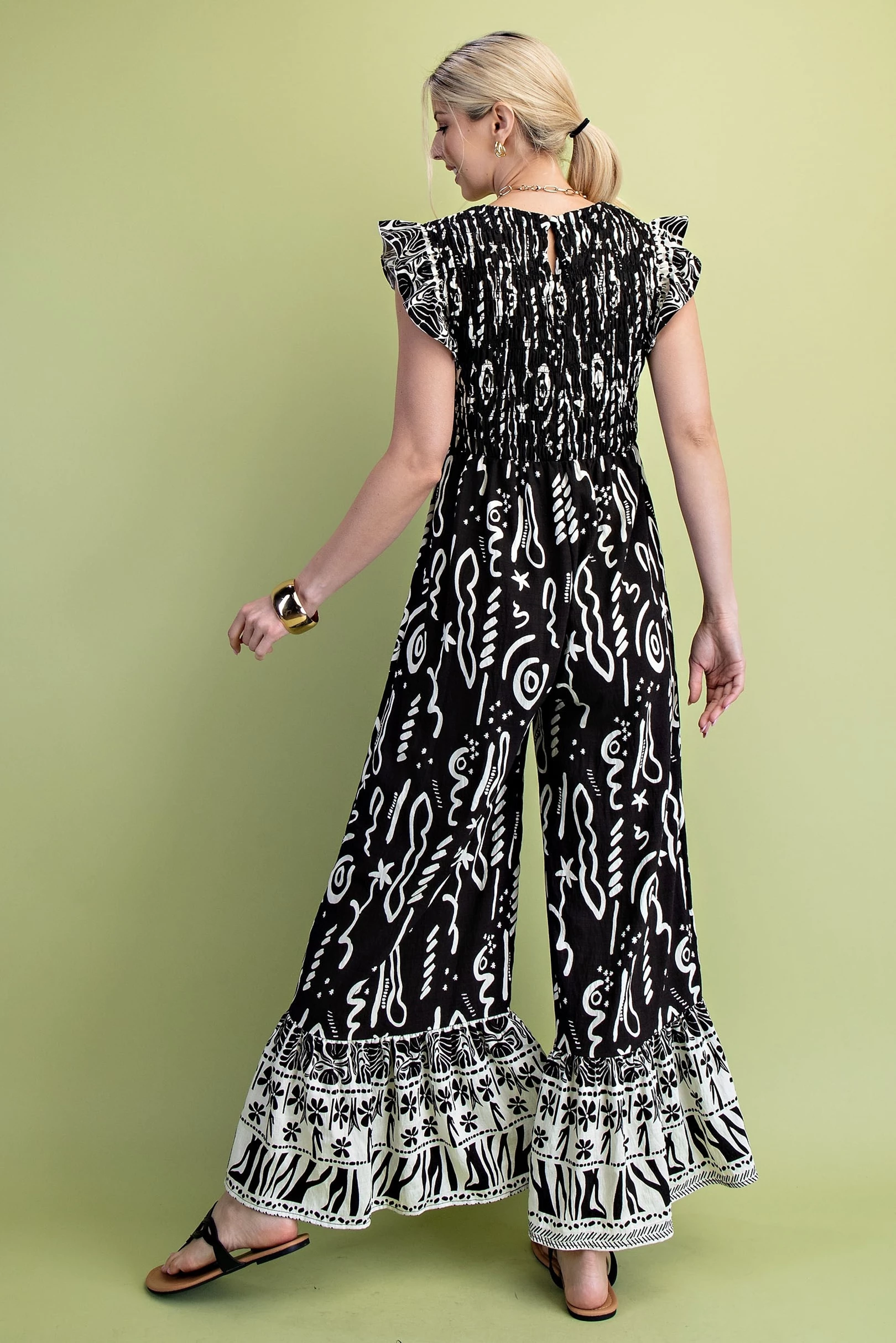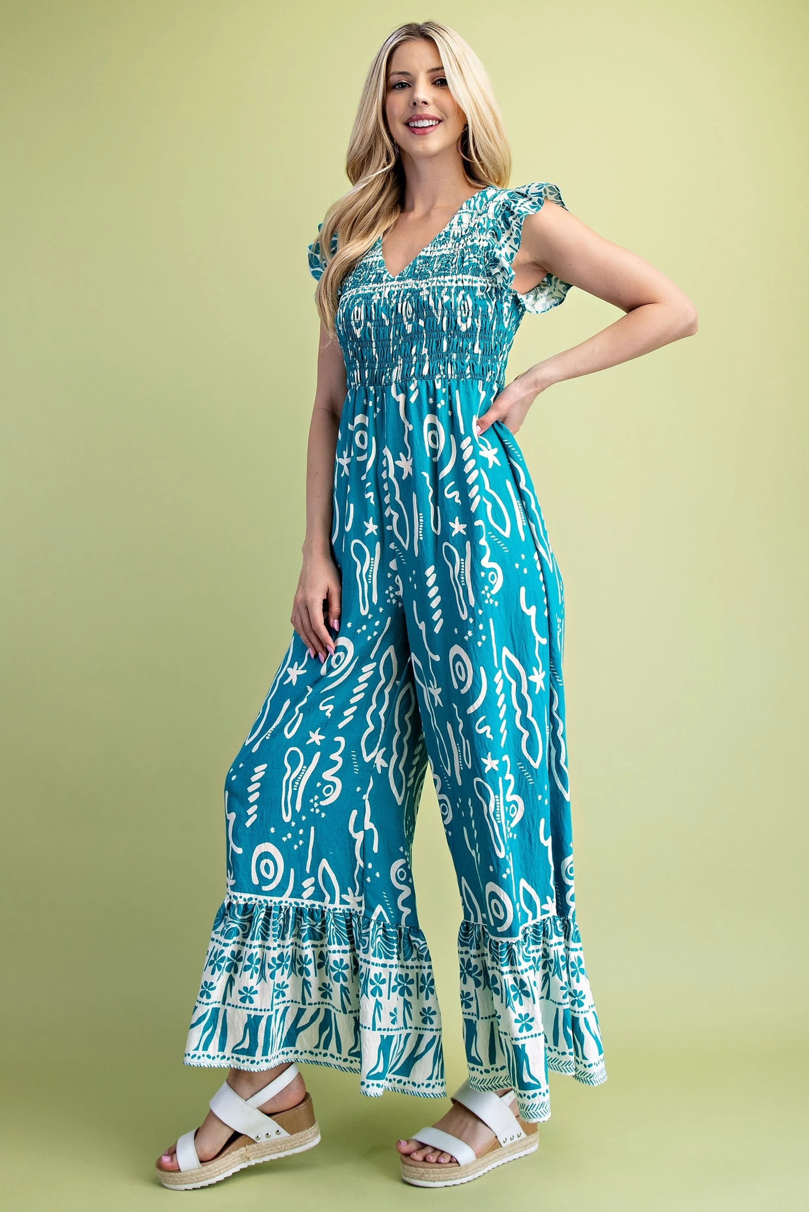 Mixed Print V-Neck Jumpsuit with a Smocked Bodice and Flutter Sleeves