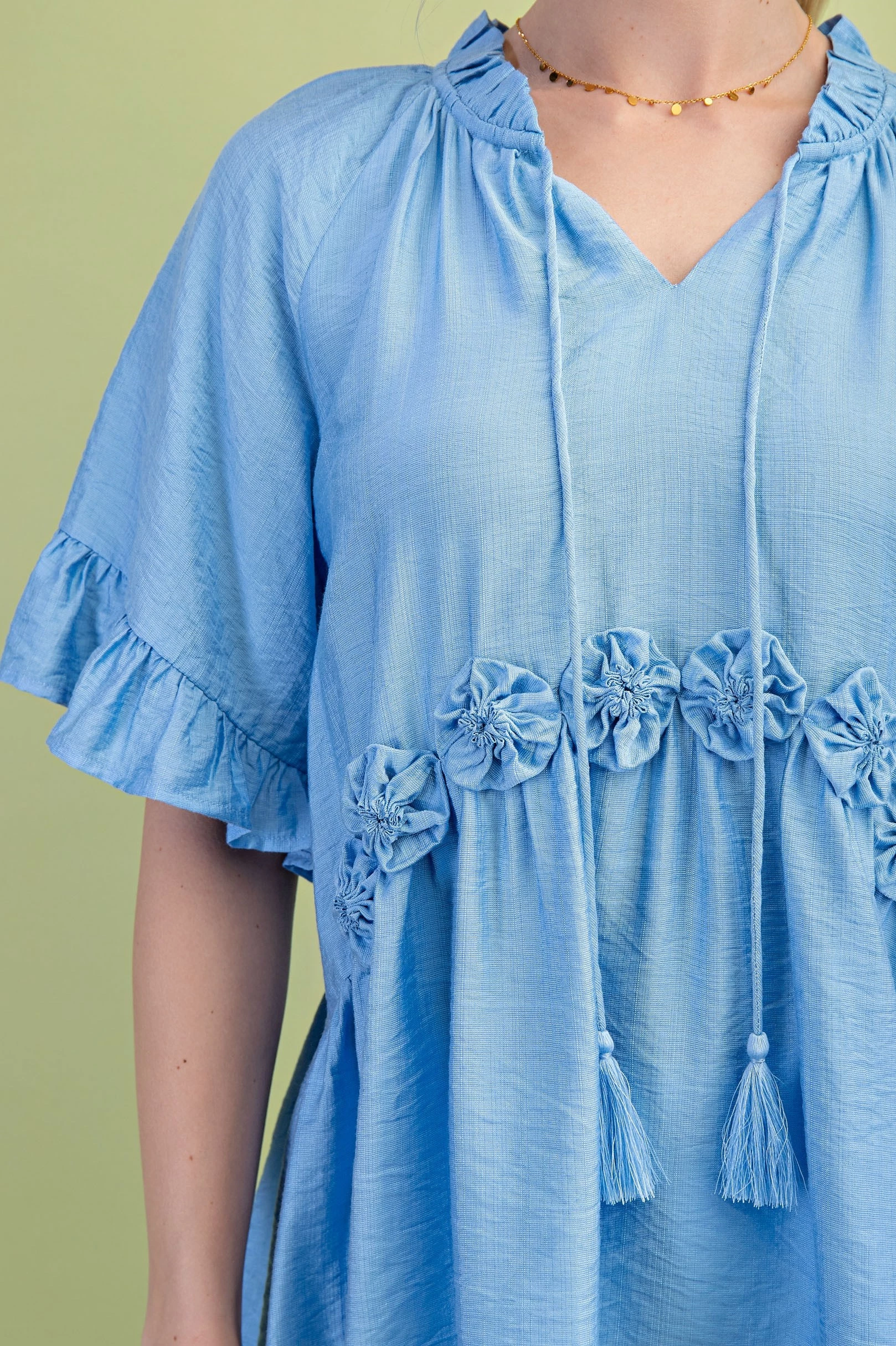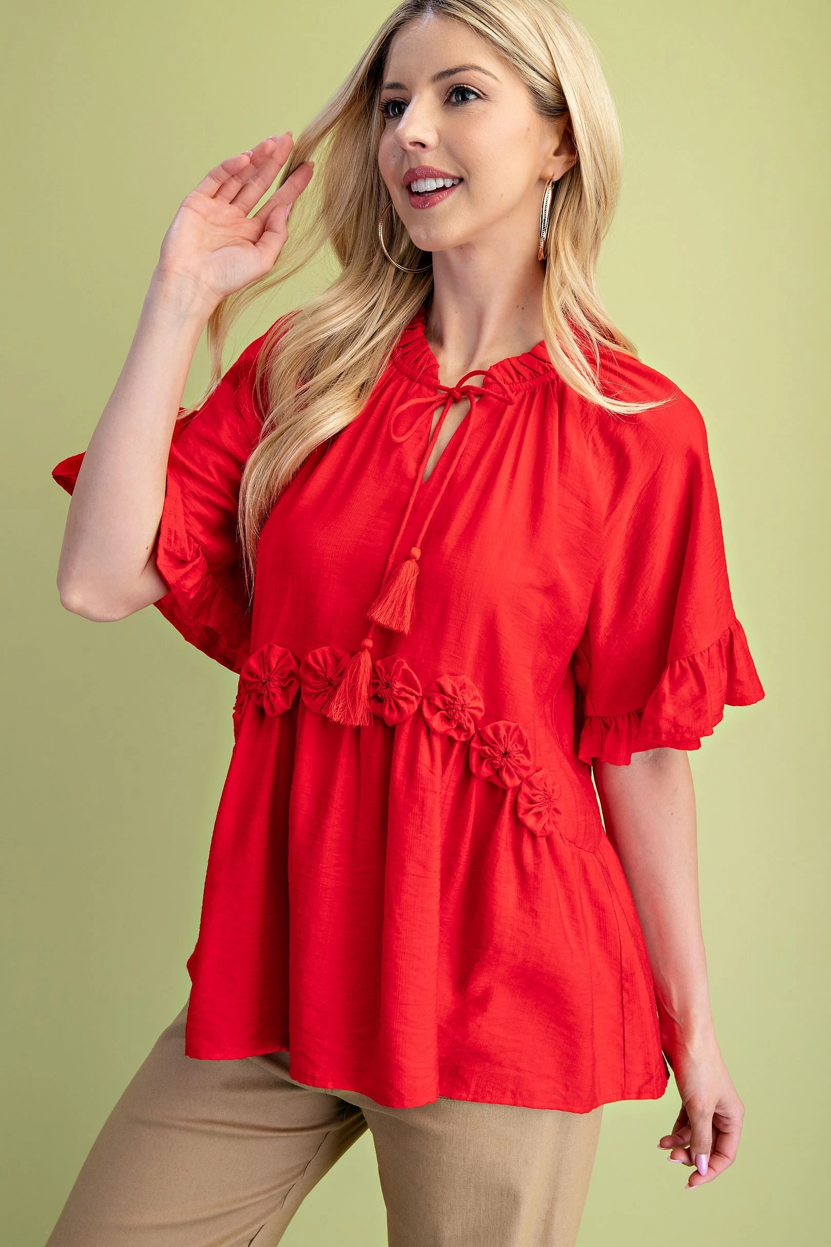 Tassel Neck Tie Short Sleeve Top with Rosettes on Front Waist and Ruffle Details