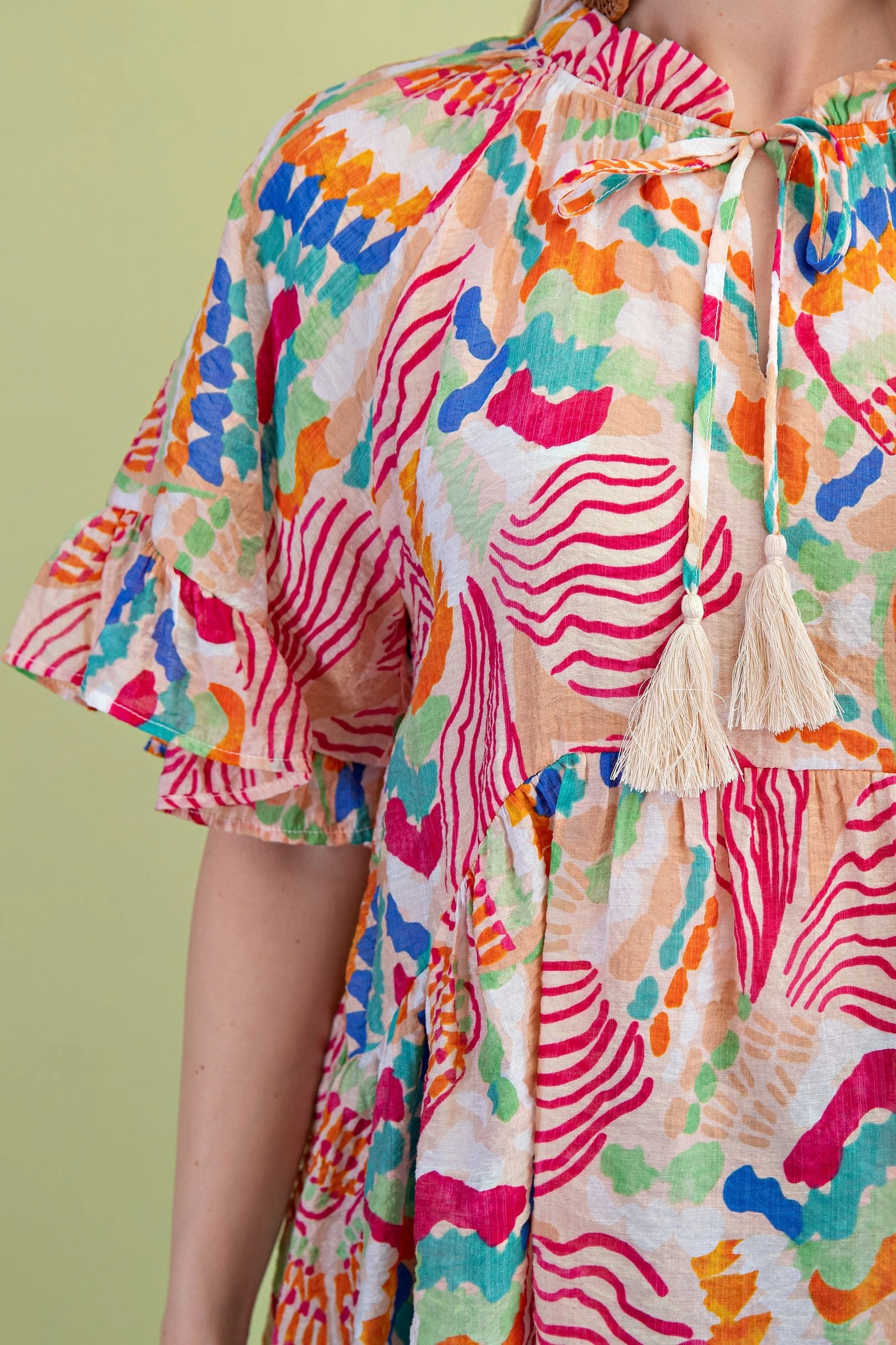 Round Neck Puff Sleeve Dress with Bow Details on Front