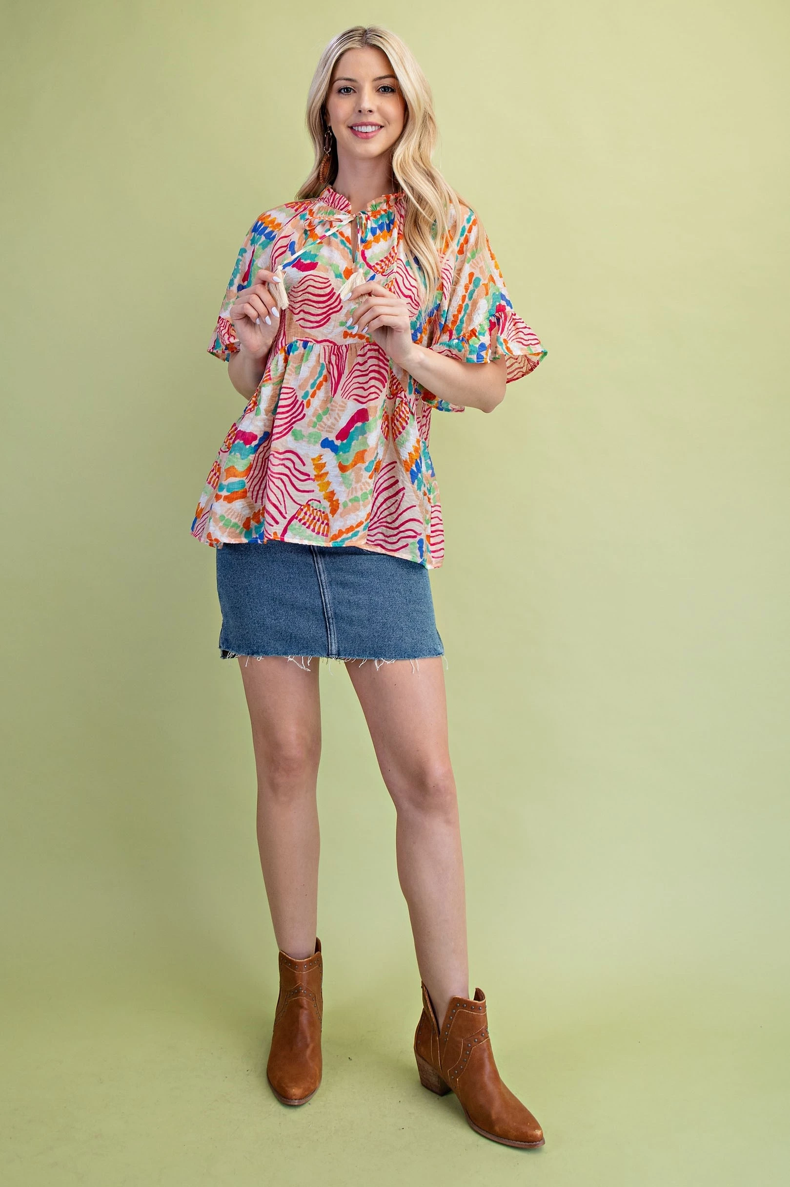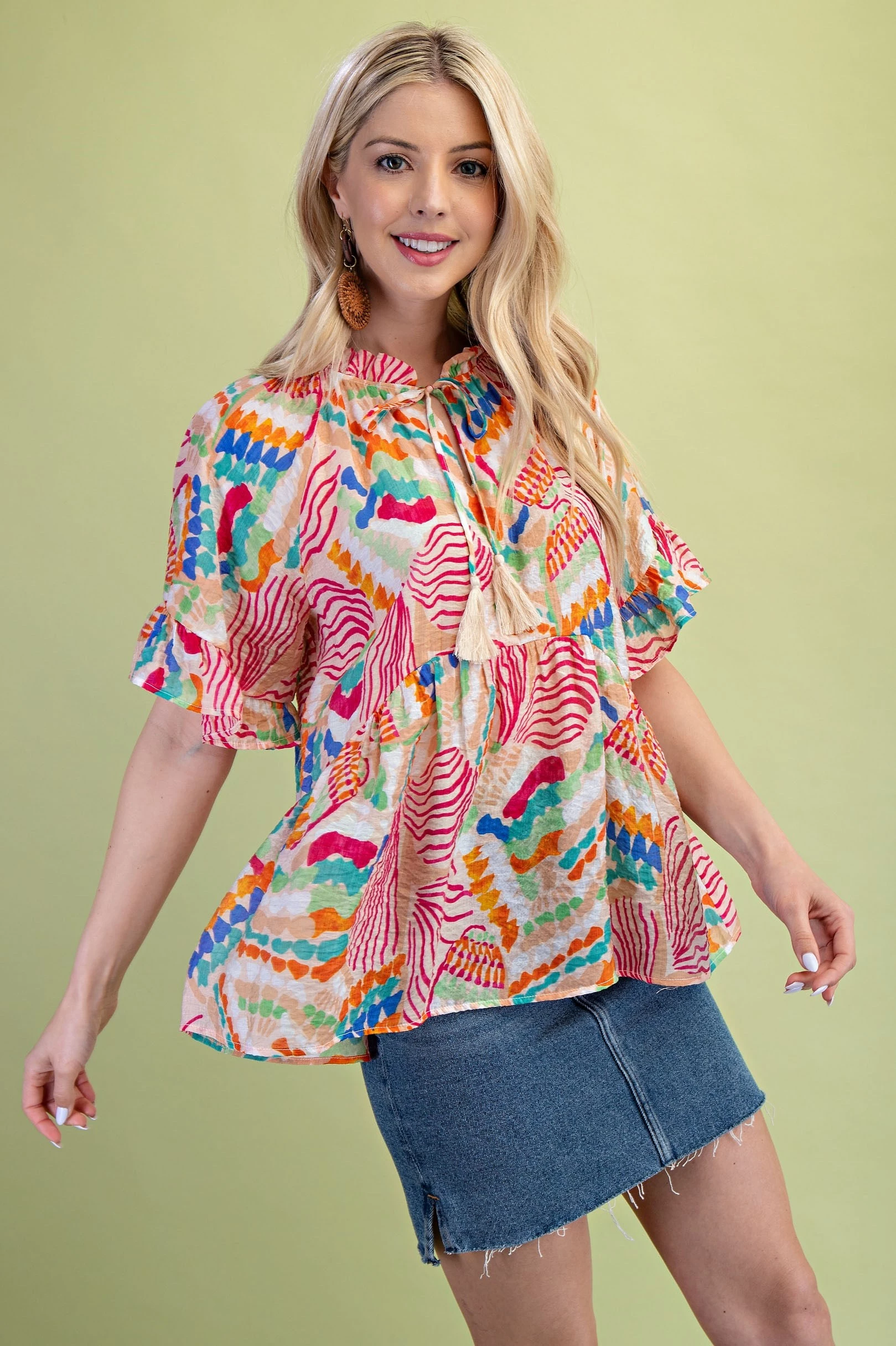 Patchwork Print Mixed and Elastic Waist Shorts with Side Pockets and Waist Tie