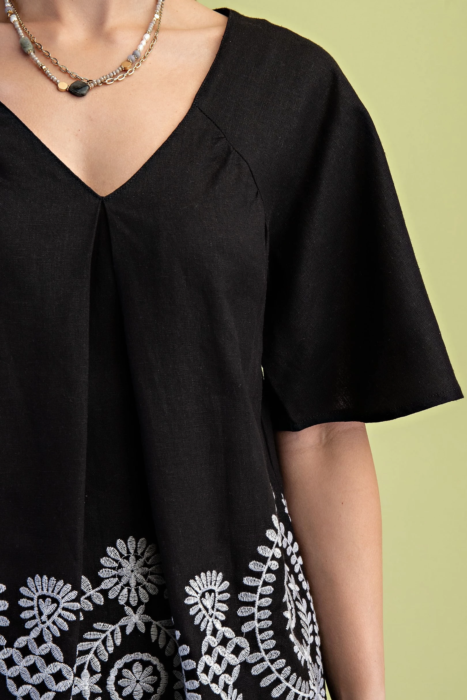Embroidered Linen V-Neck Top with Short Sleeves