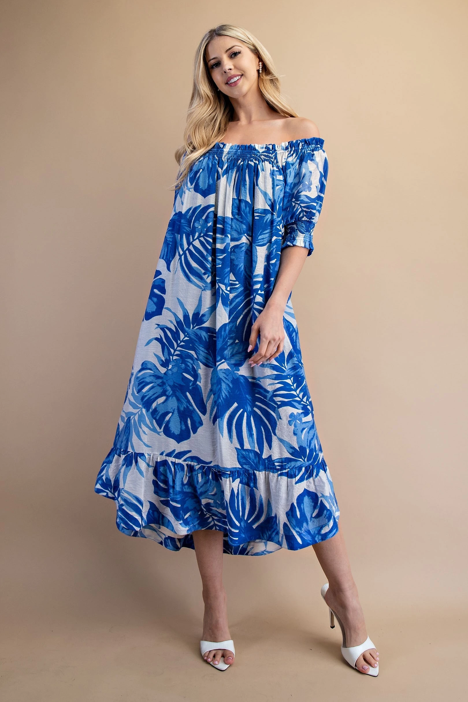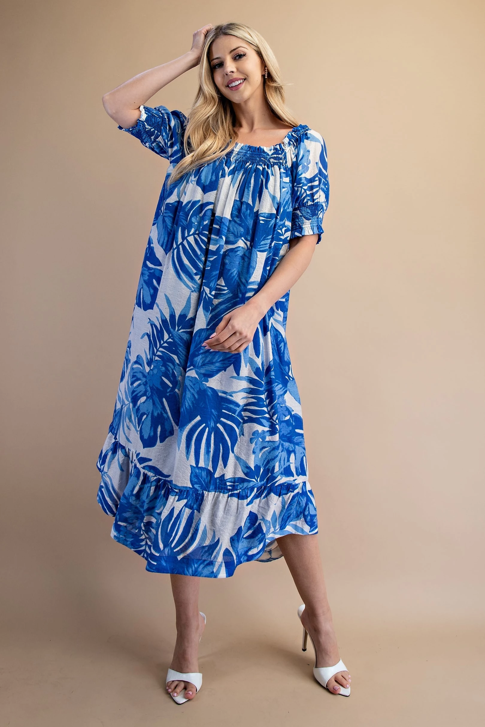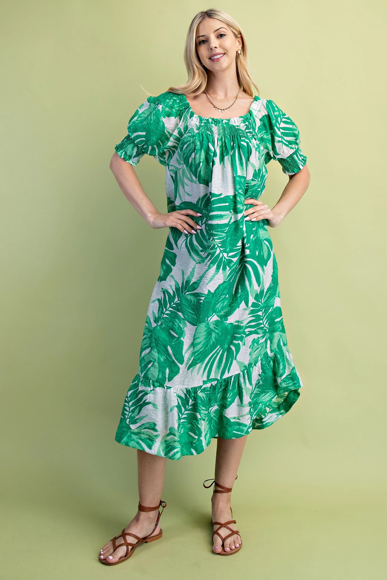 Vibrant Palm Print Square Neck Midi Dress with Smocking Details