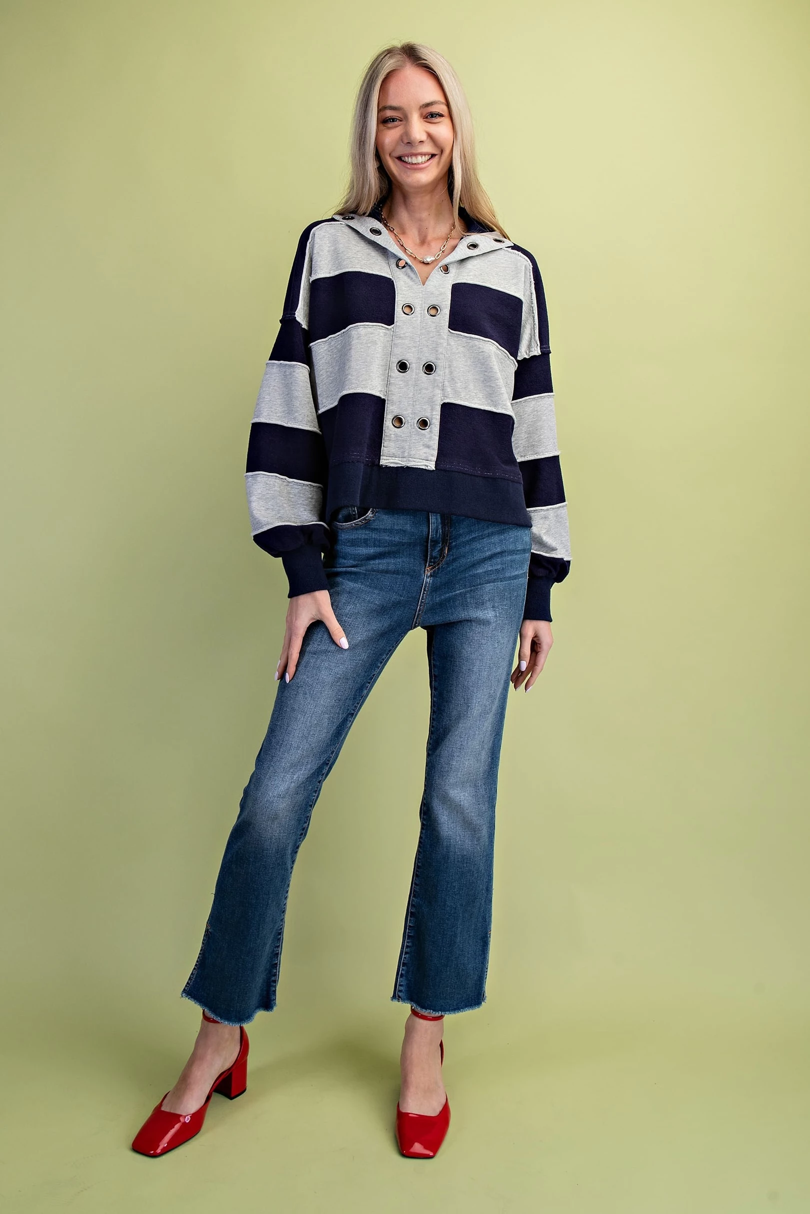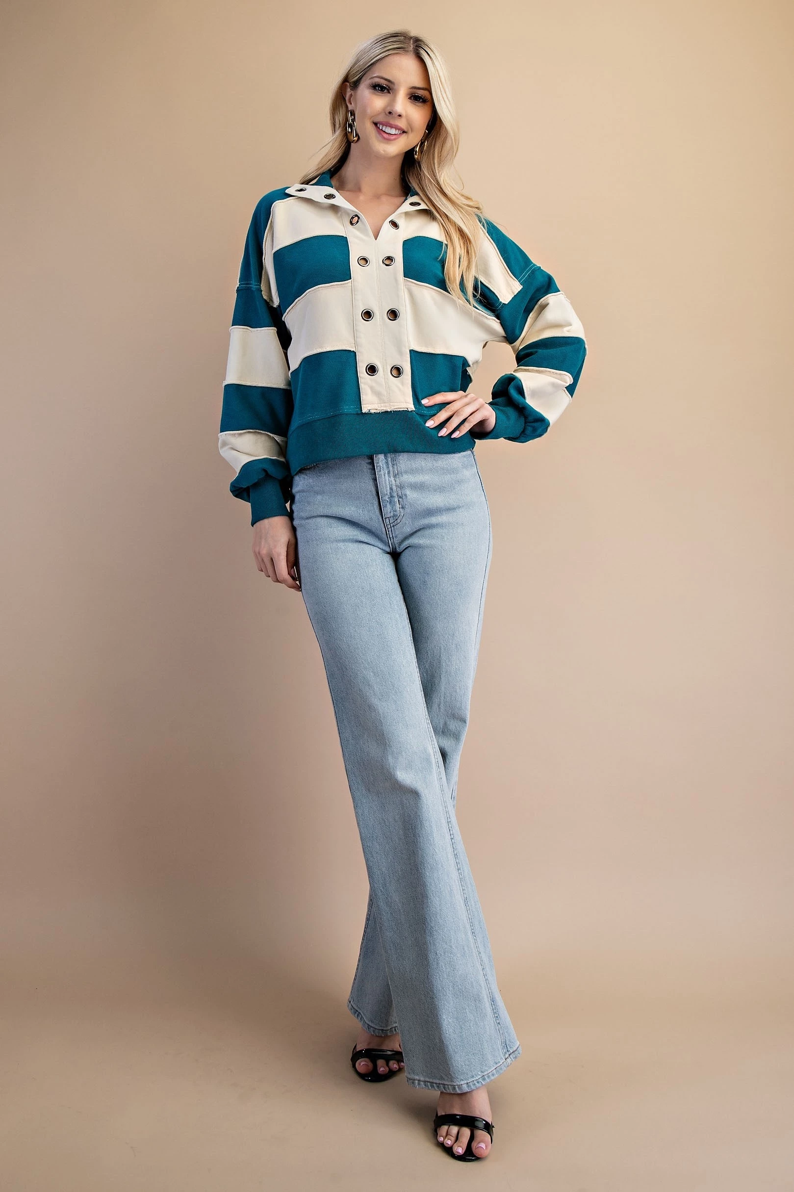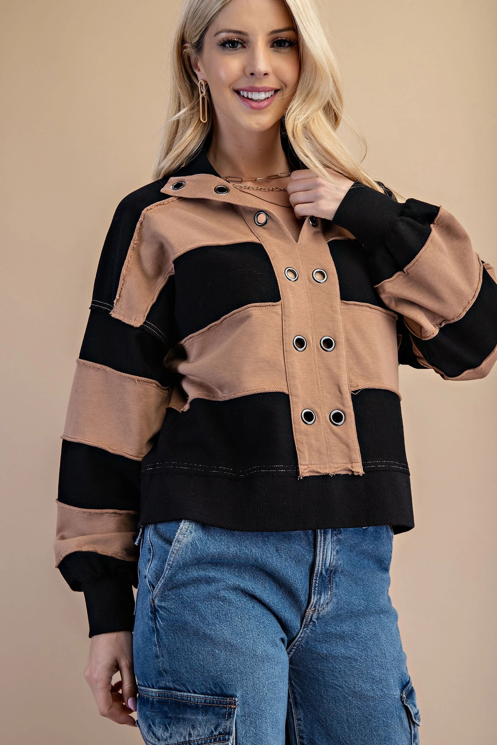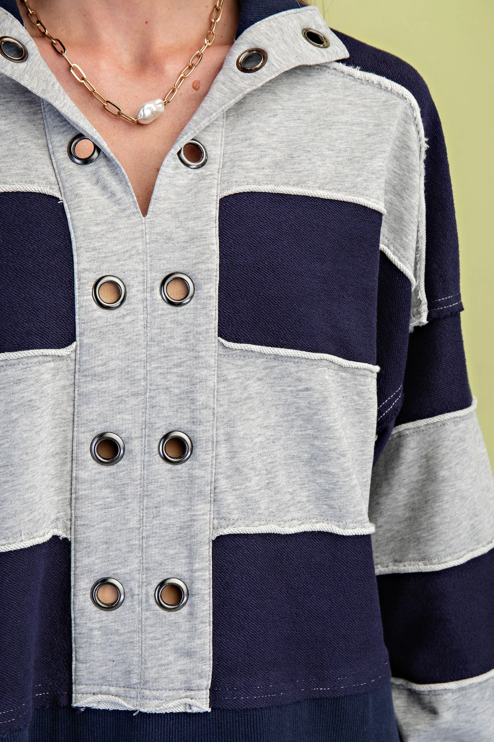 Striped Texture Mixed Rugby Style Sweatshirt with Grommet Details