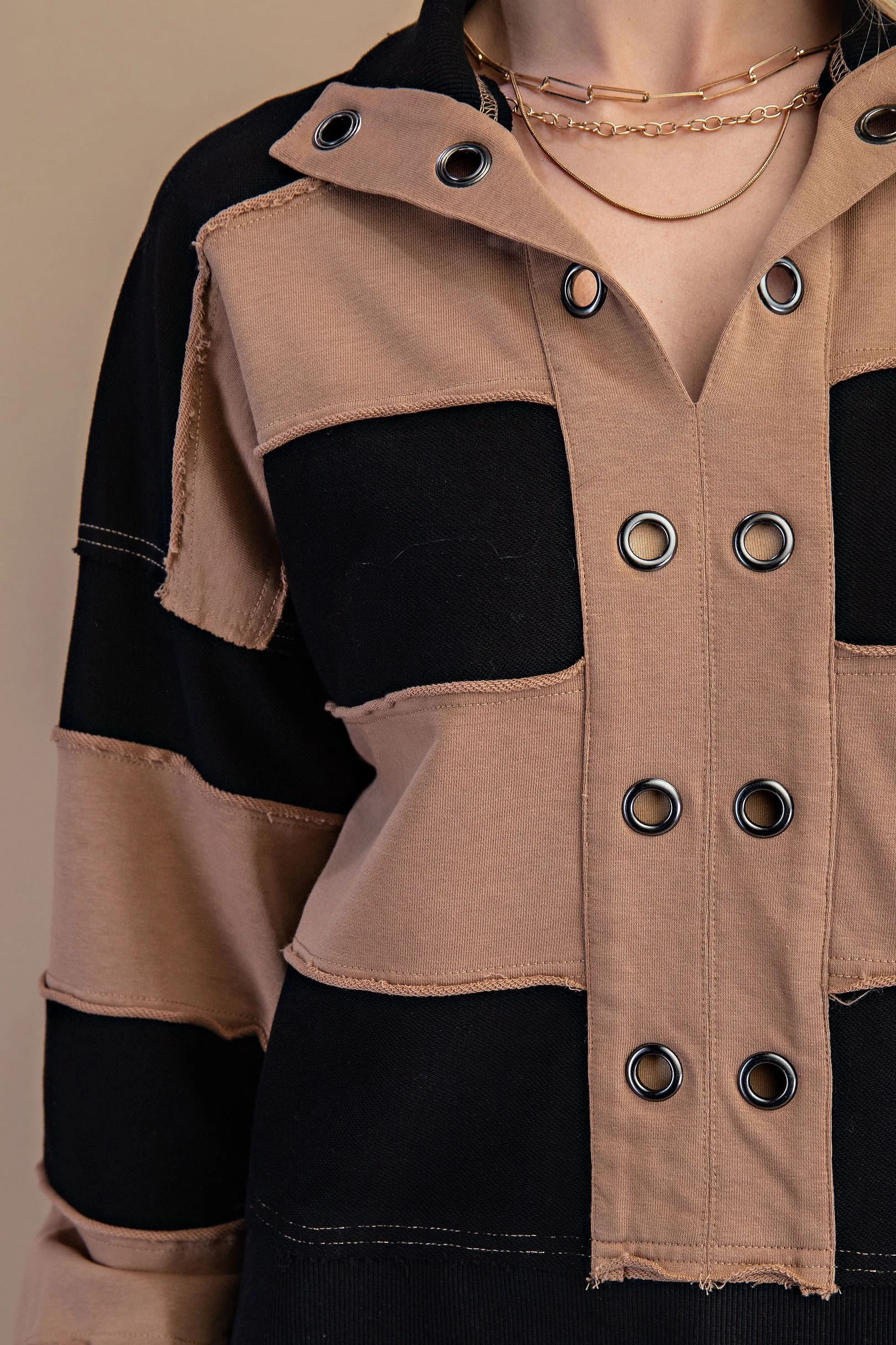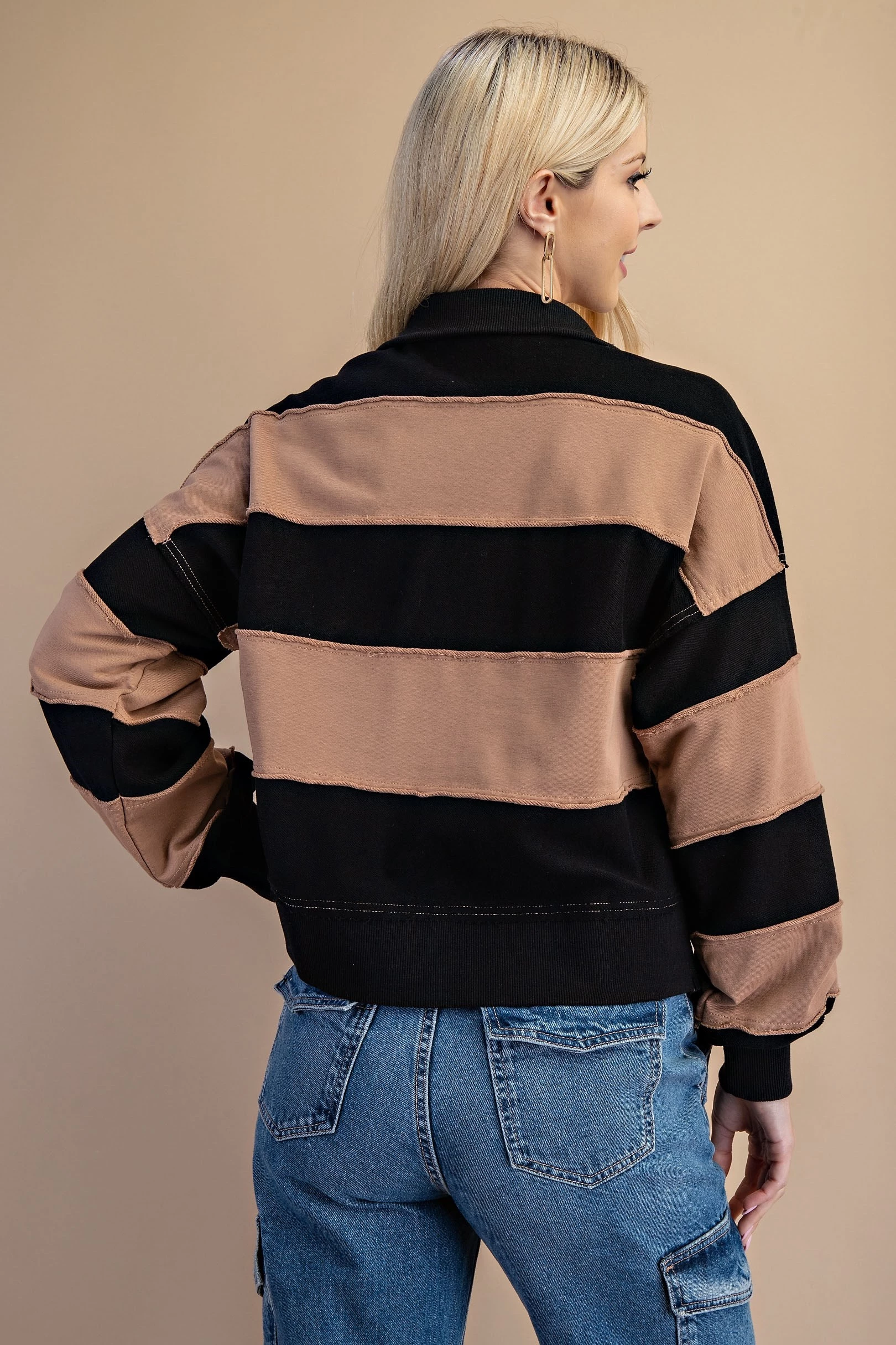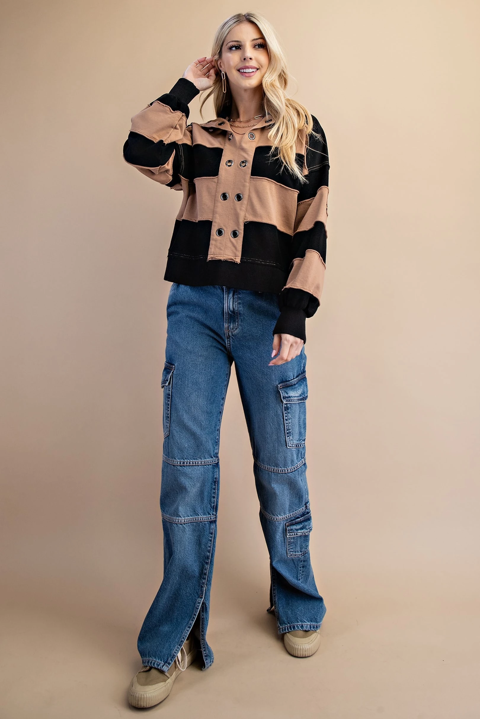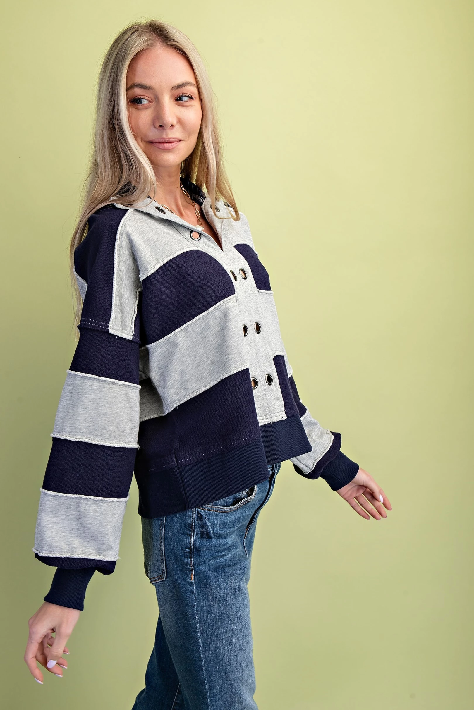 Striped Texture Mixed Rugby Style Sweatshirt with Grommet Details