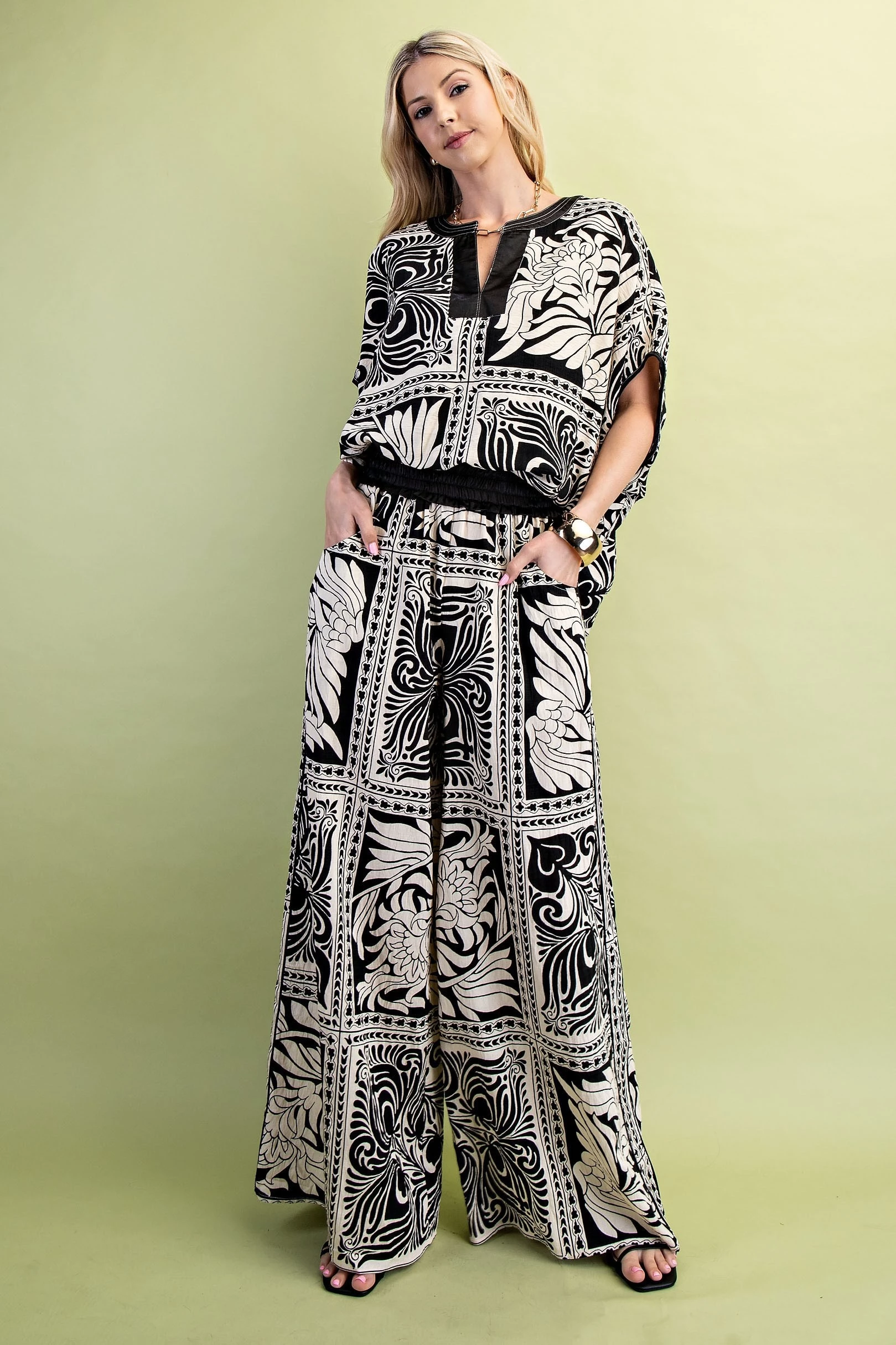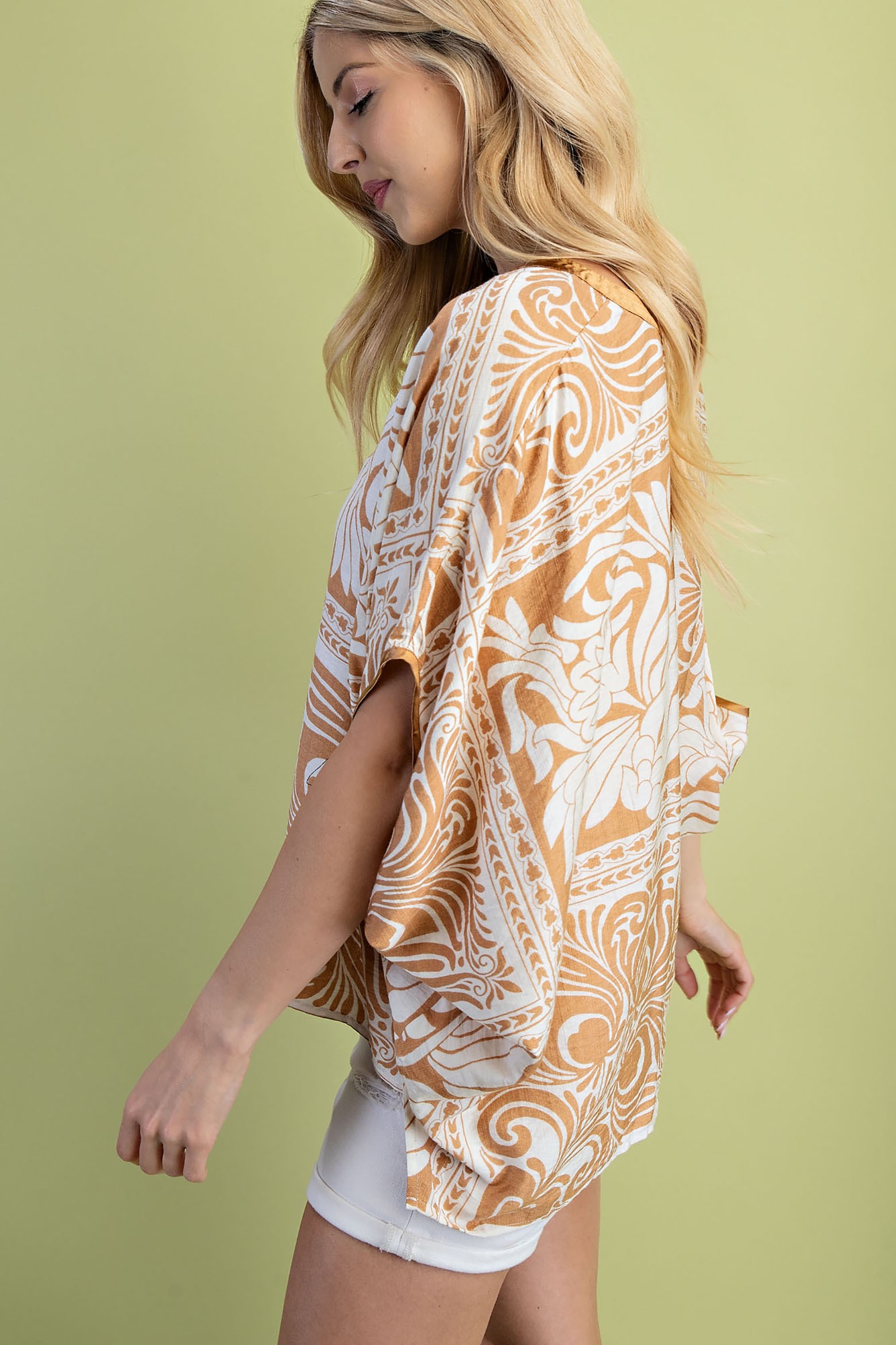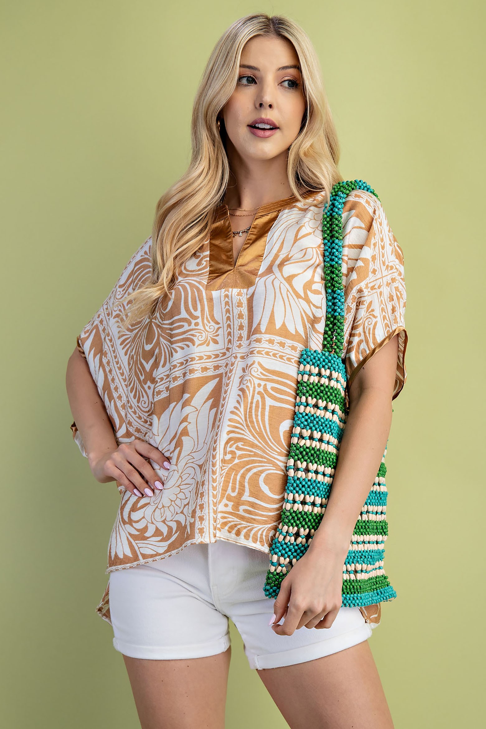Marbled Bandanna Print Dolman Sleeve Top with a Satin Trim