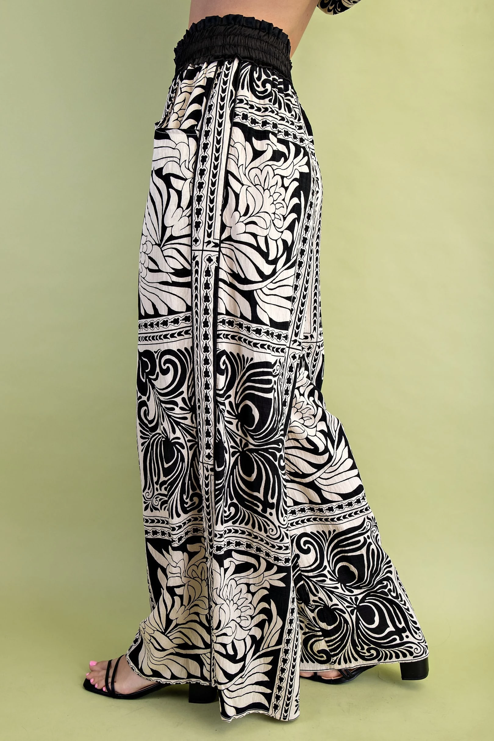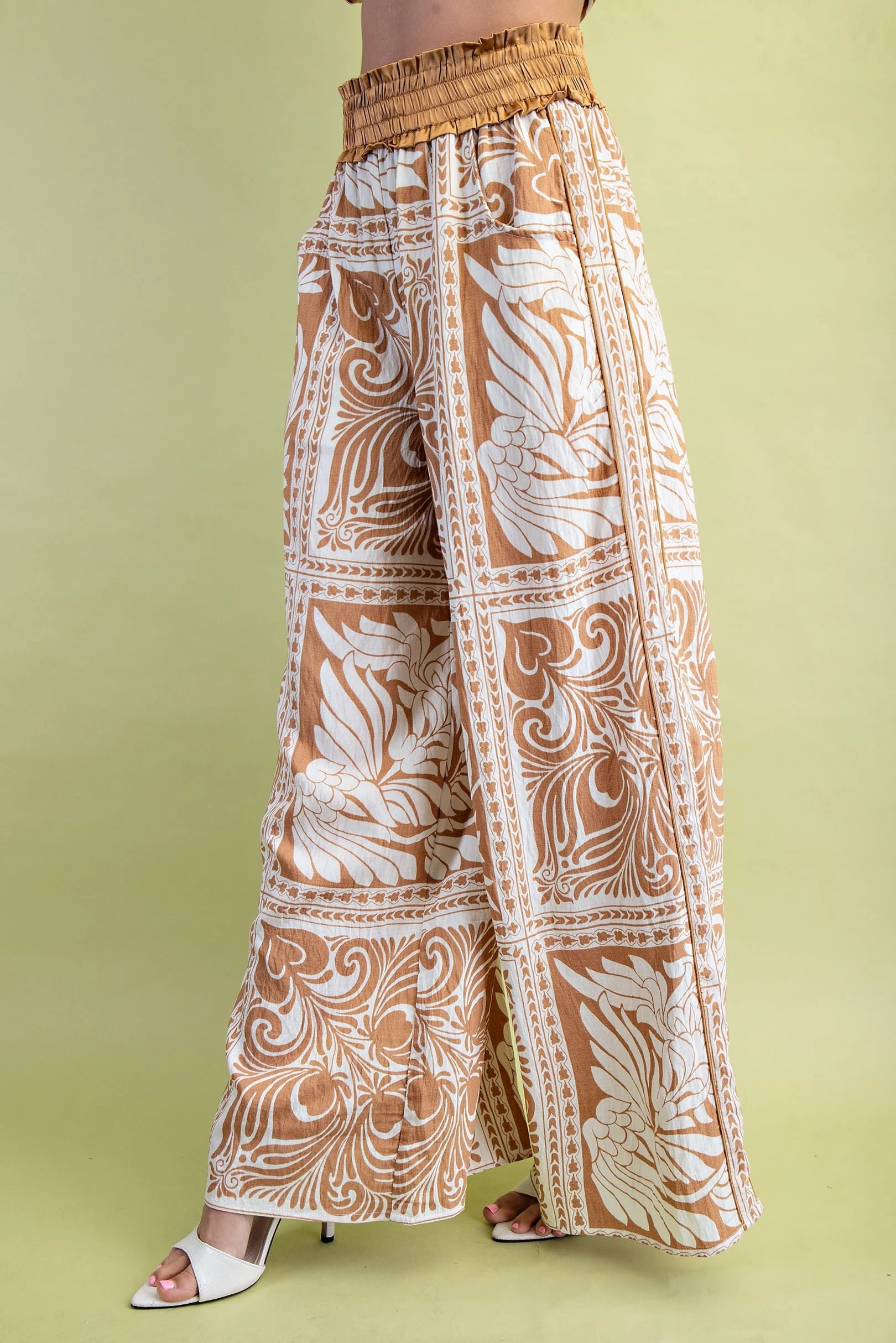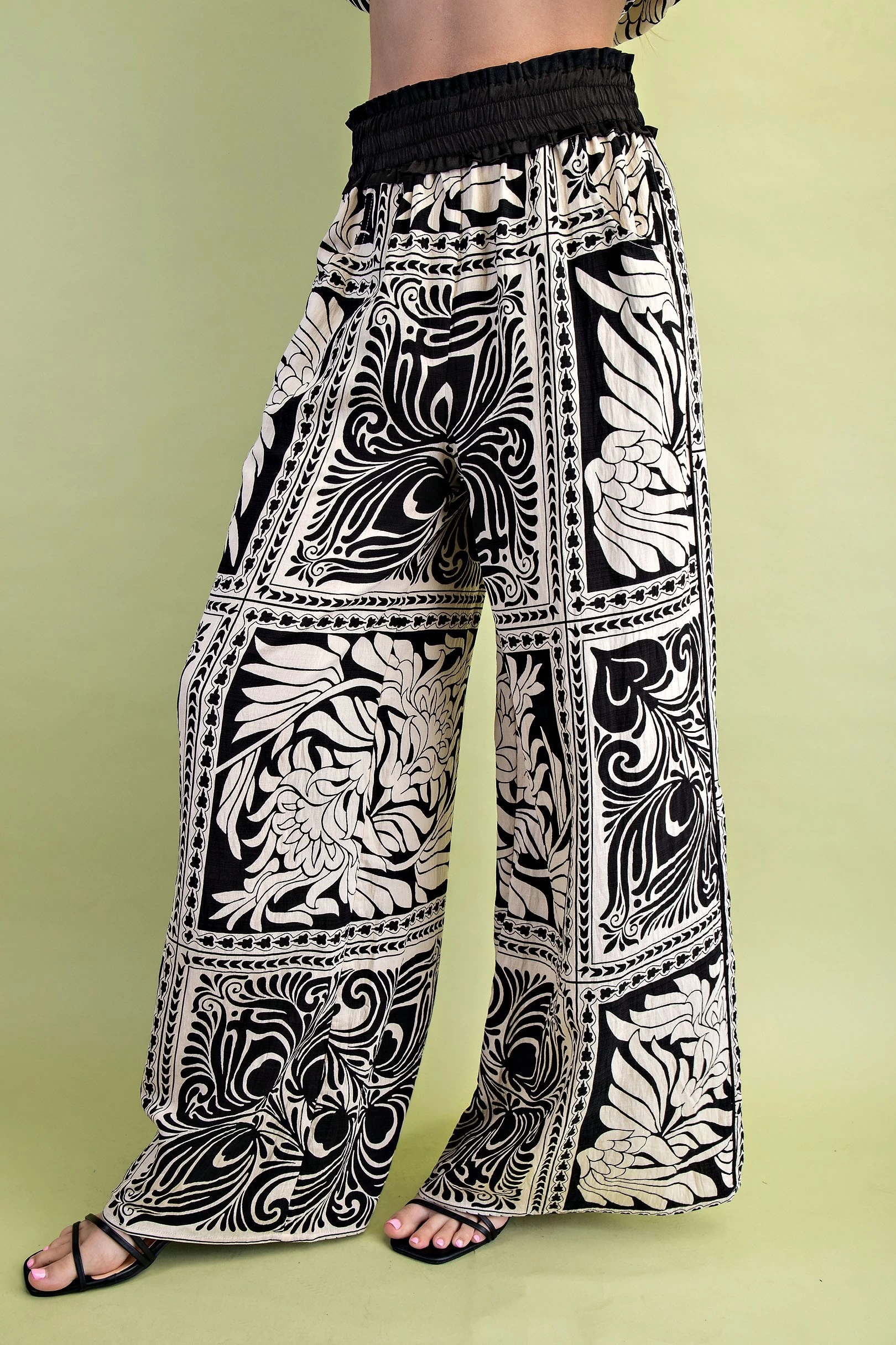 Marbled Bandanna Print Wide Leg Pants with a Satin Smocked Waist