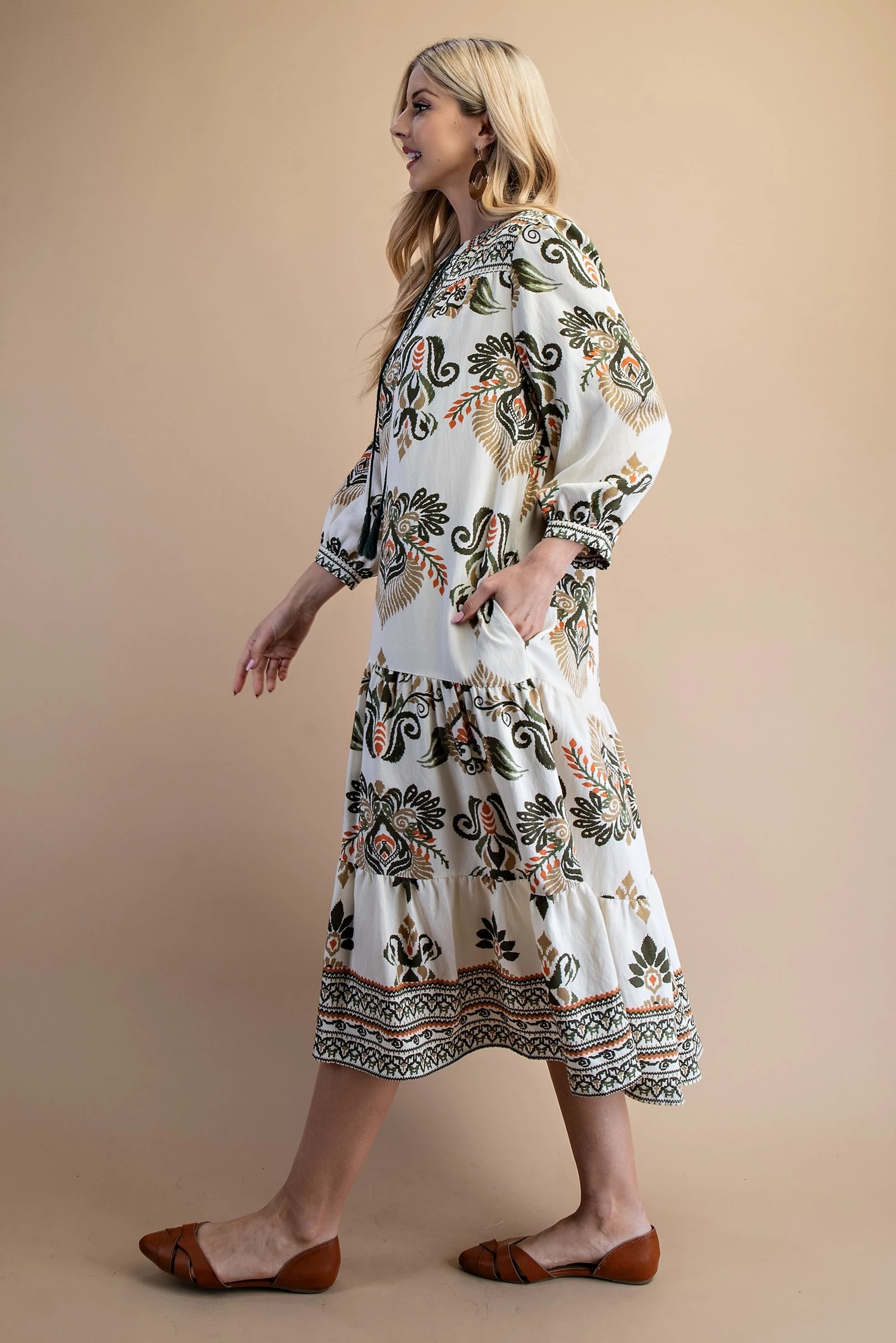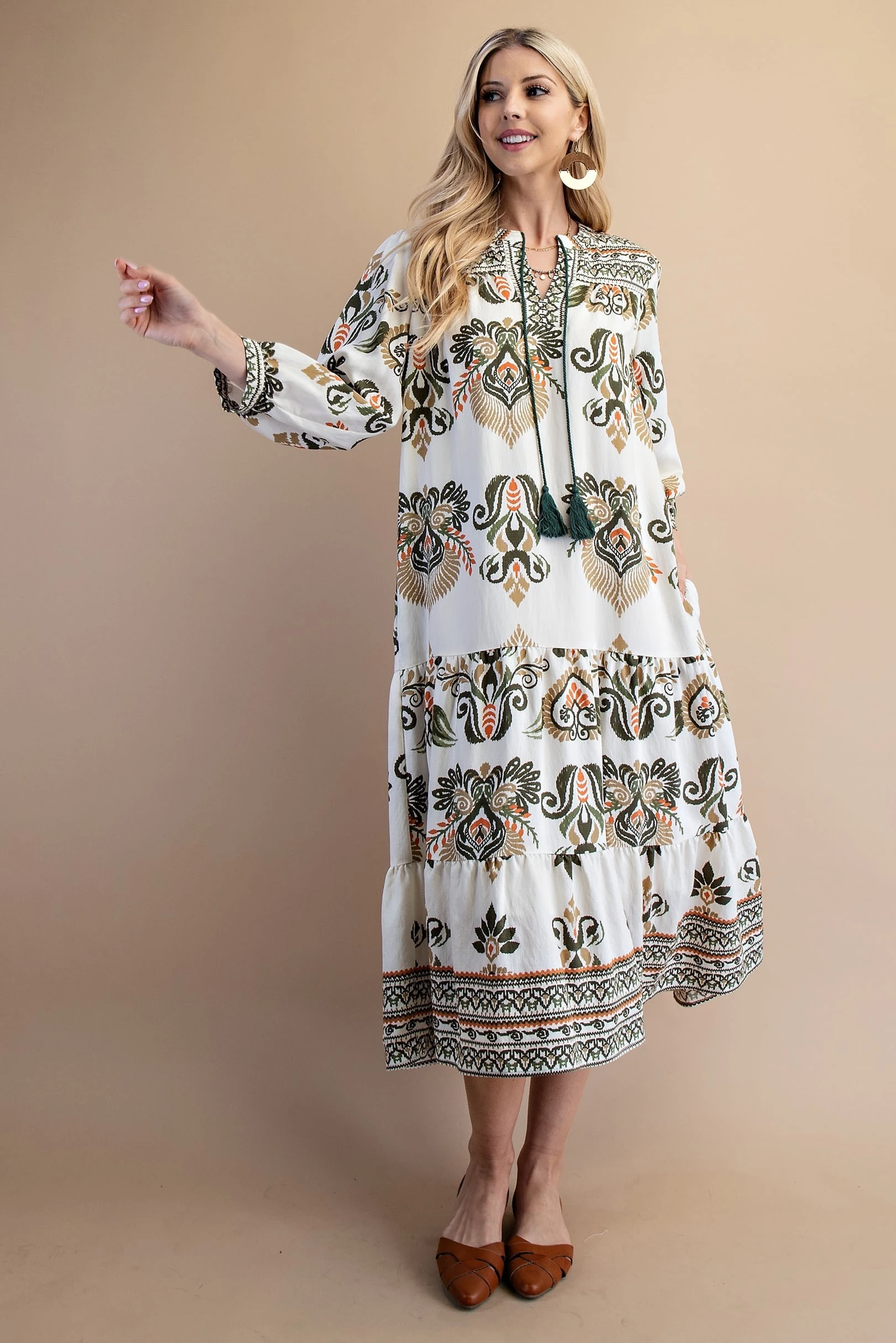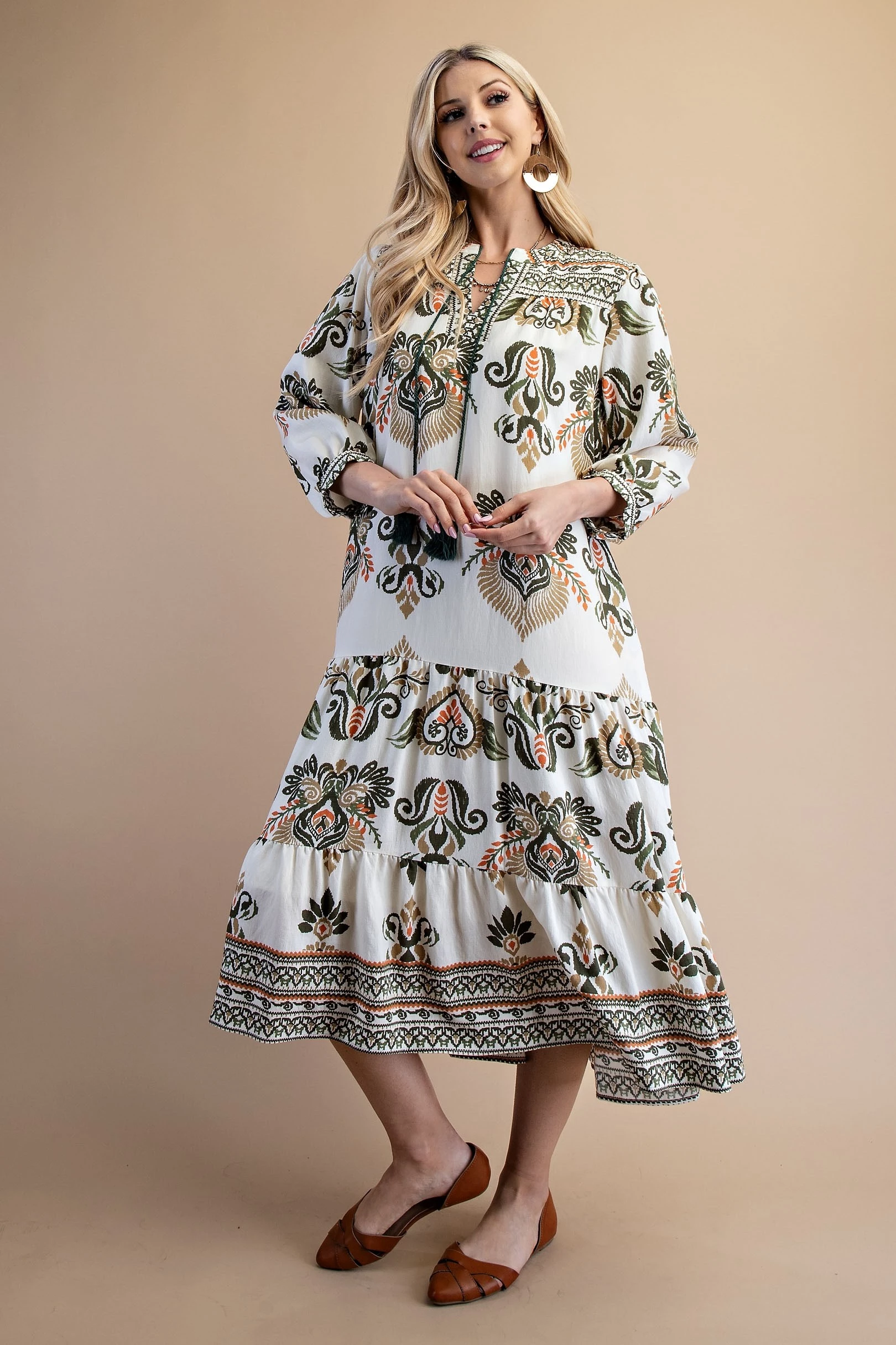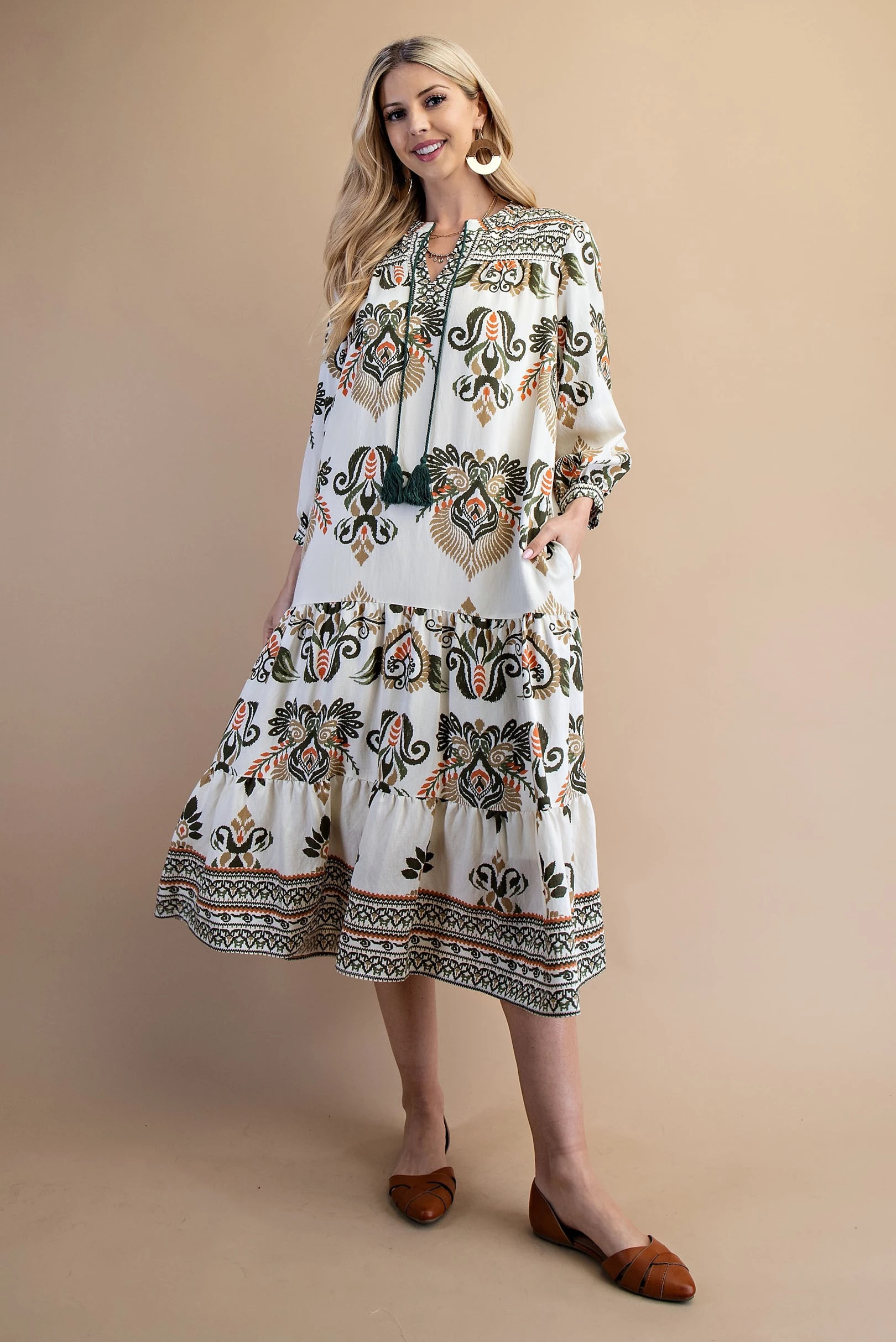 Printed Tiered 3/4 Length Sleeve Midi Dress with a Tassel Neck Tie