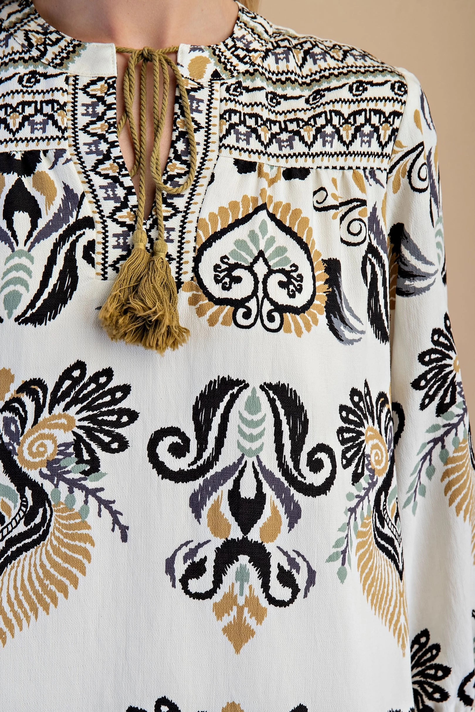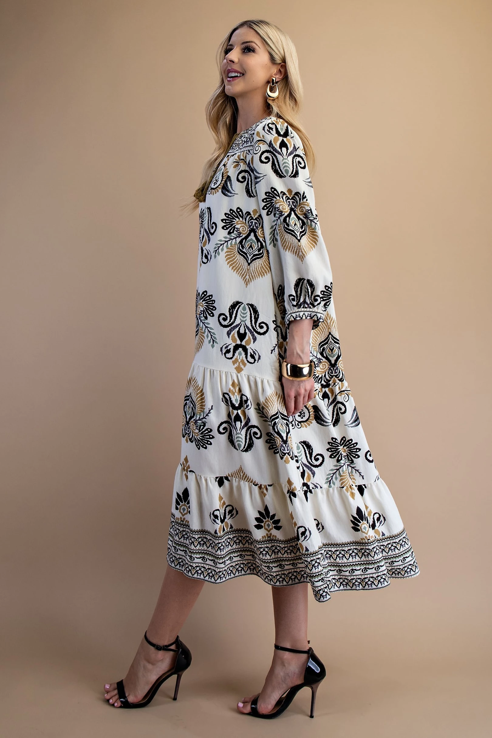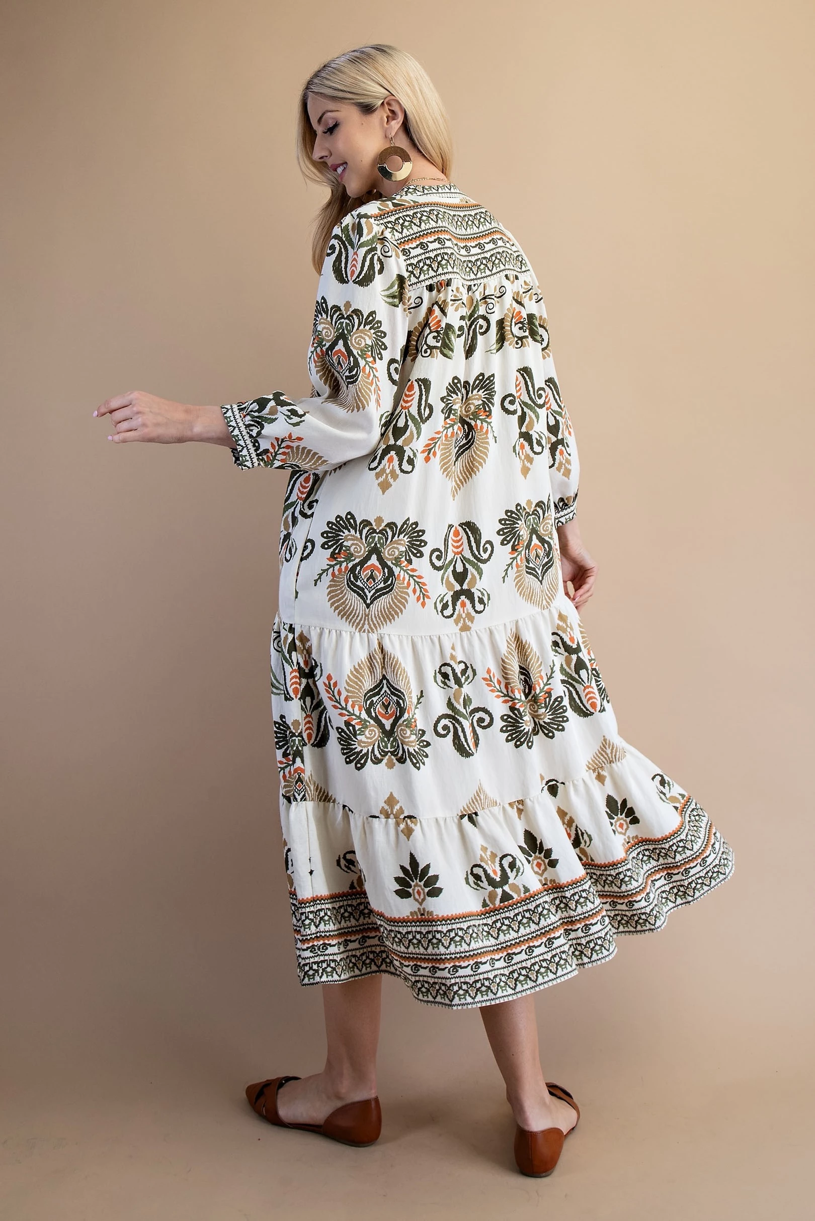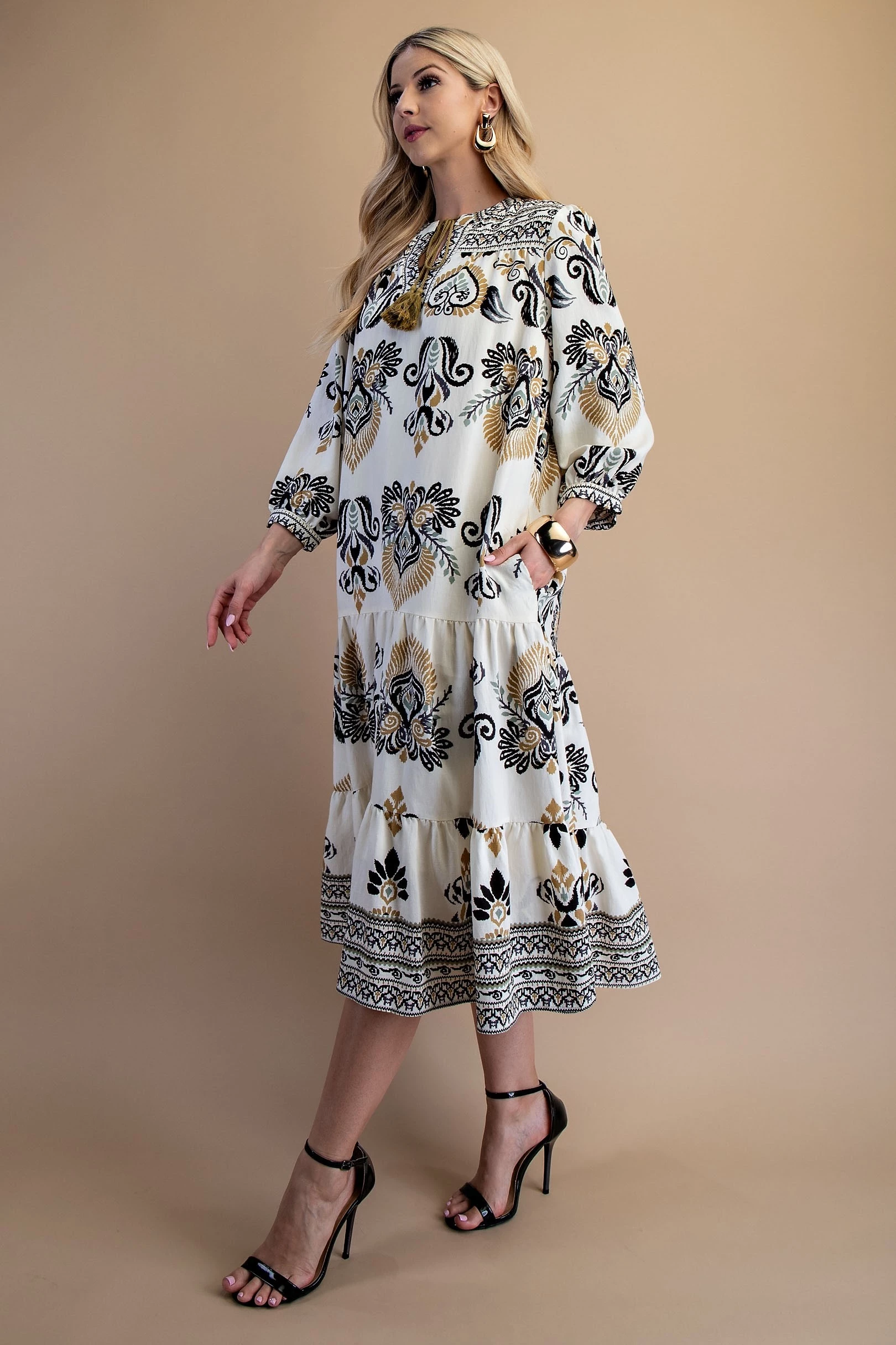 Printed Tiered 3/4 Length Sleeve Midi Dress with a Tassel Neck Tie