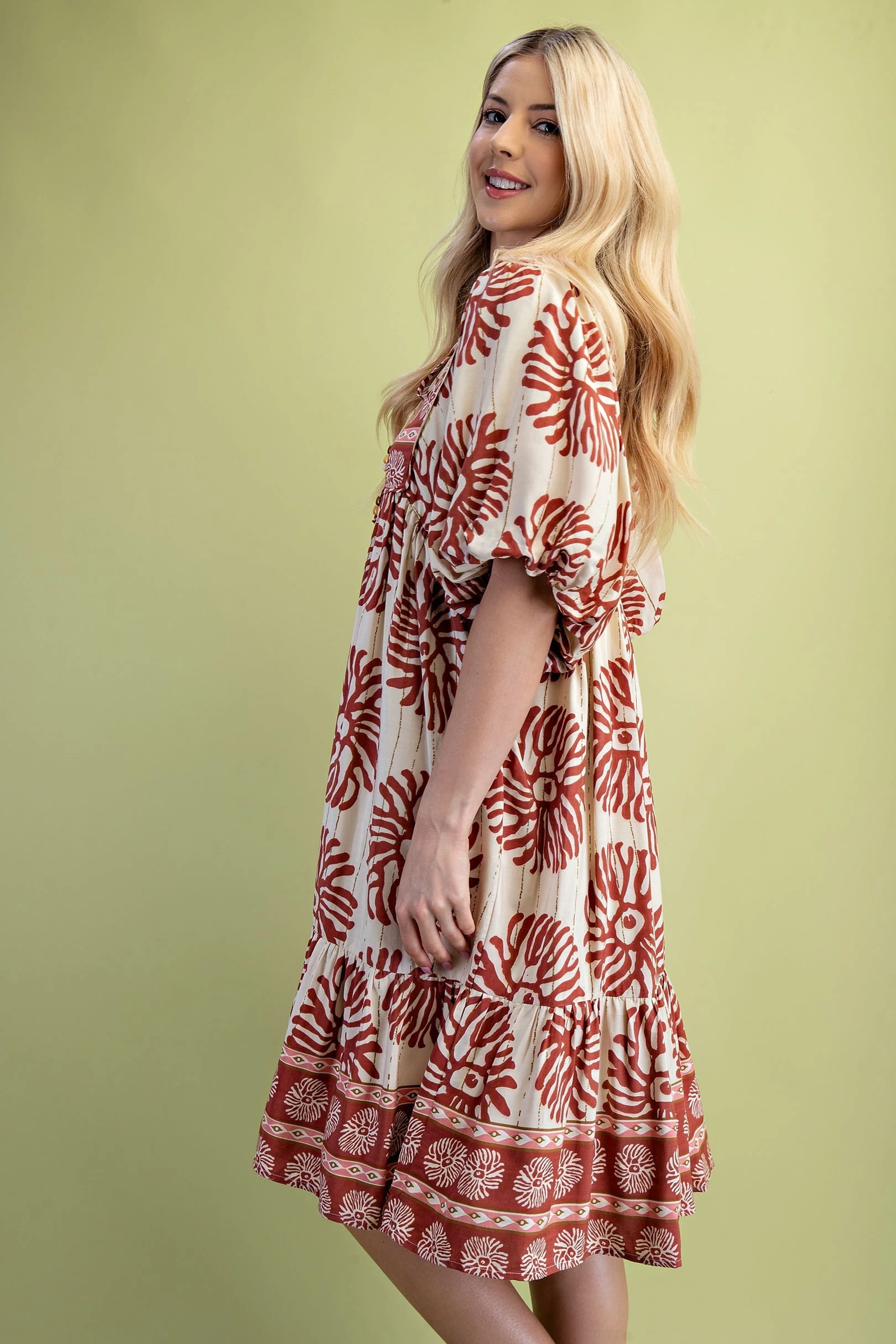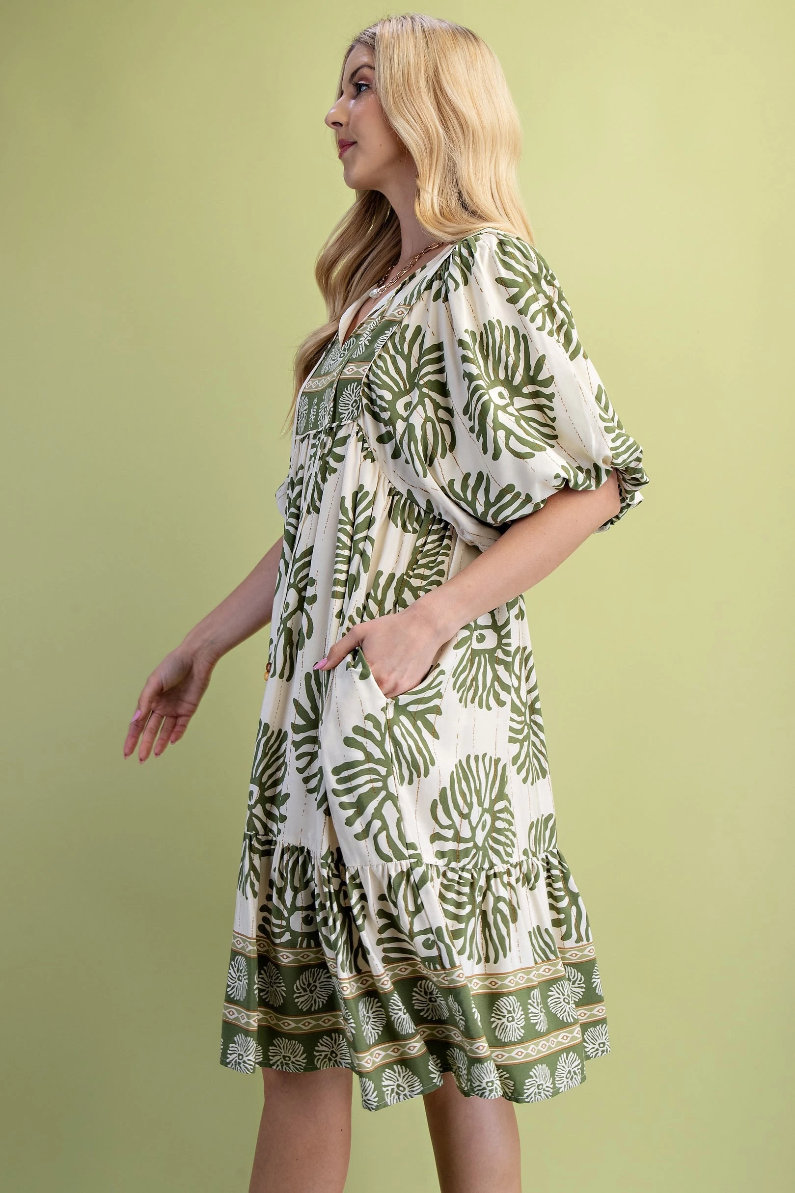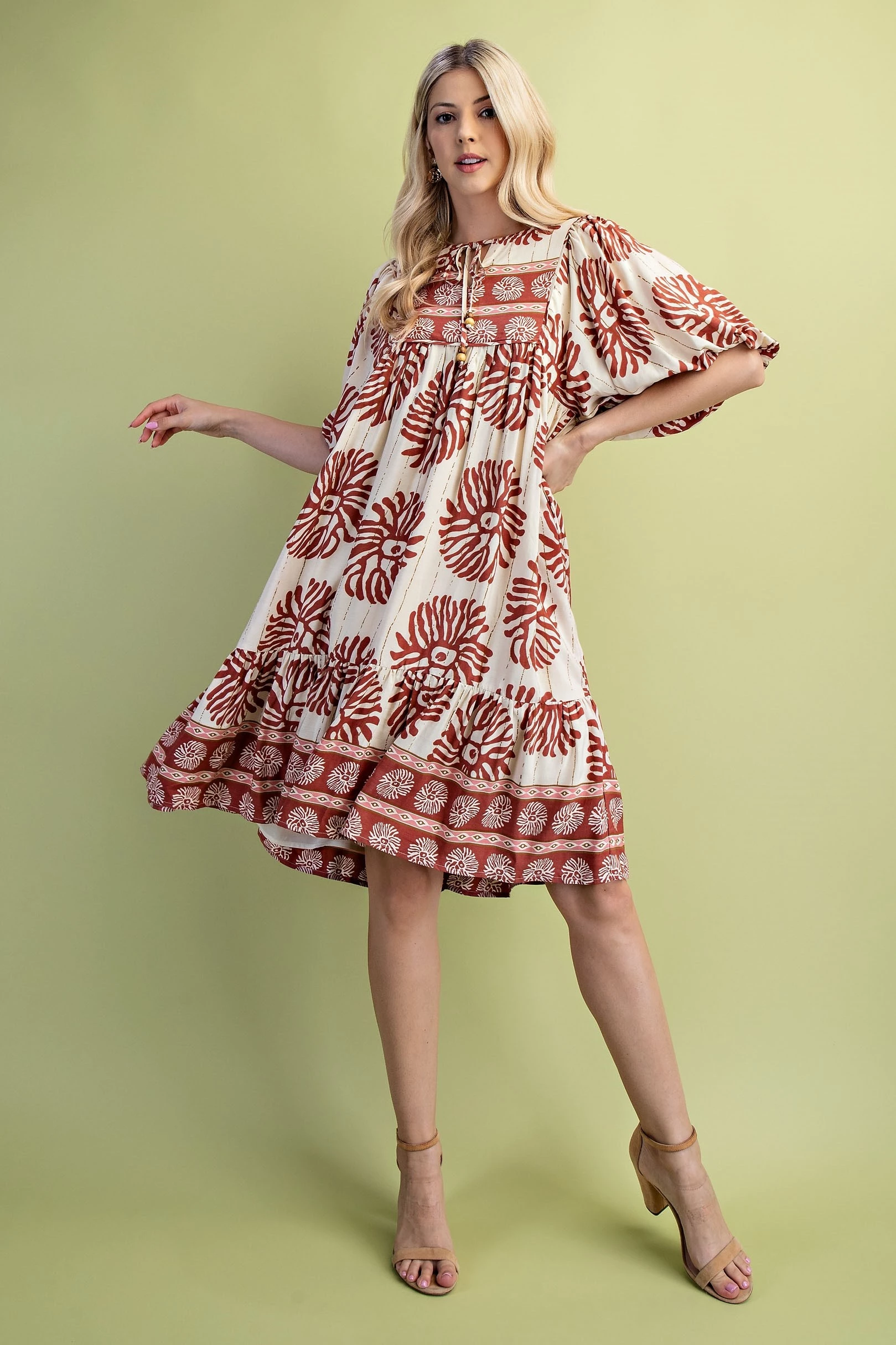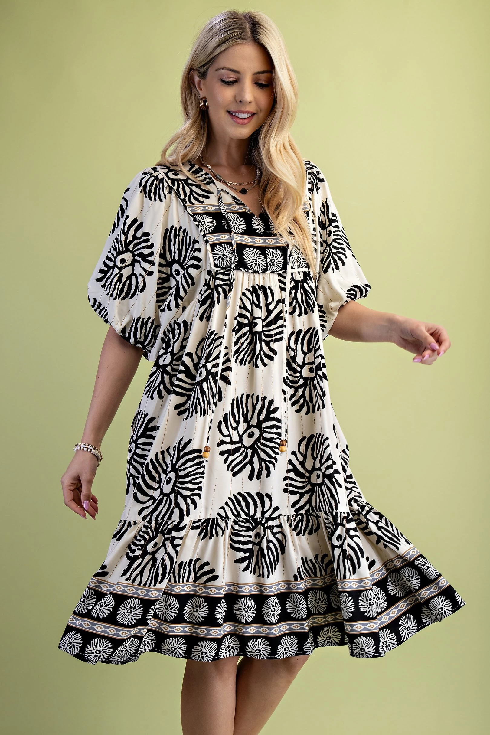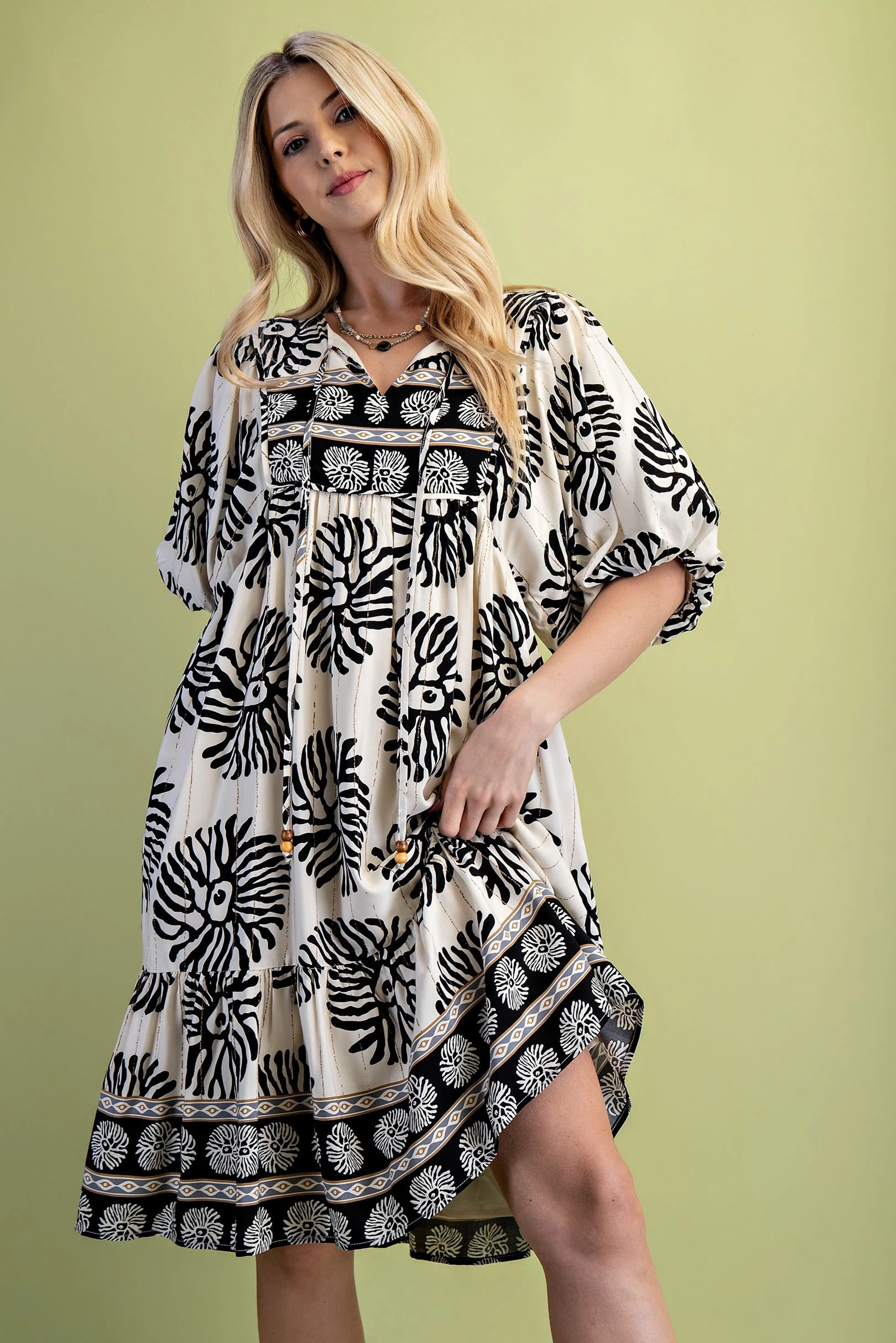 Mixed Print Mini Dress with a Beaded Neck Tie