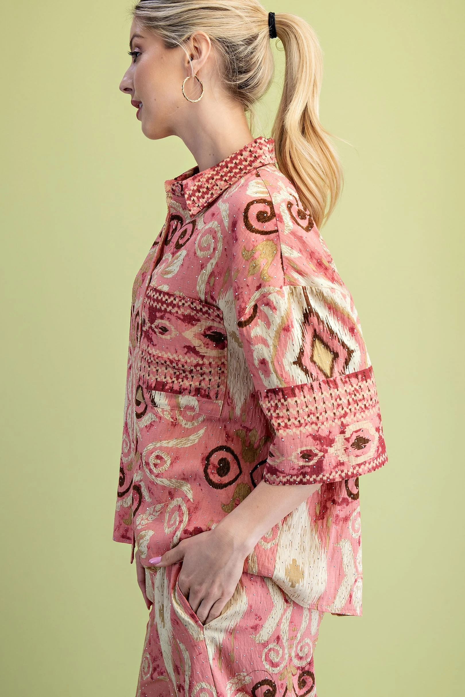Printed Button Down Crop Top with Rhinestone Embellishments