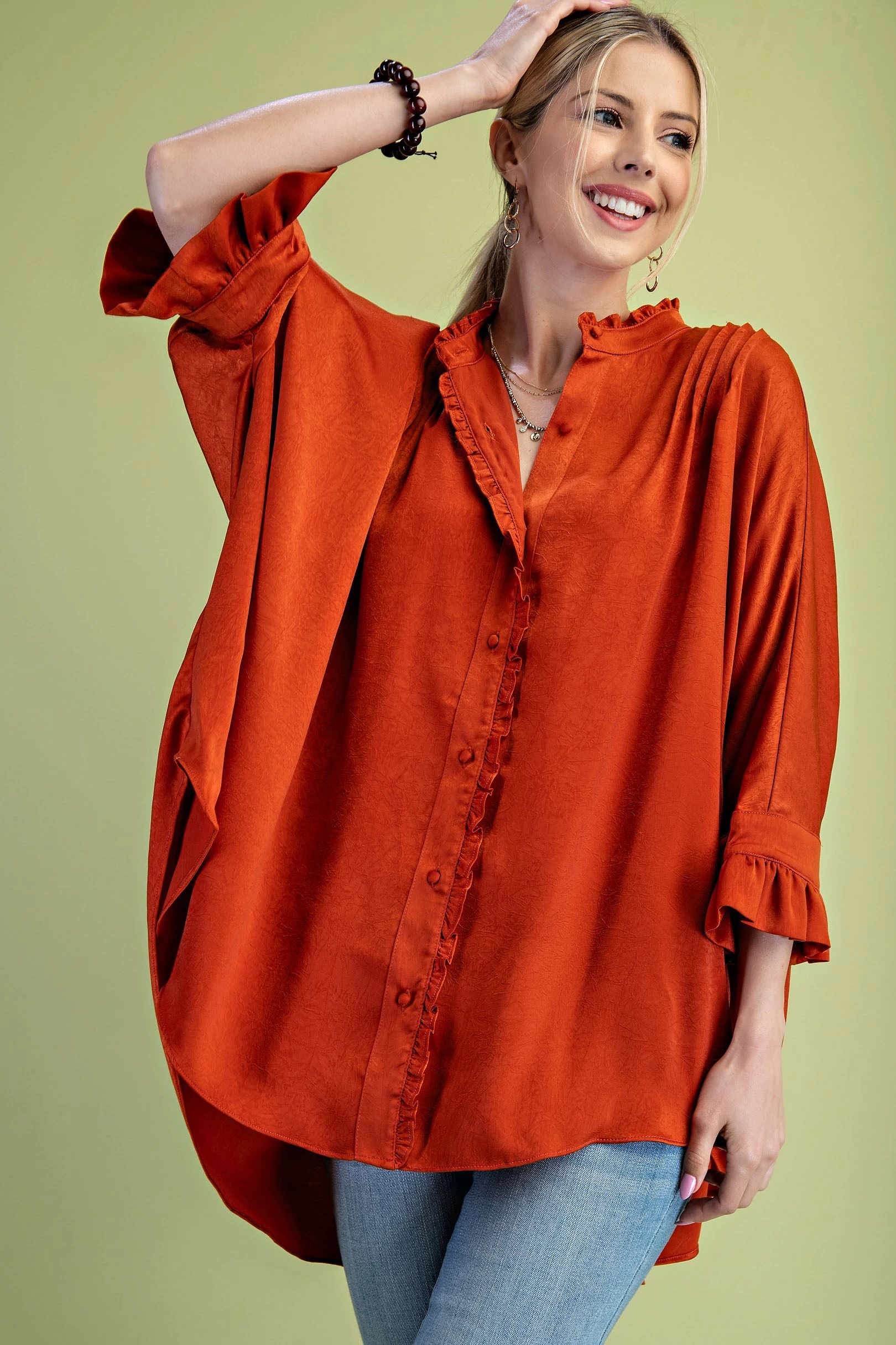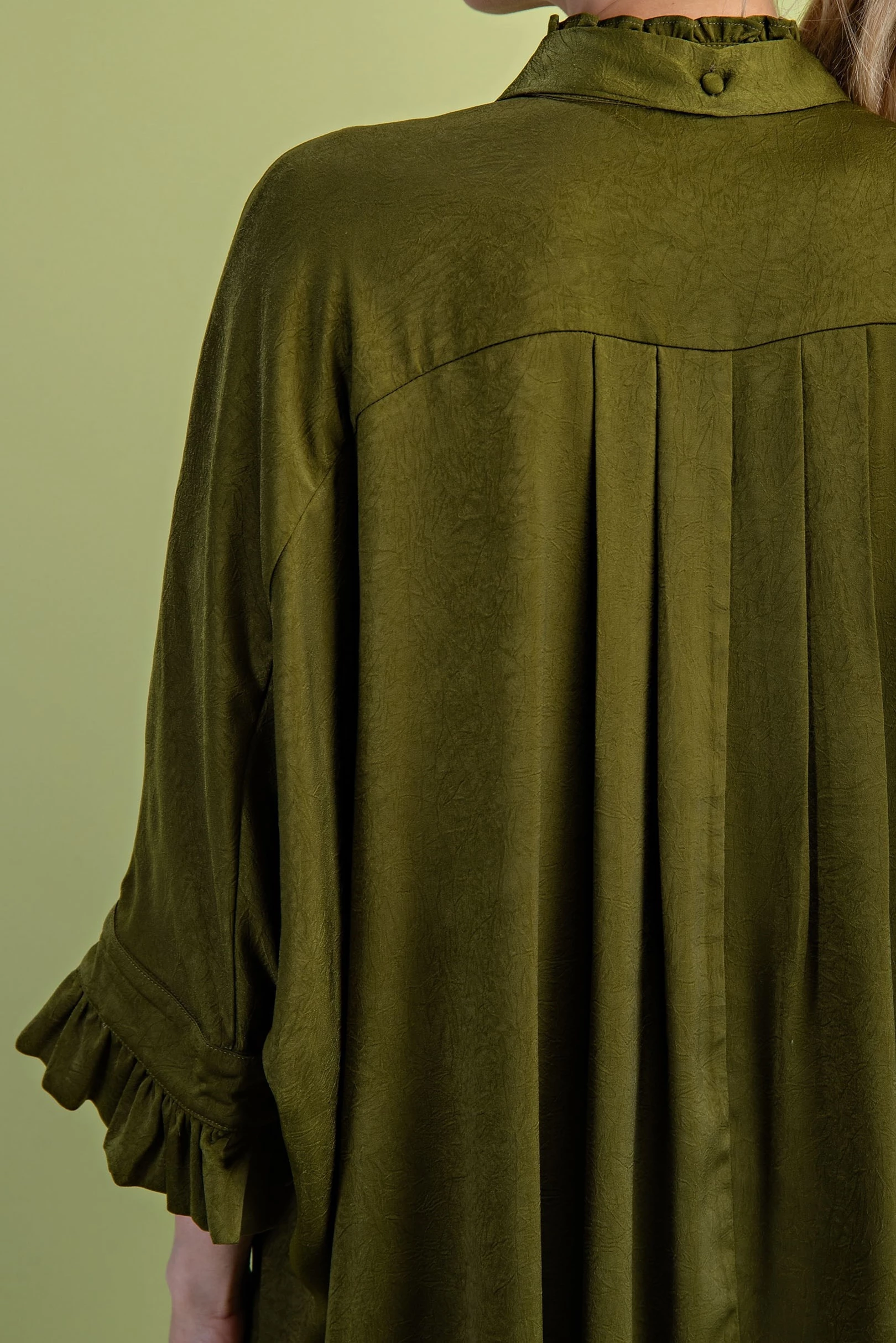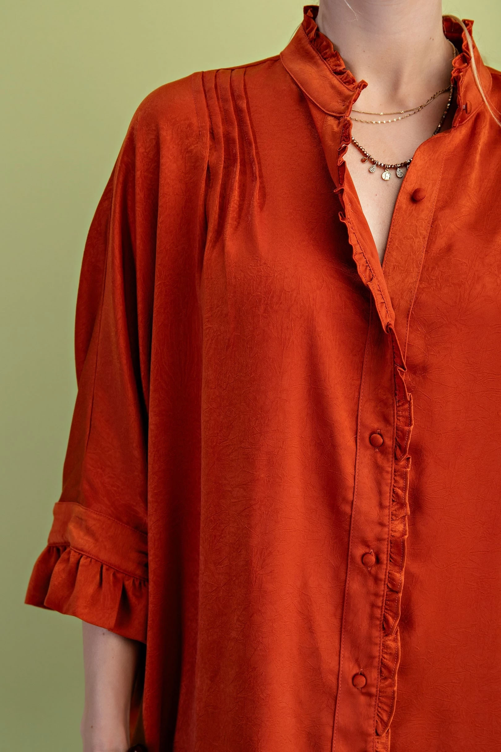 Ruffled Satin Button Down Blouse with a Detachable Neck Tie and Pintuck Details