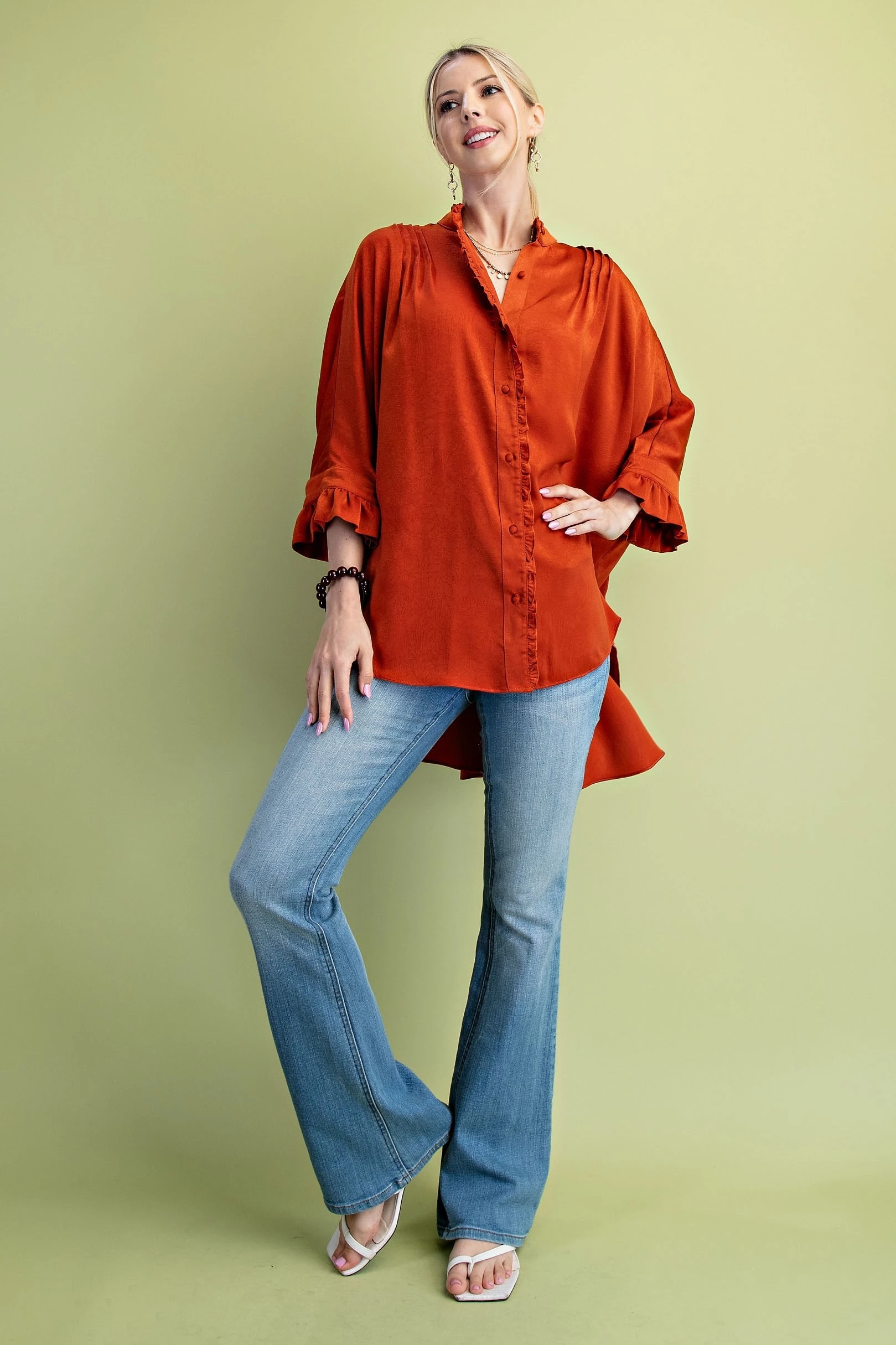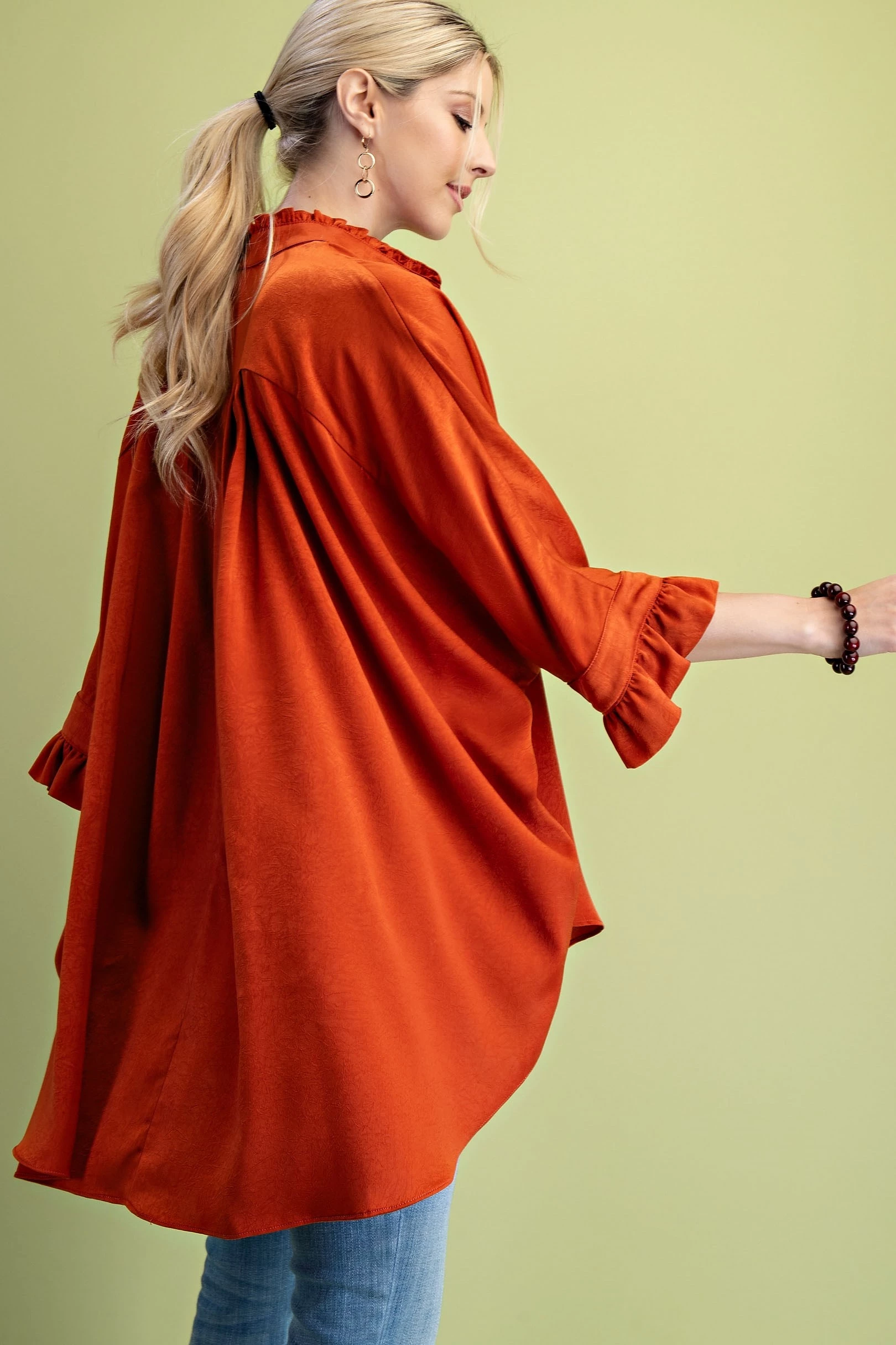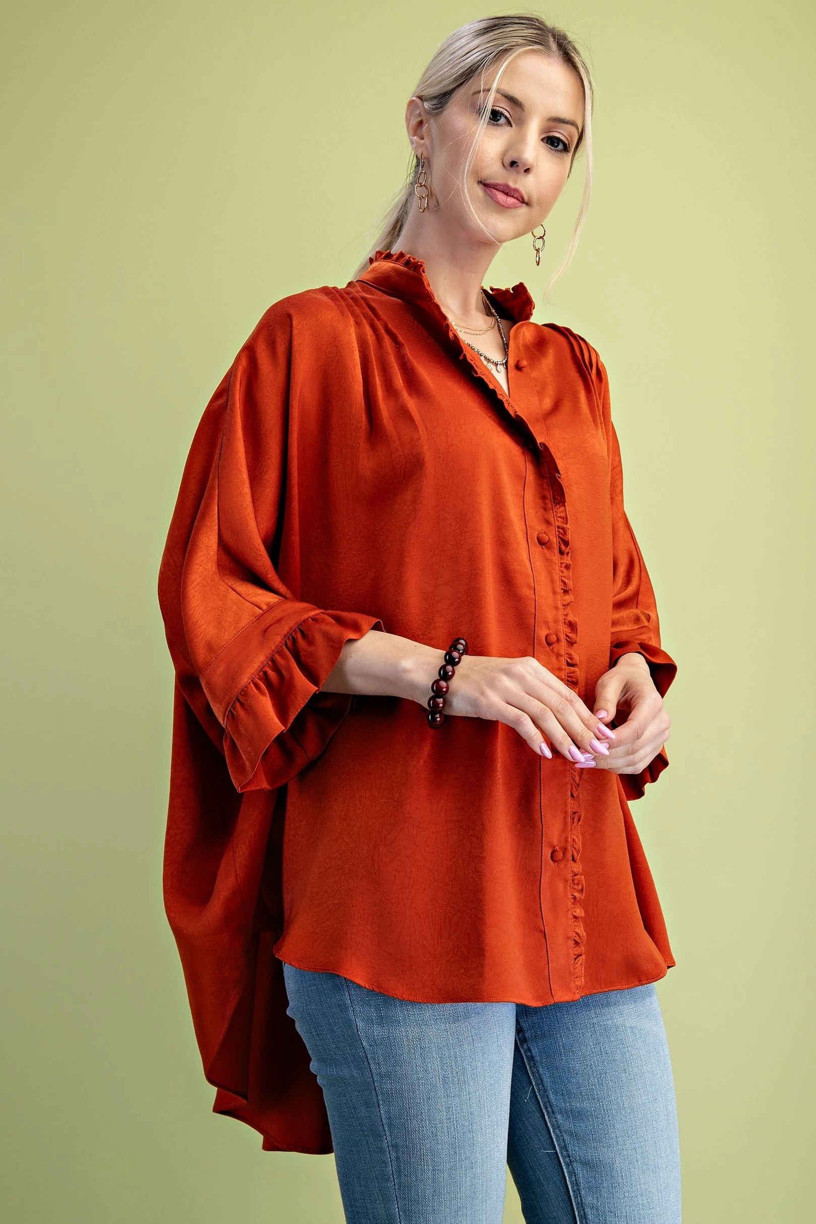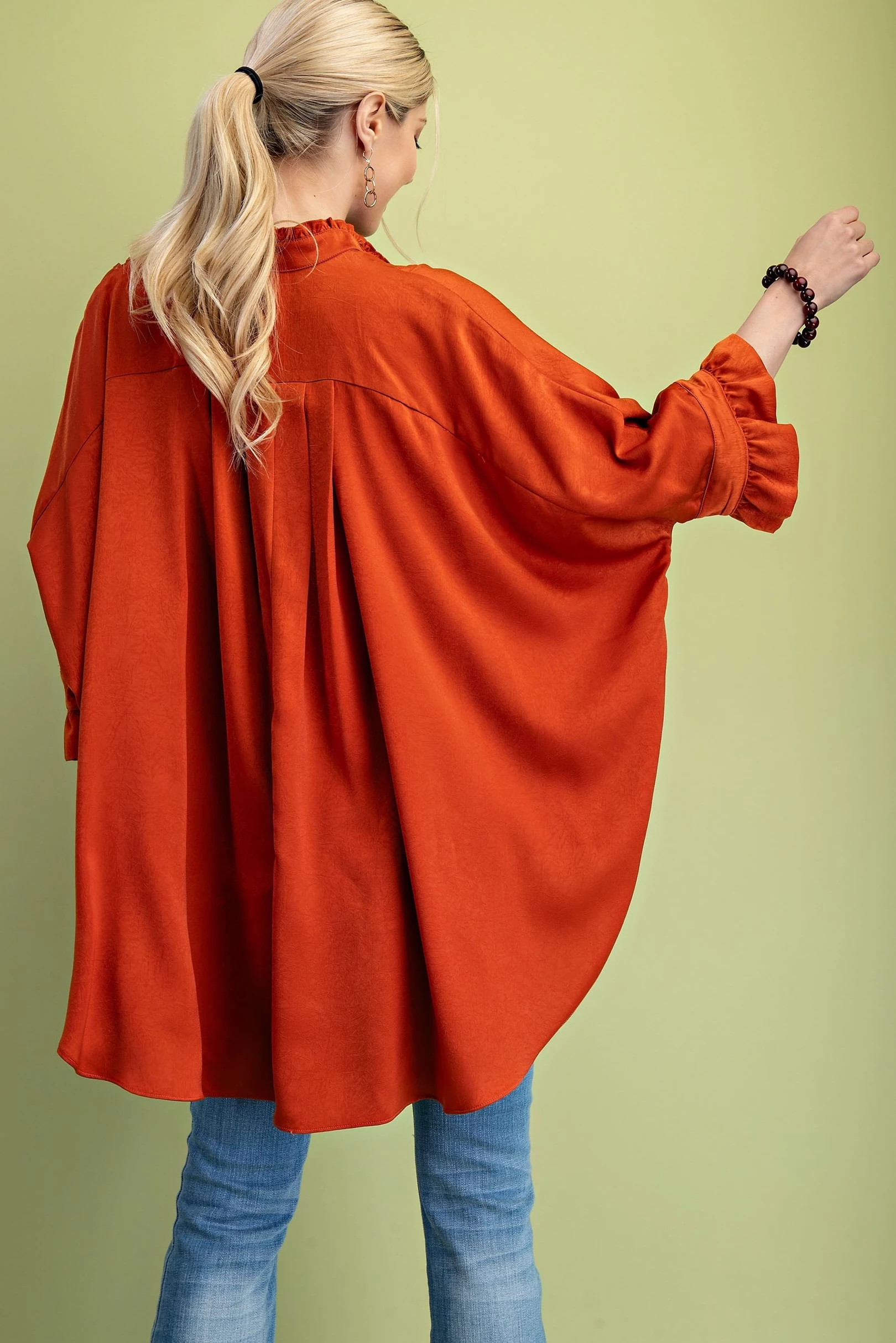 Ruffled Satin Button Down Blouse with a Detachable Neck Tie and Pintuck Details