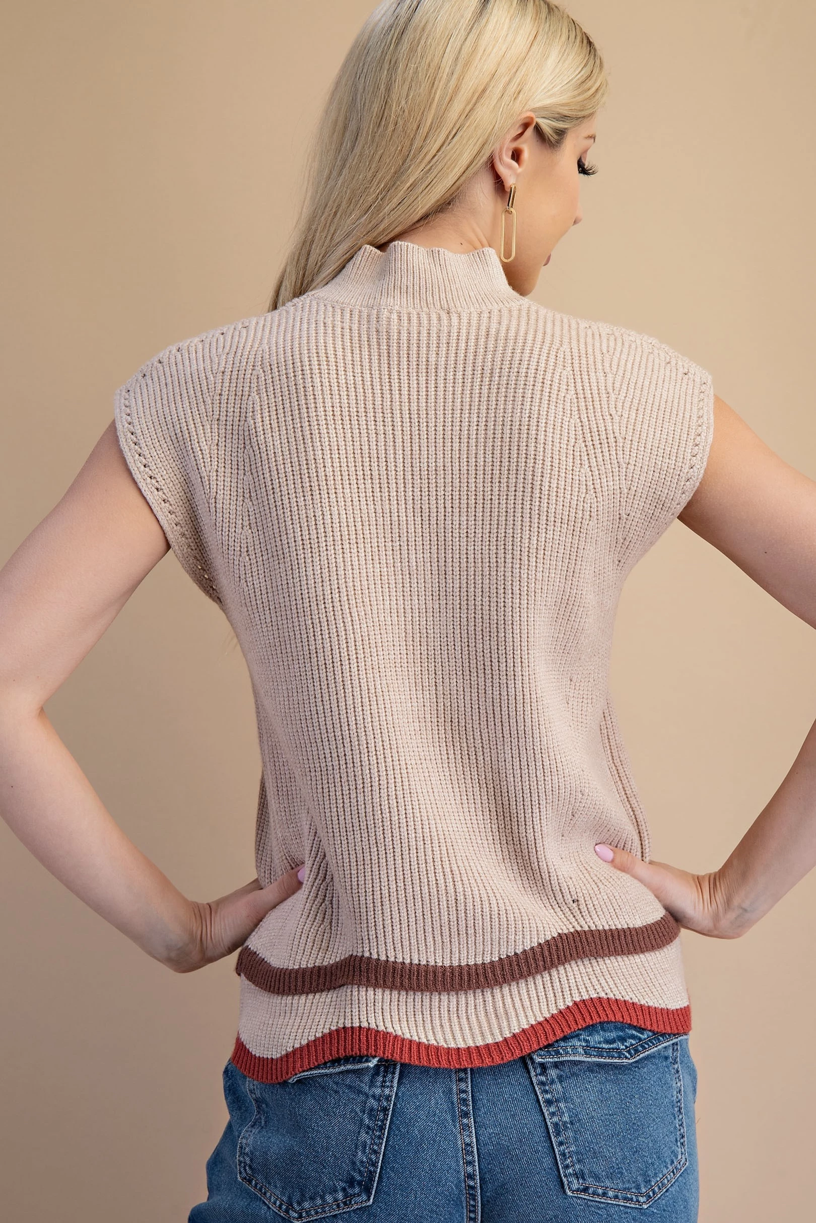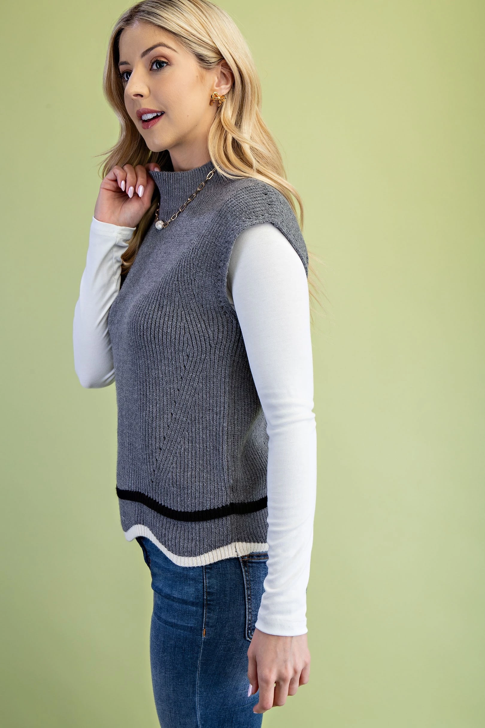Mock Neck Knit Sweater Vest with Contrasting Boarder Details and a Wavy Hem