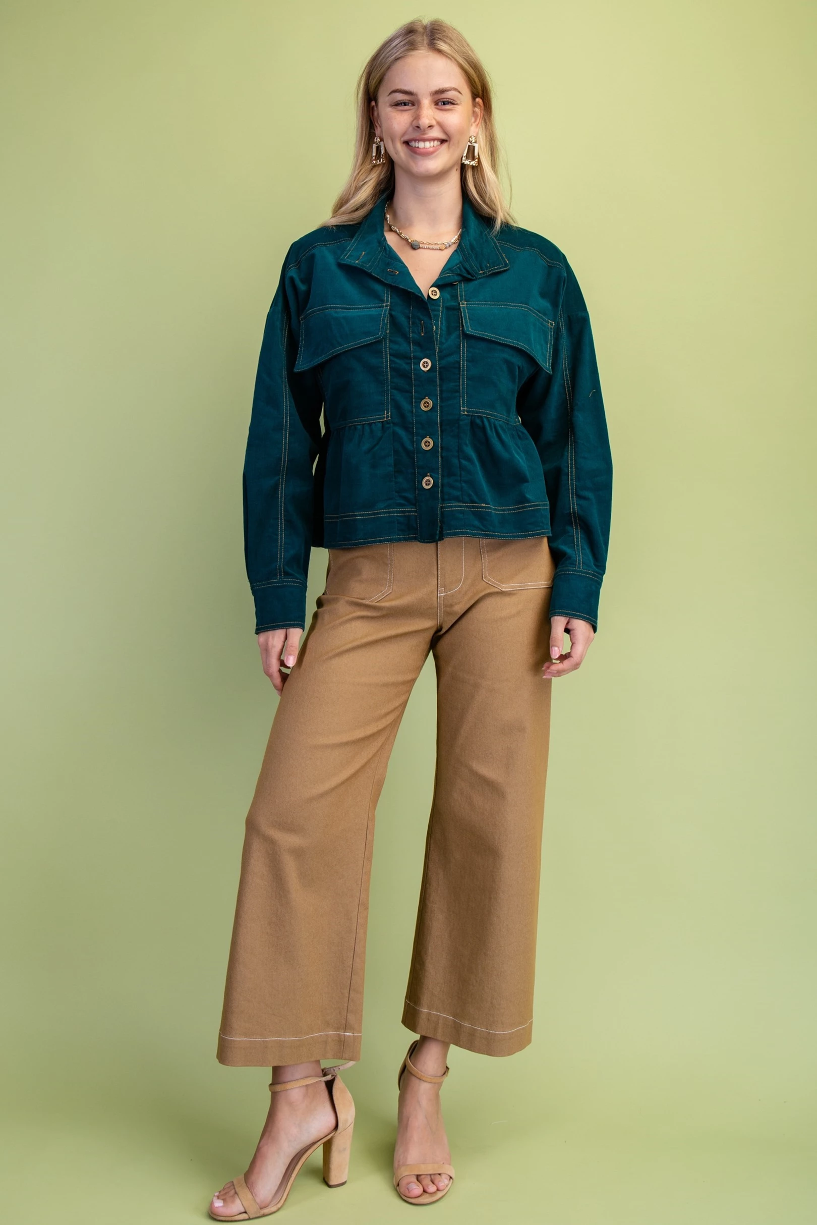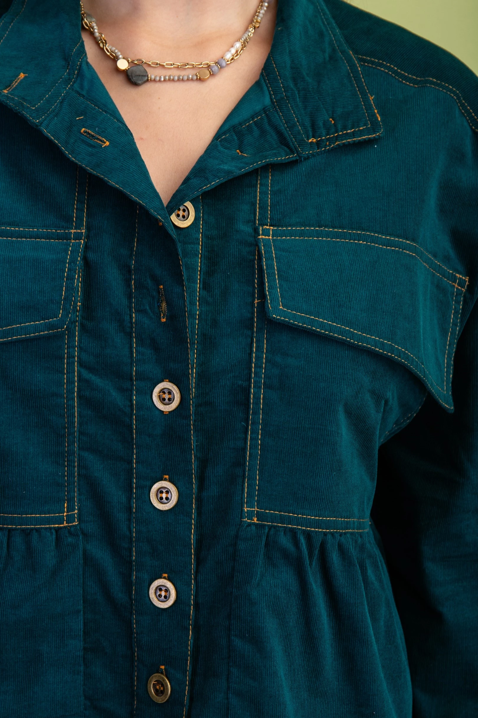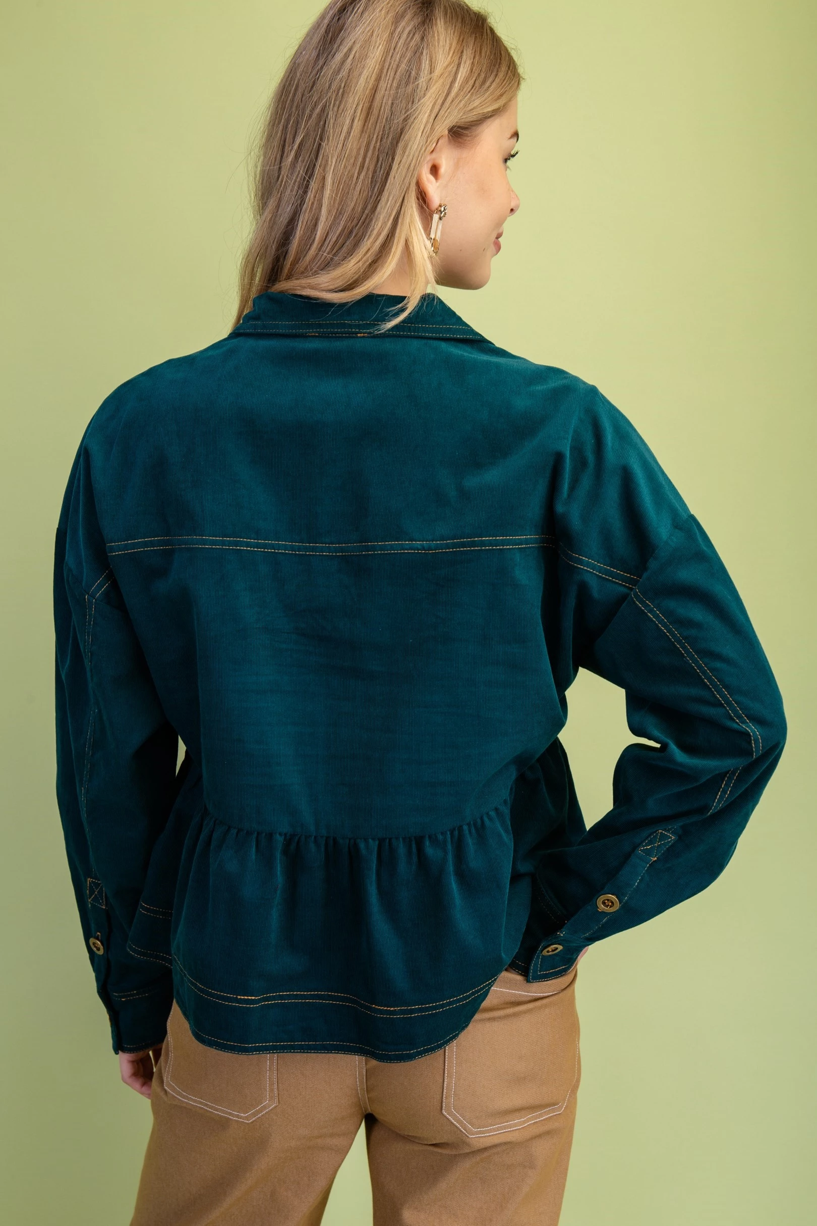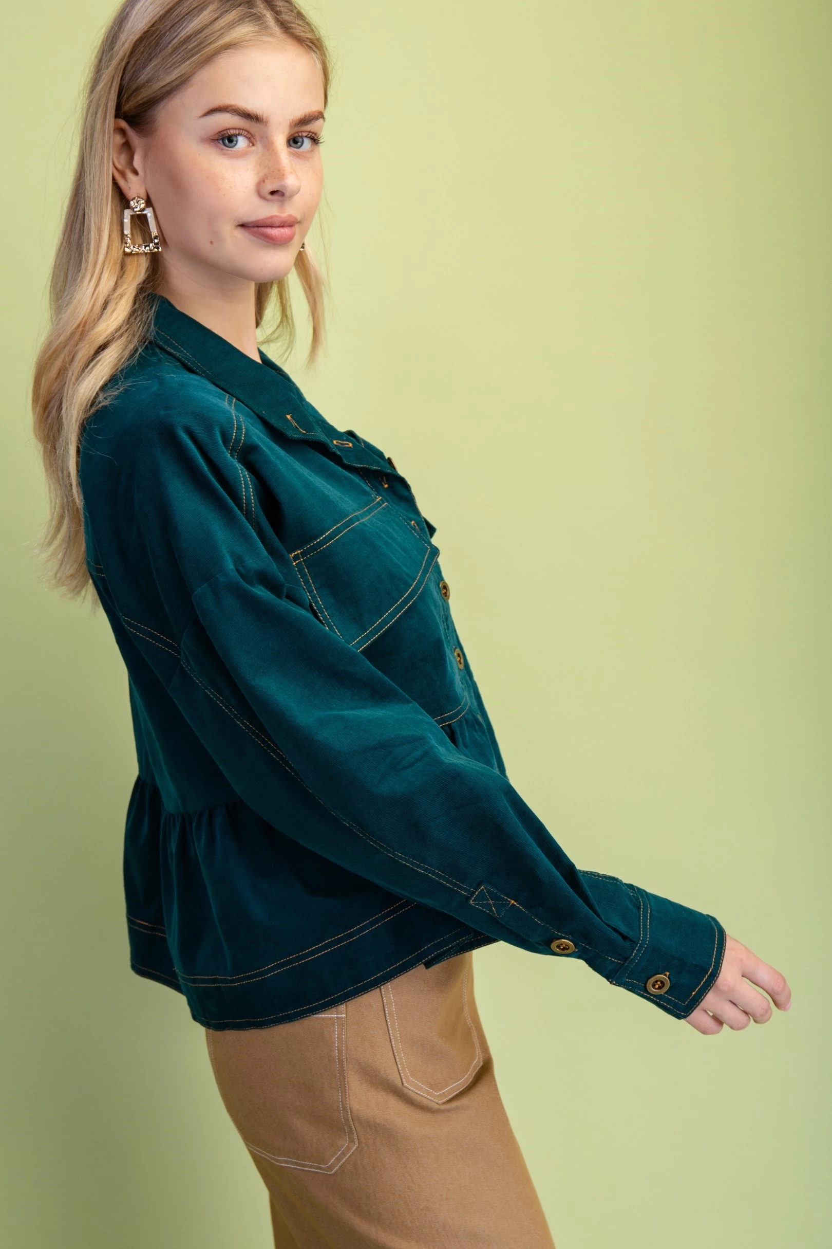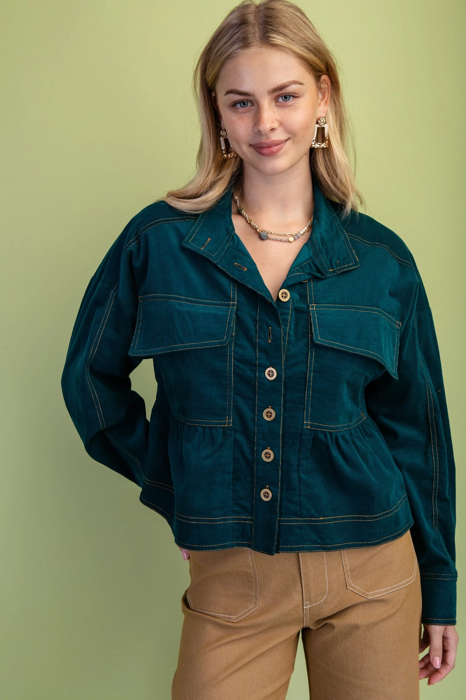 Corduroy Babydoll Style Button Up Jacket with a Mock Neck and Stitching Details