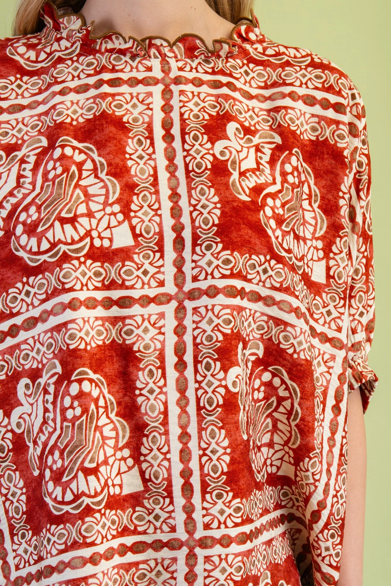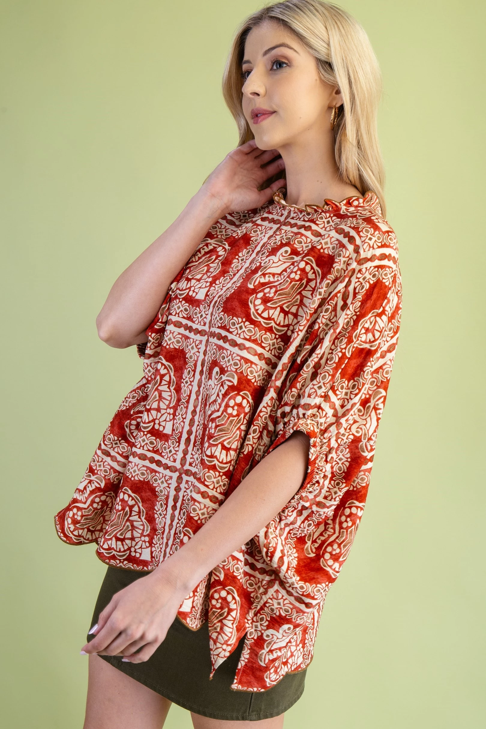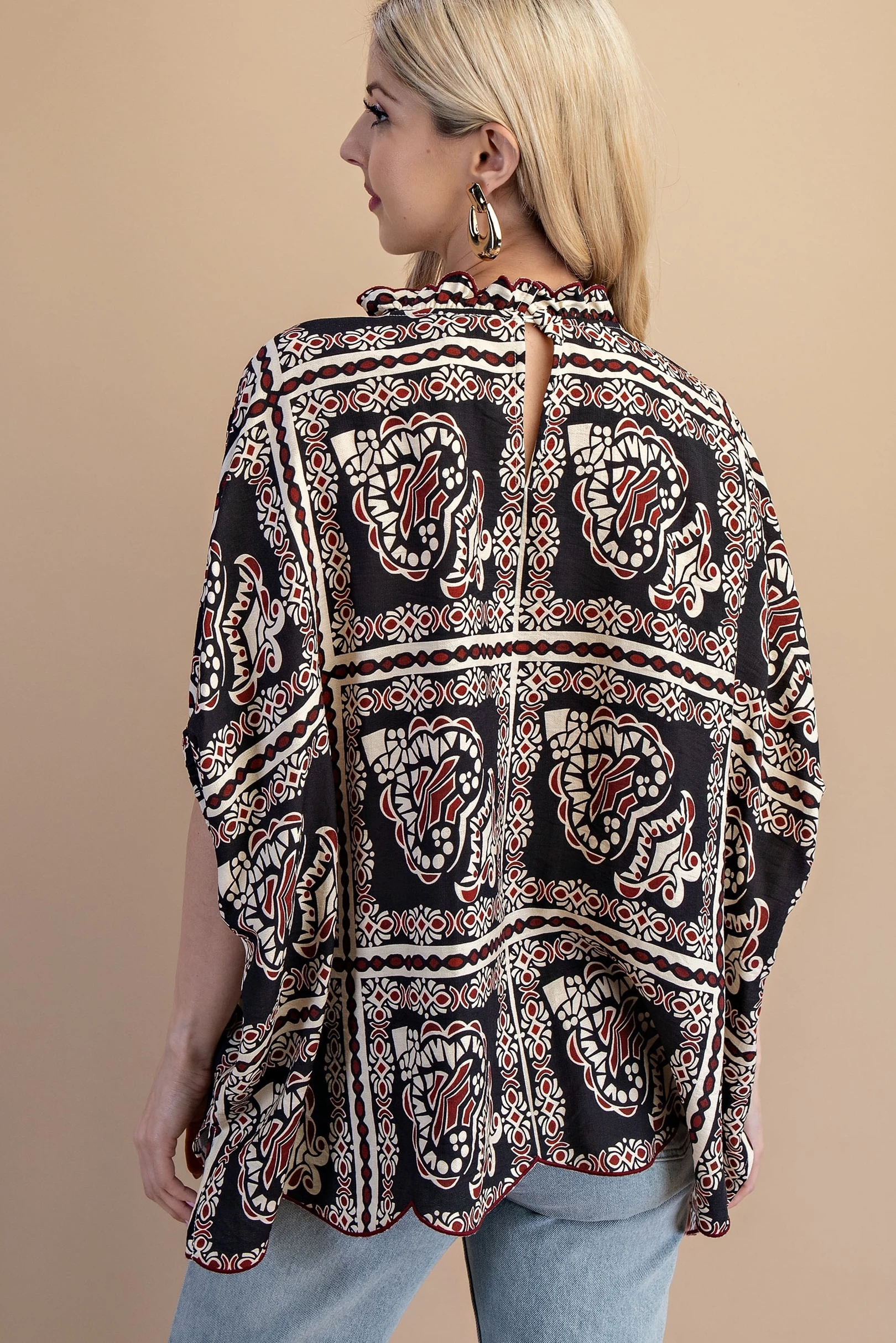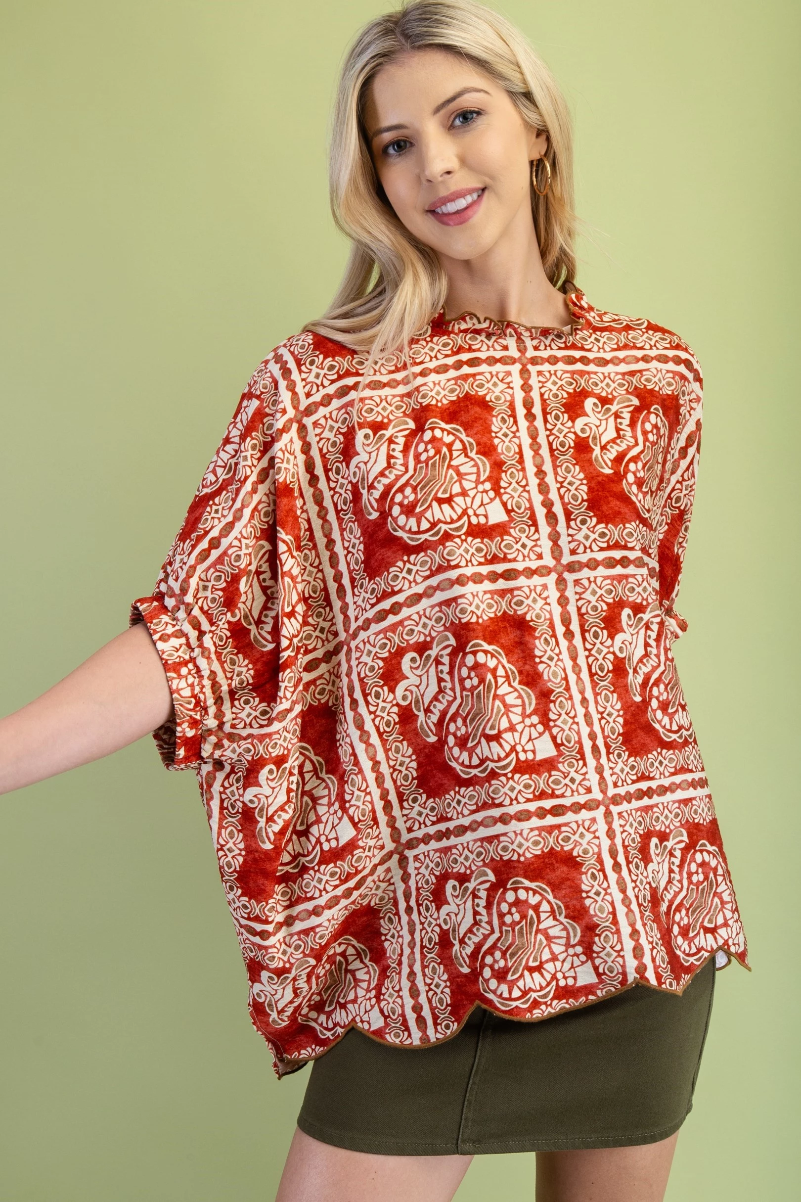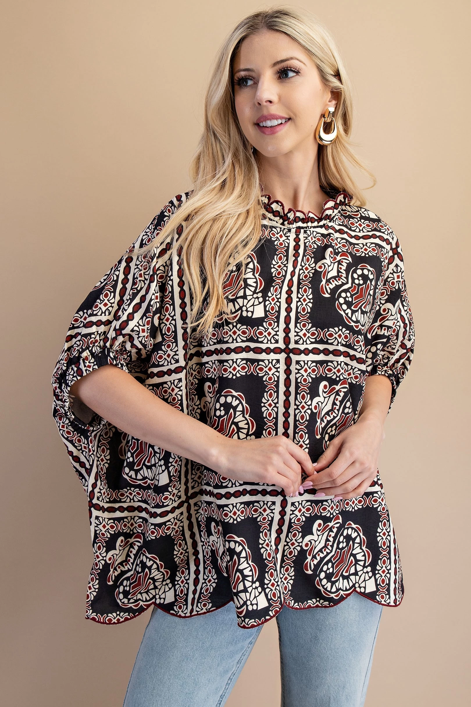 Printed Dolman Sleeve Blouse with a Scalloped Hem and Neck
