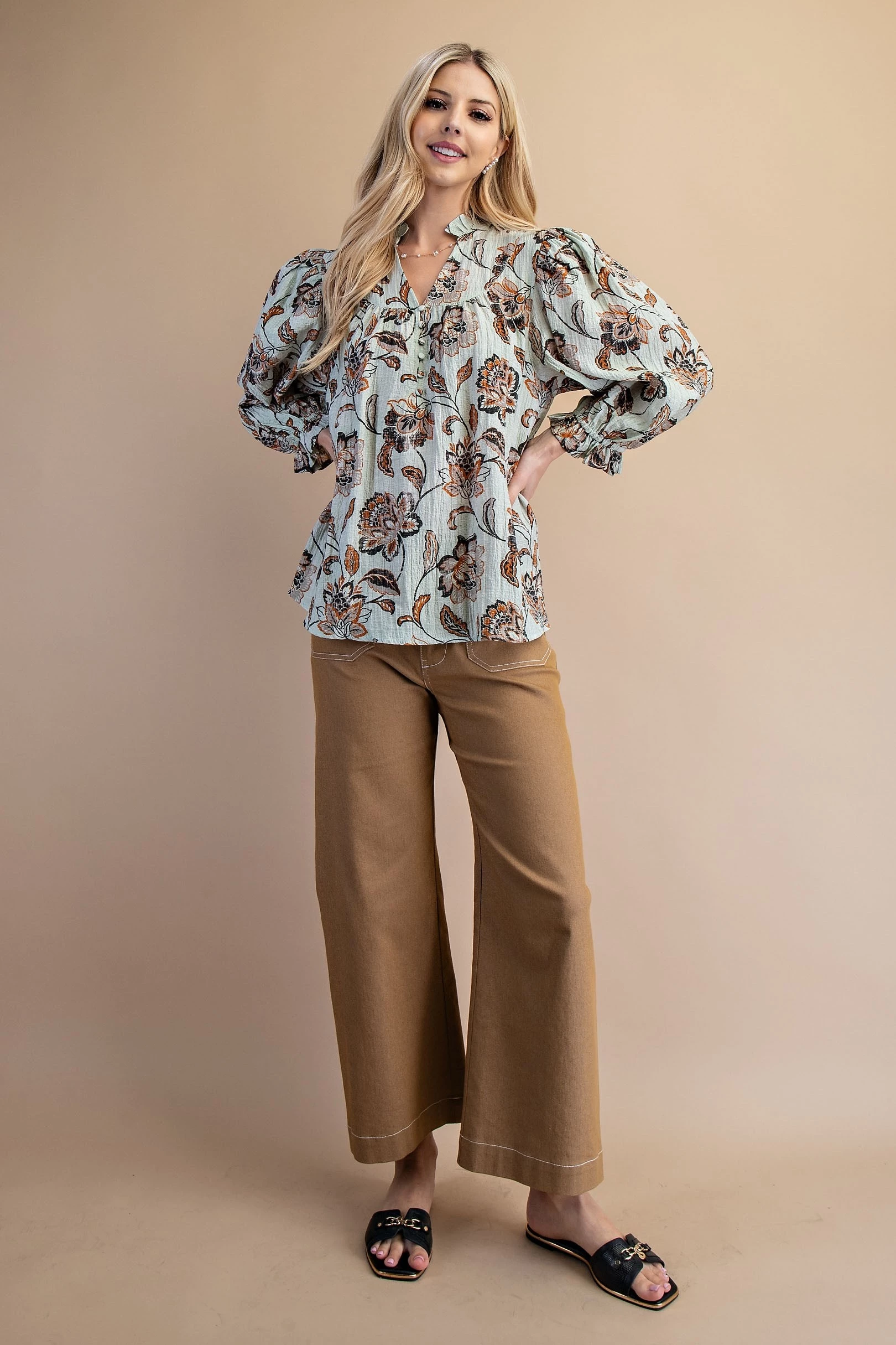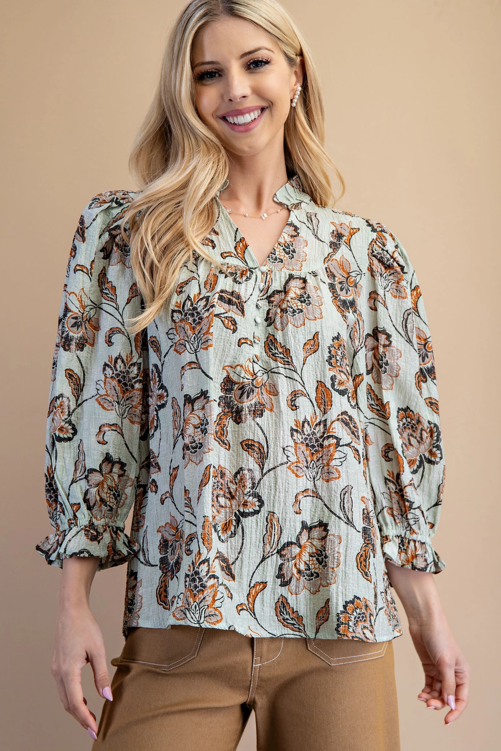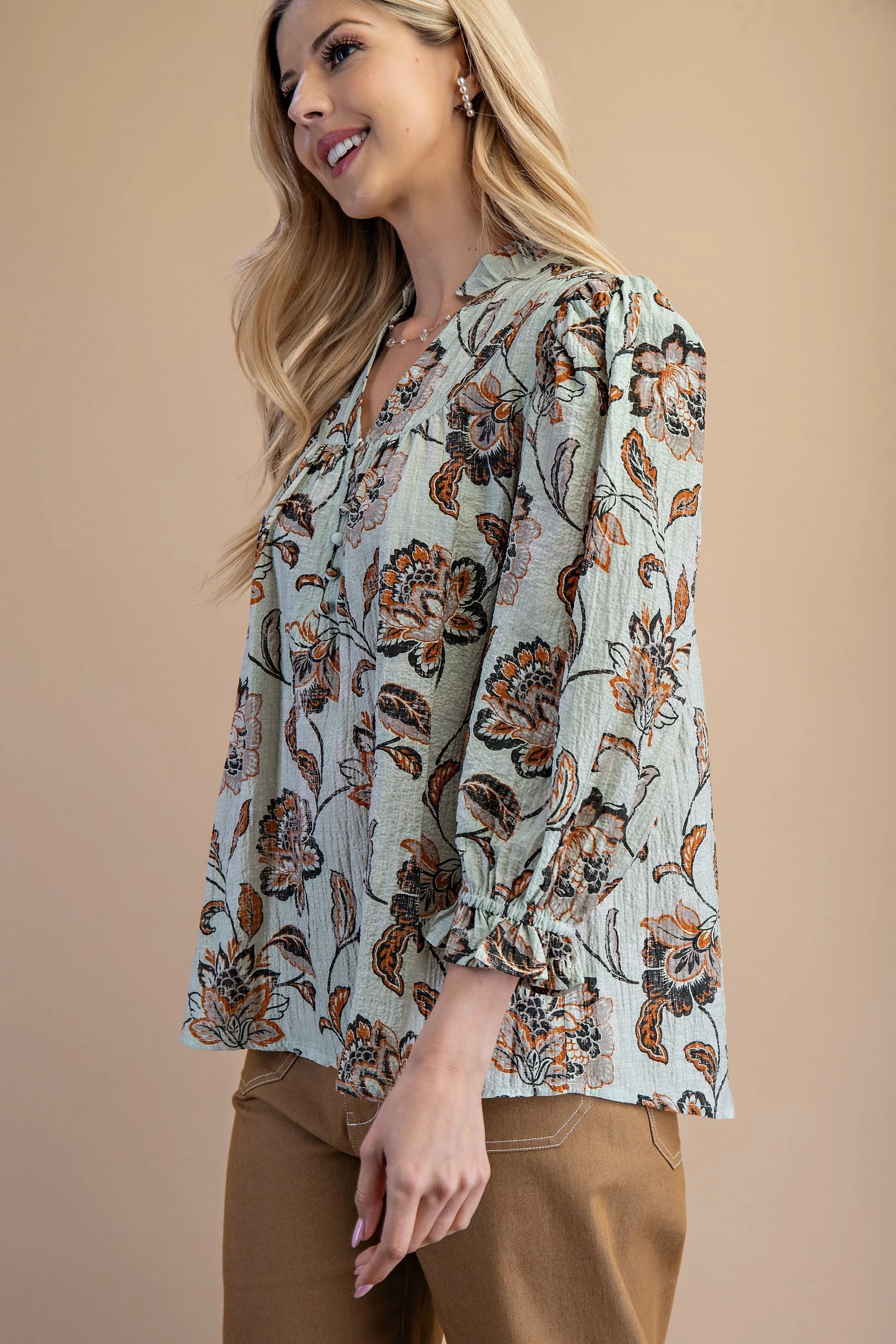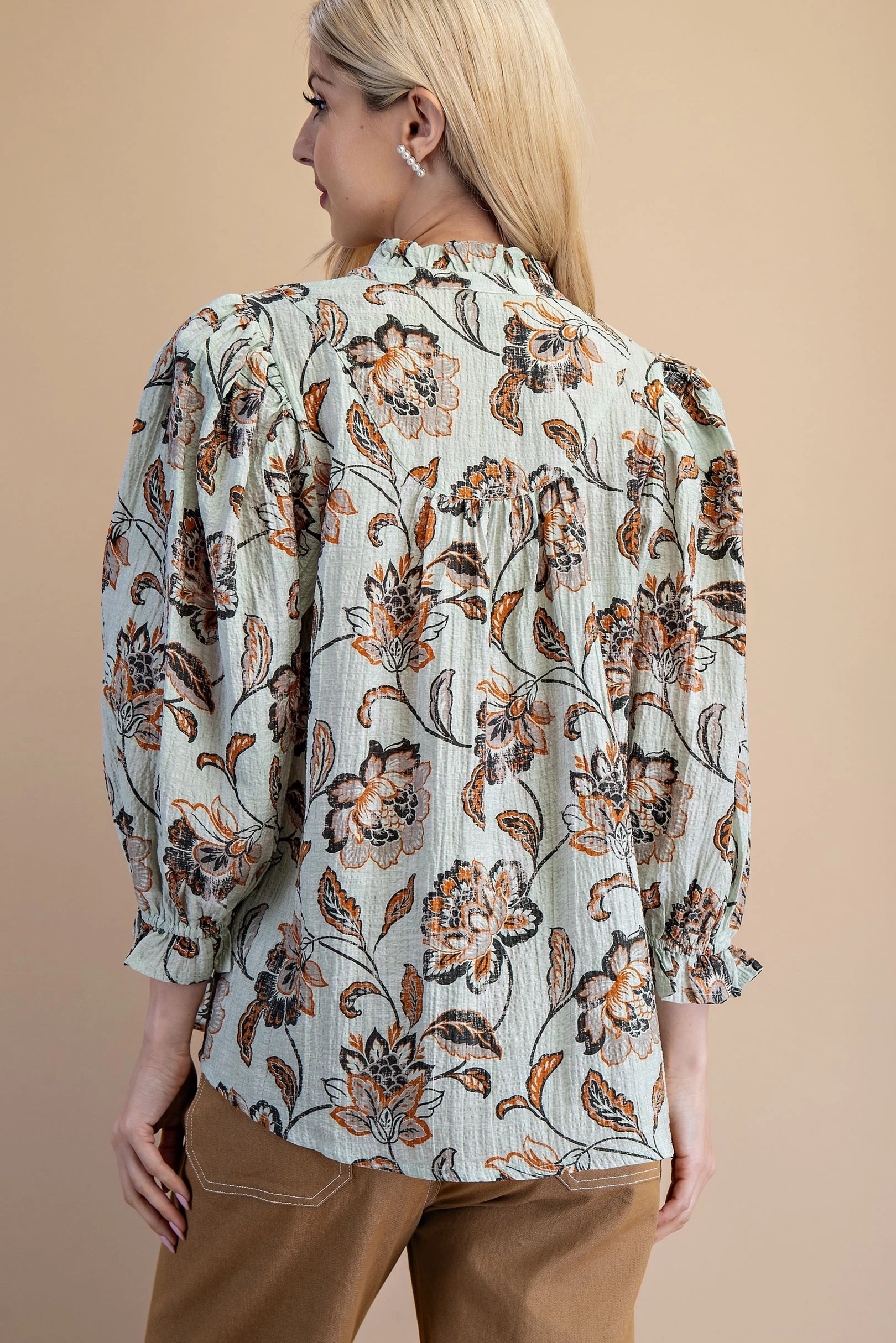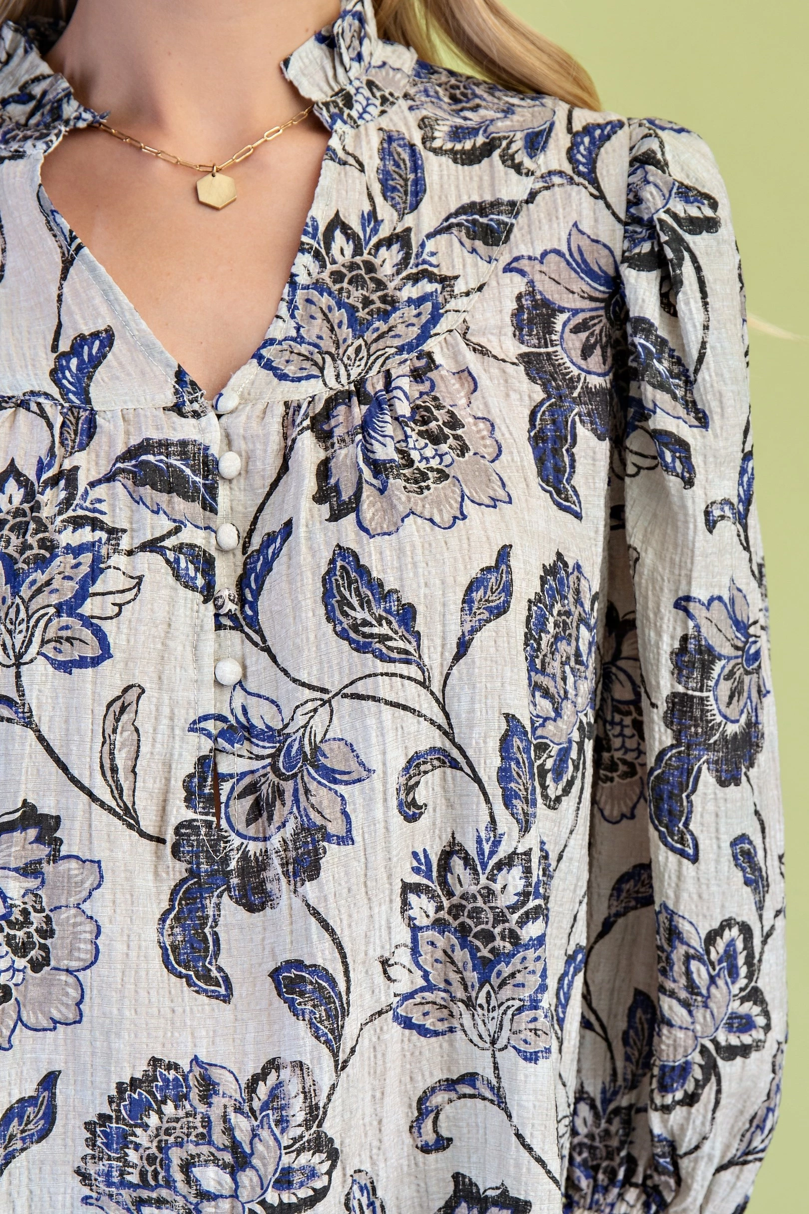 Vintage Floral Blouse with Covered Buttons and a Ruffled Collar