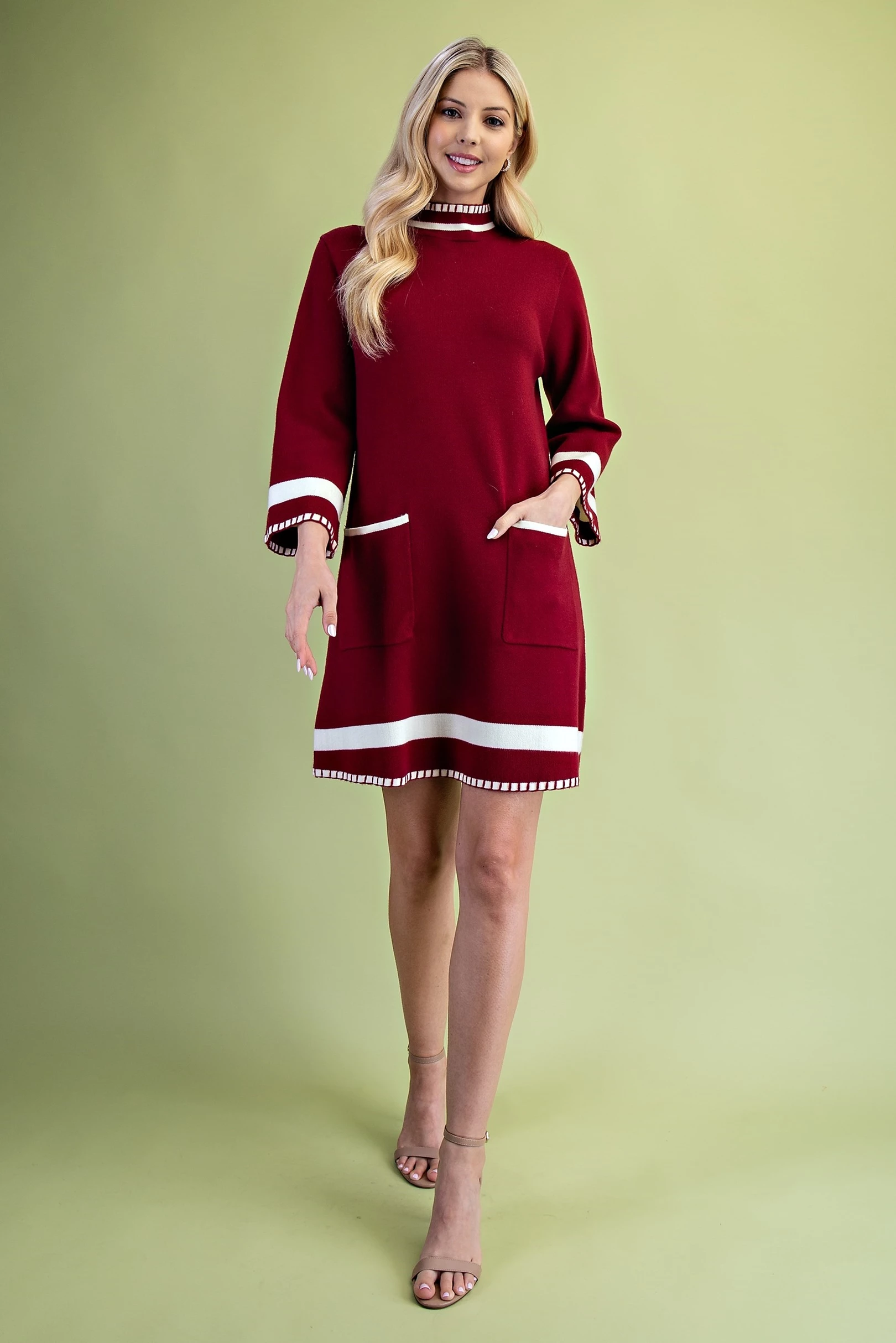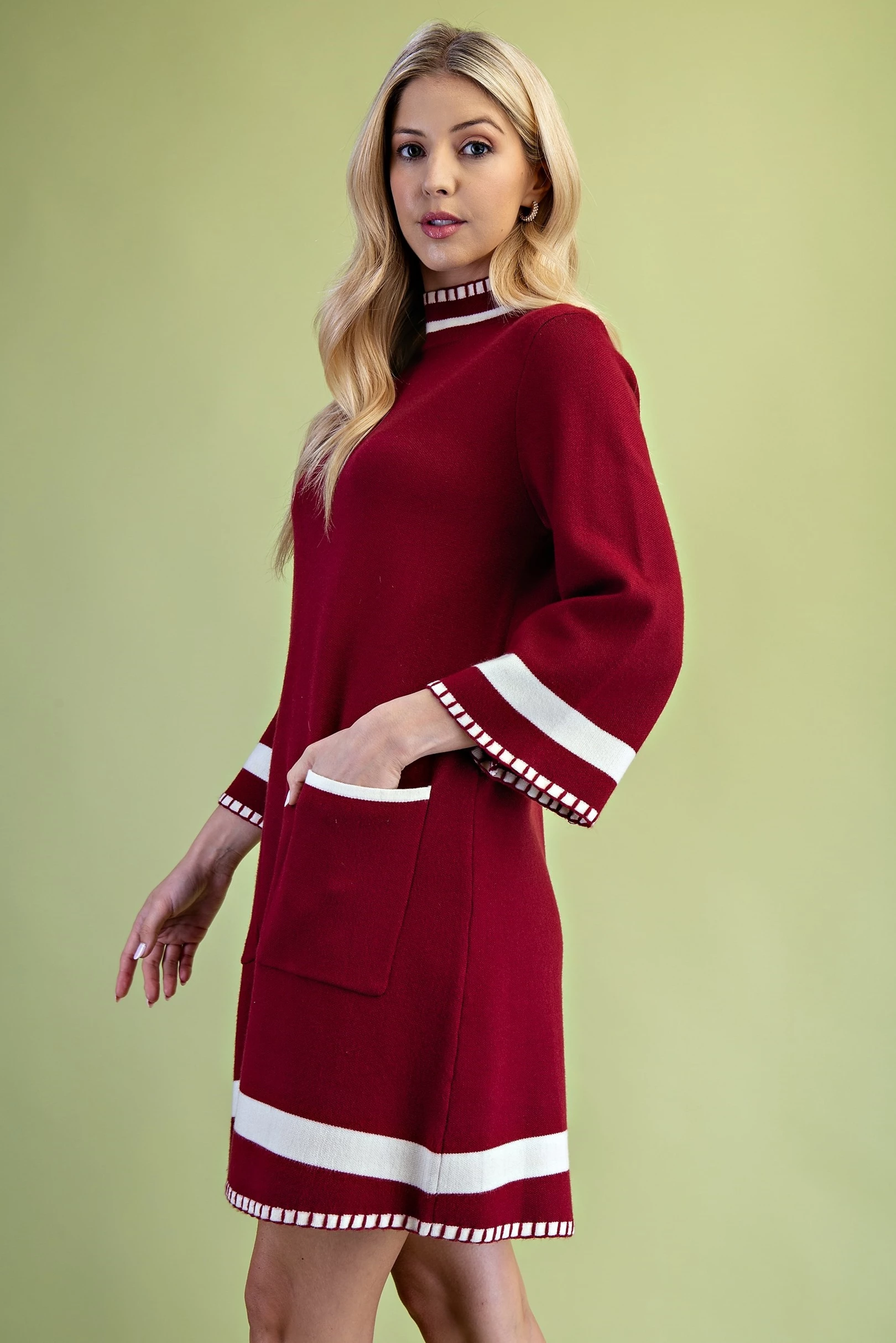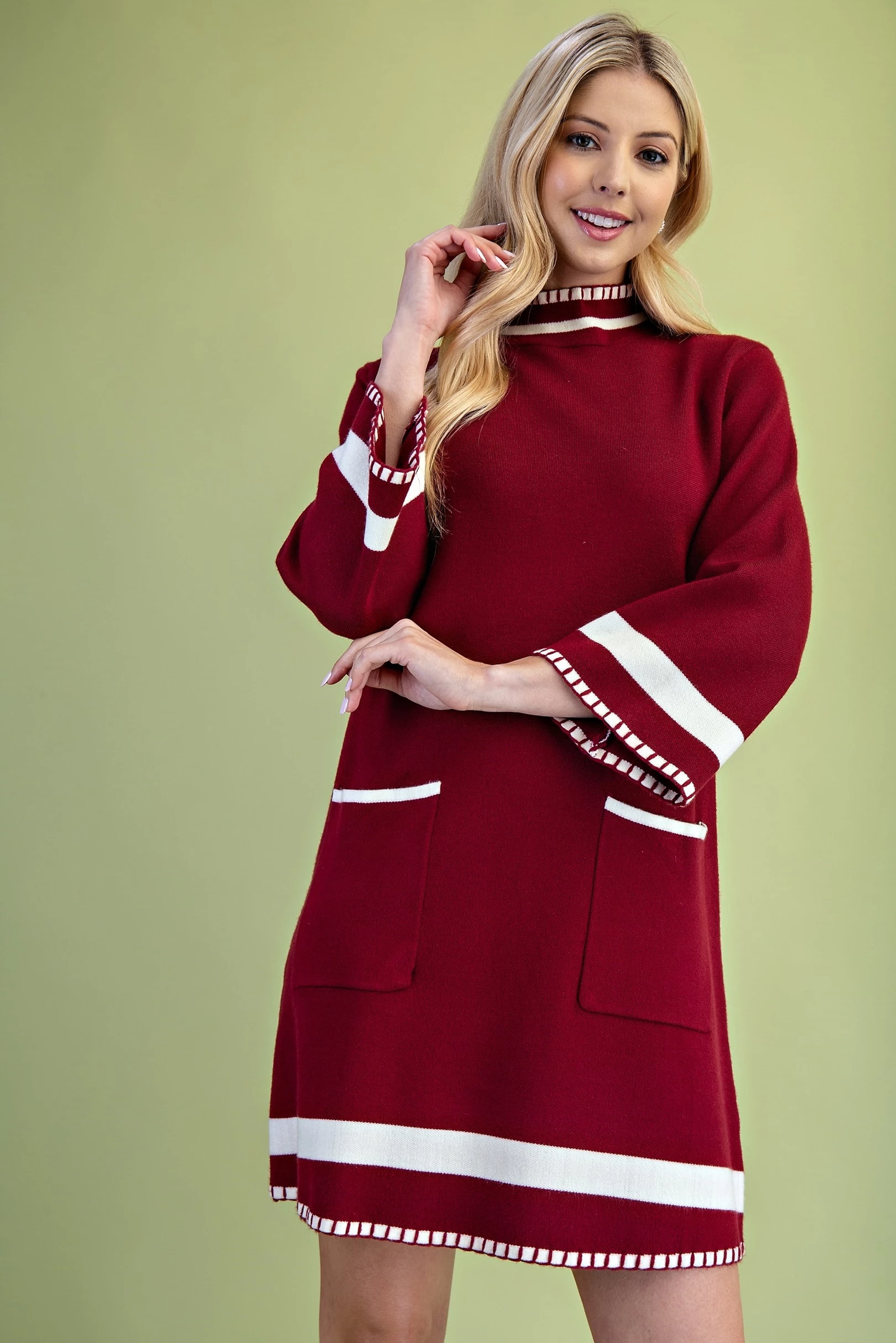 Color Blocked Mock Neck Sweater Dress with Back Button Closures and Stitched Hem Details