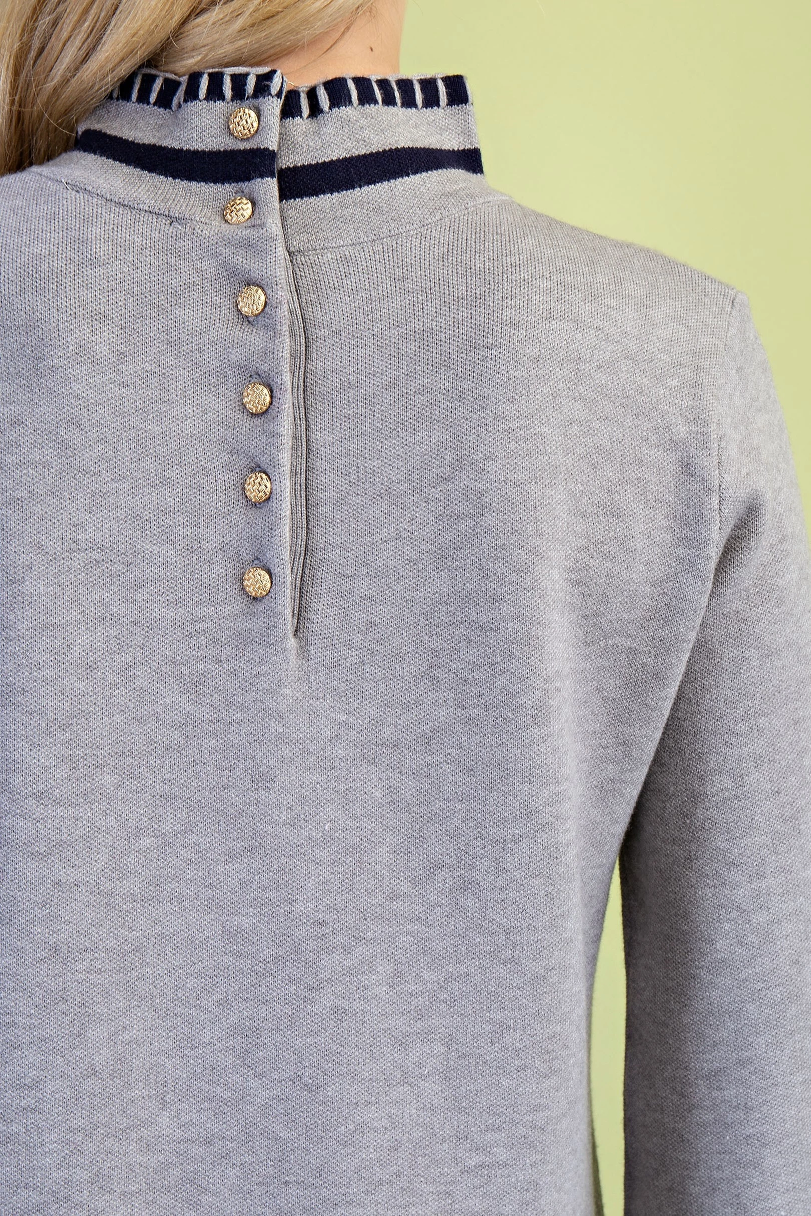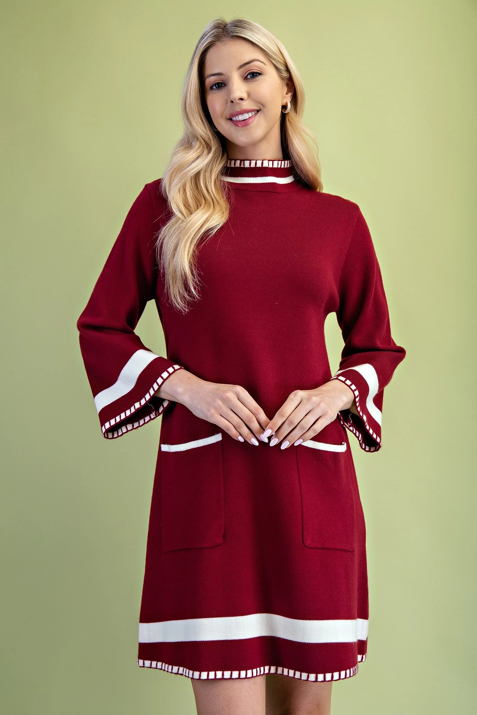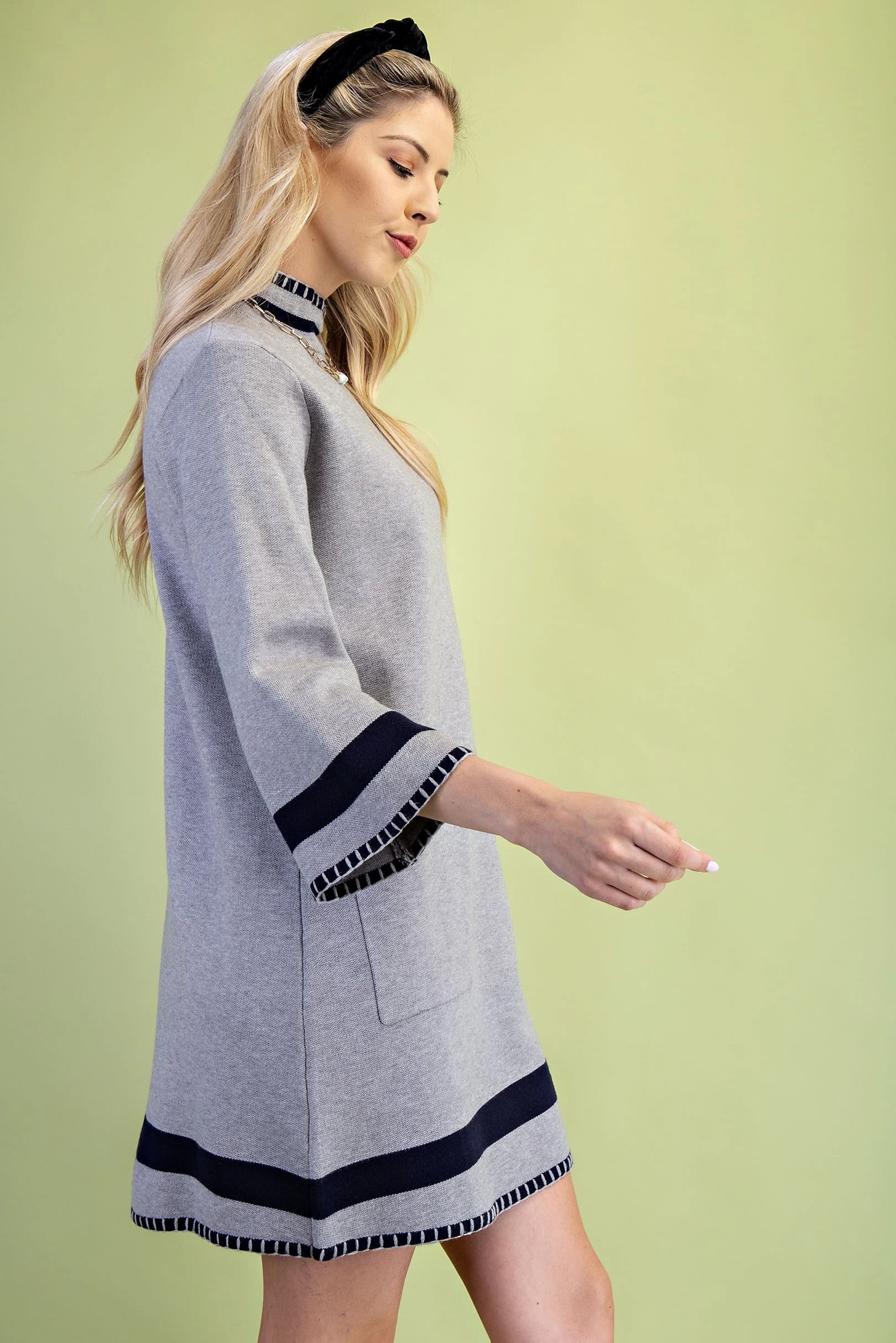 Color Blocked Mock Neck Sweater Dress with Back Button Closures and Stitched Hem Details