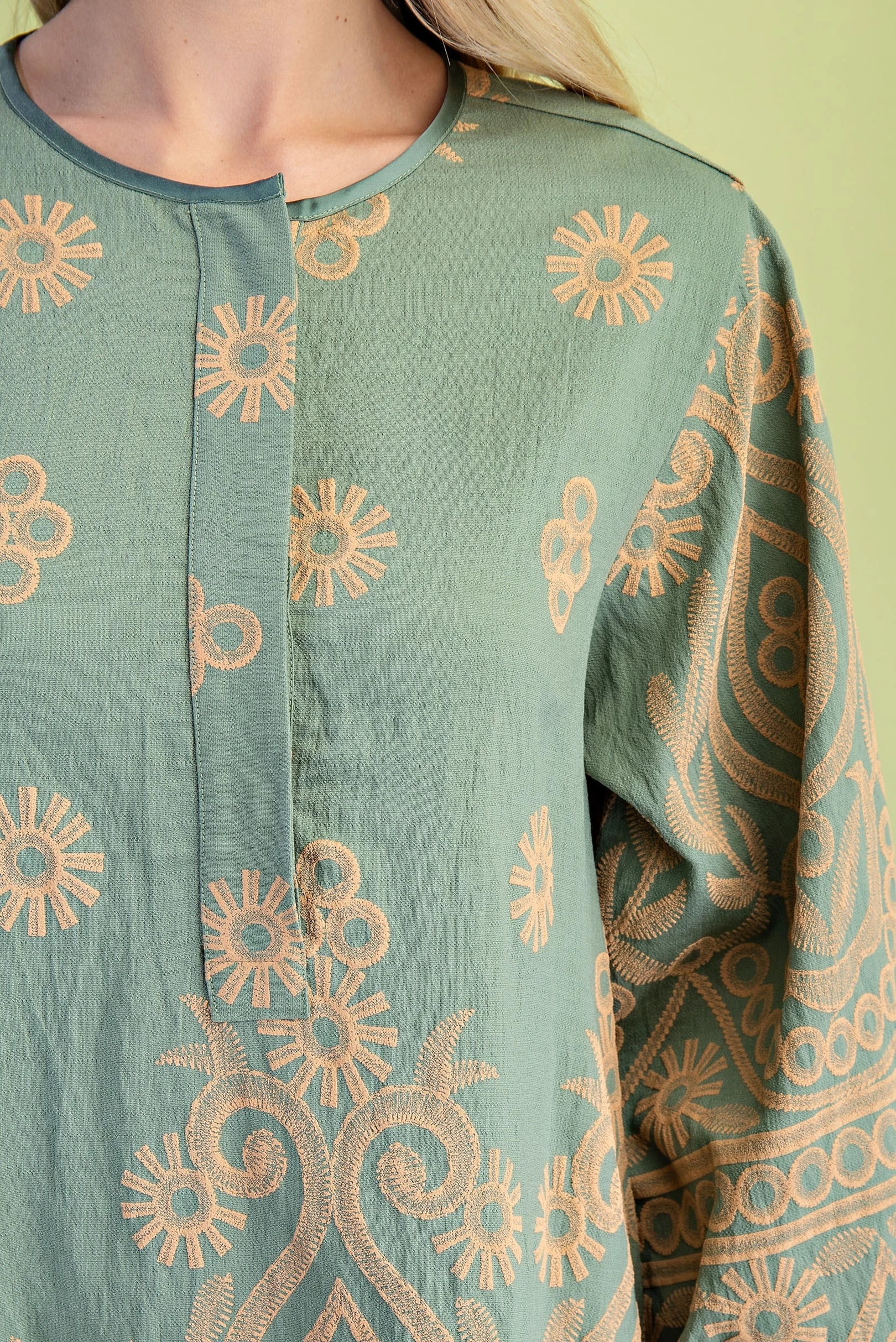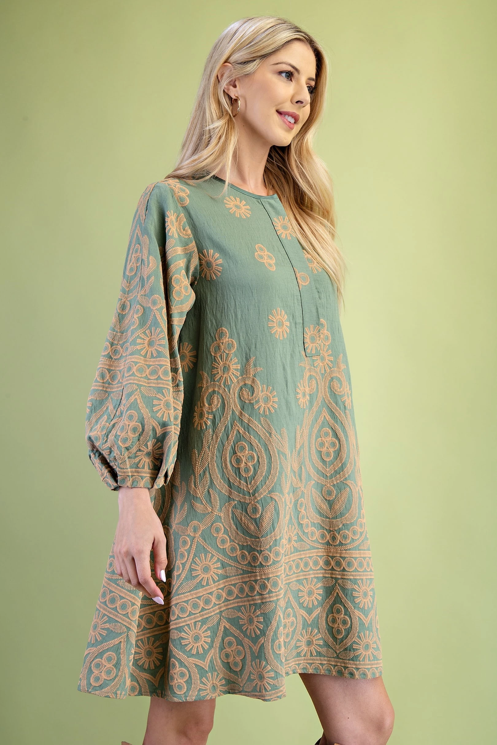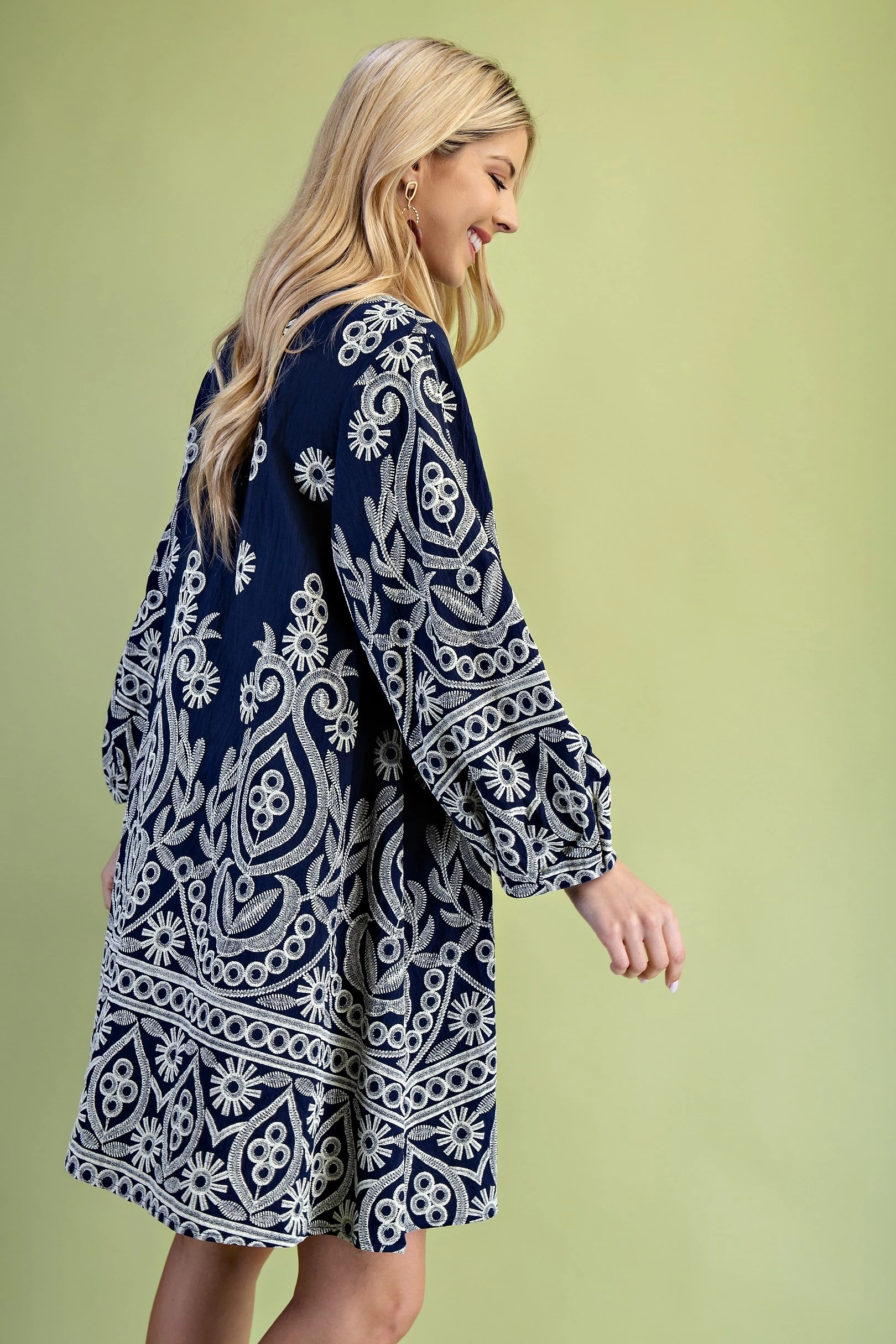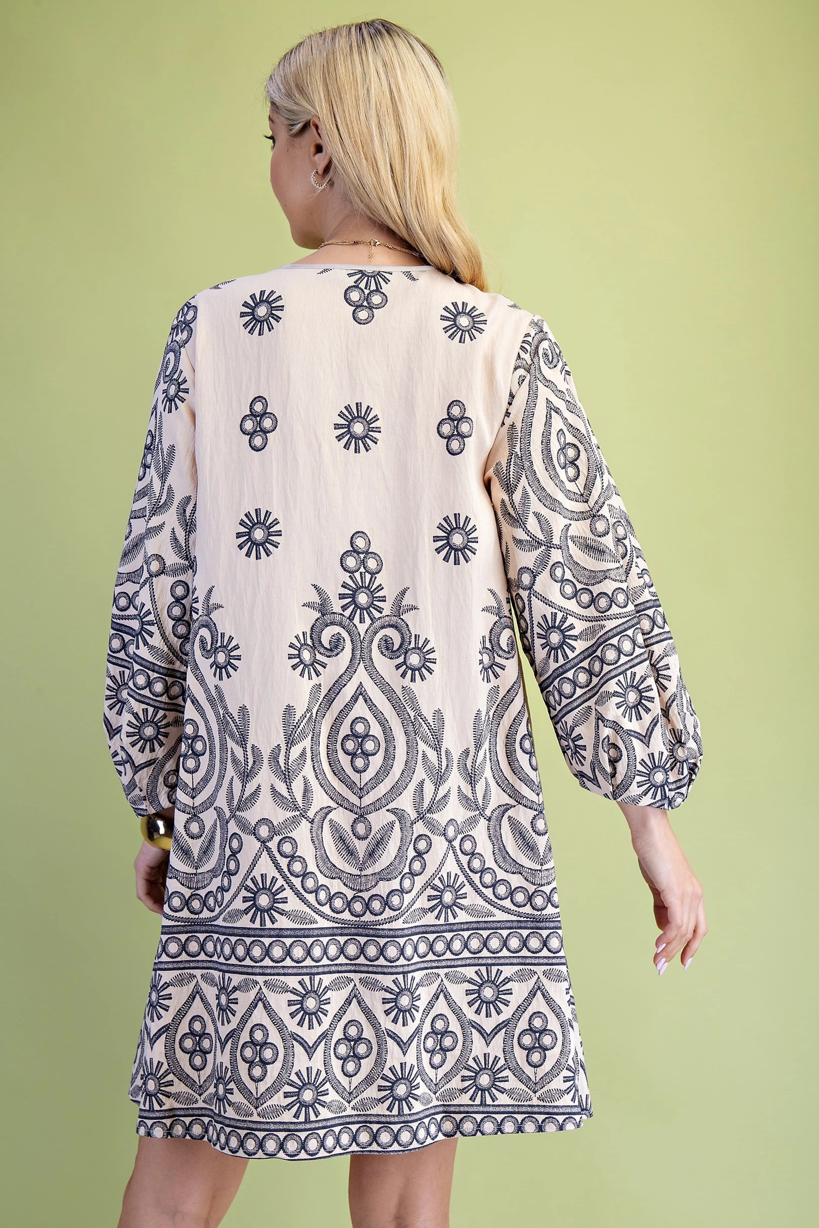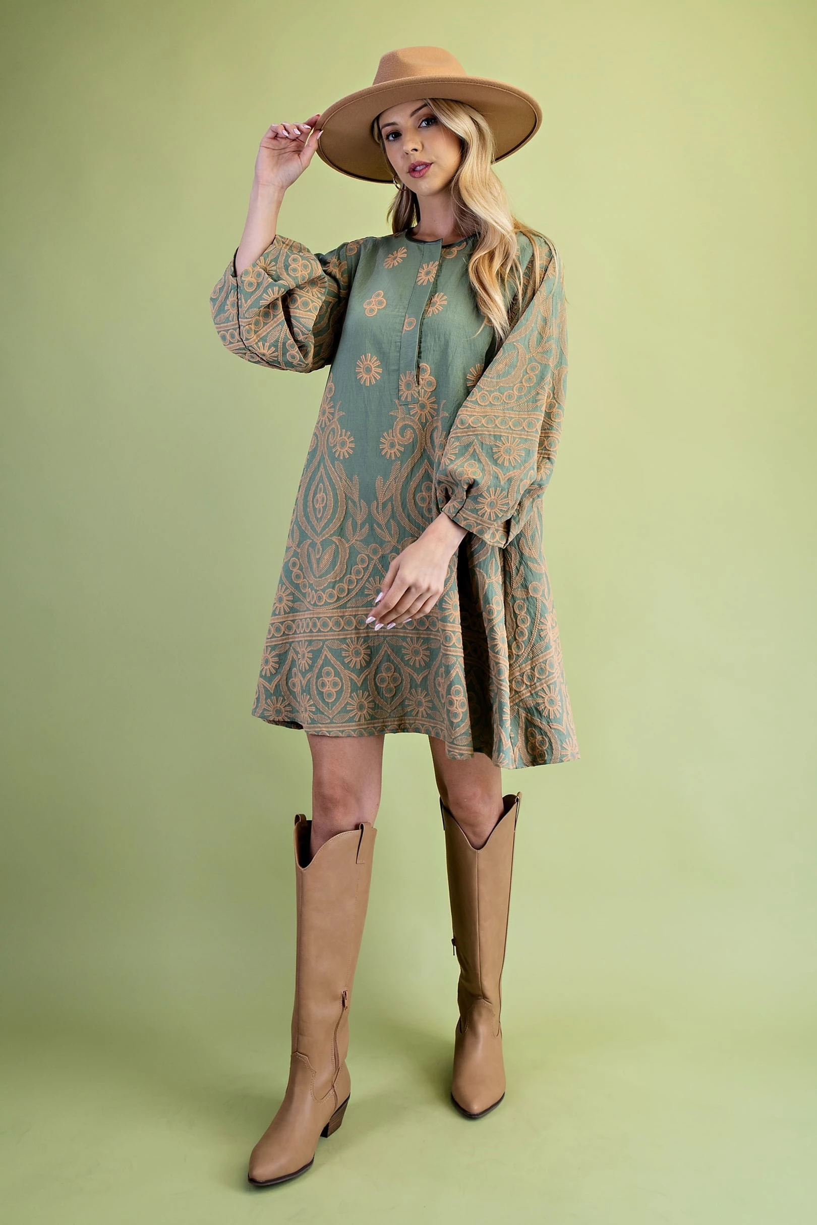 Textured Print Mini Dress with Pleated Long Sleeves and Half Buttons Covered by Placket